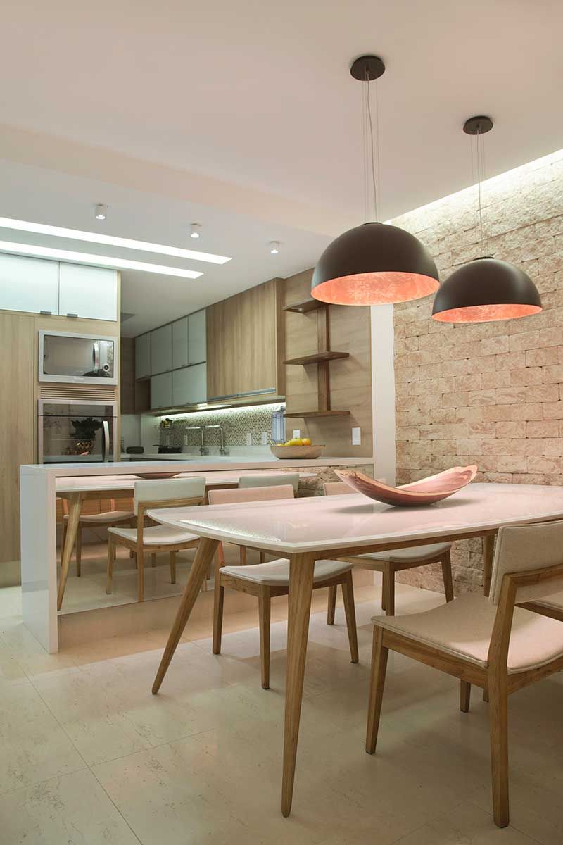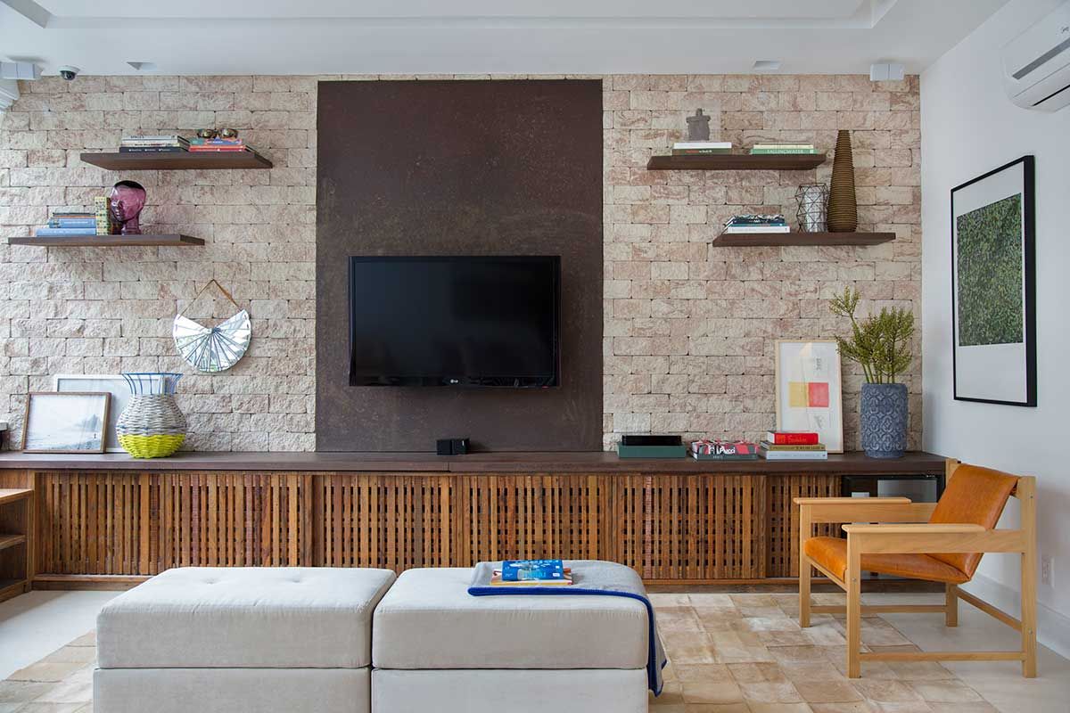 Na sala, a marcenaria é feita em peroba proveniente de madeira de demolição e aço corten, compondo o rack, o painel da TV e o longo banco sob a janela, que acumula ainda a função de armazenamento. Já a cozinha é em conceito aberto, integrada à sala de jantar, onde se destaca a parede de tijolinhos.