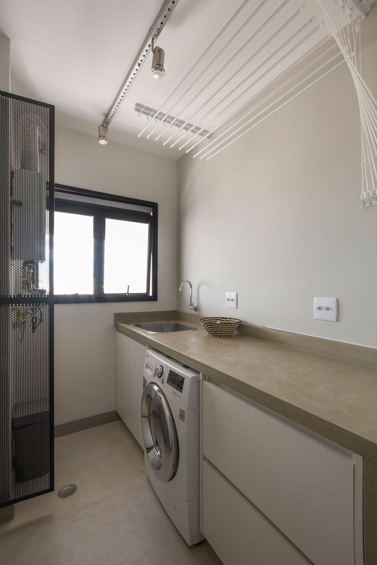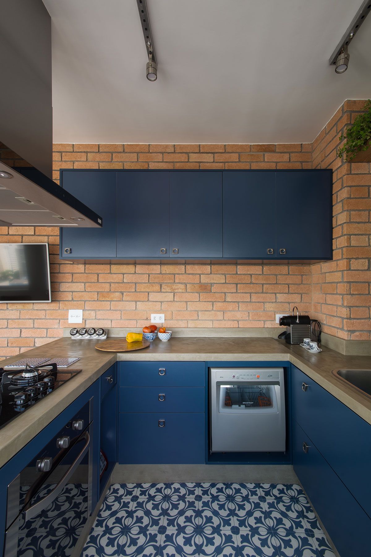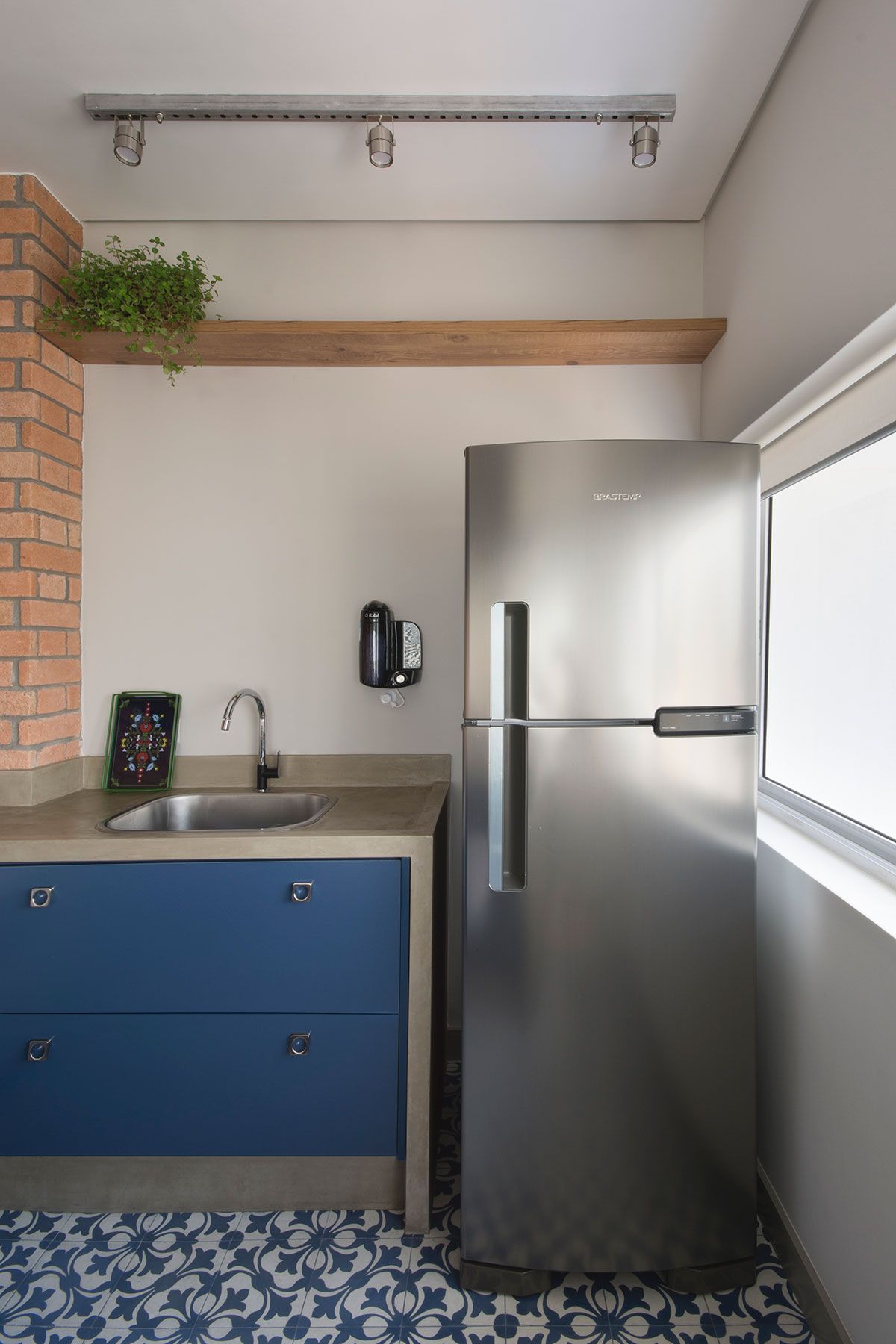 Na cozinha, a marcenaria azul, com o tijolinho e a bancada em concreto armado com acabamento em cimento queimado deixam o ambiente ainda mais charmoso. A lavanderia foi feita bem clean, com bancada de concreto também, e para ocultar um pouco o aquecedor que chamava a atenção, foi feito um pequeno painel de tela perfurada.