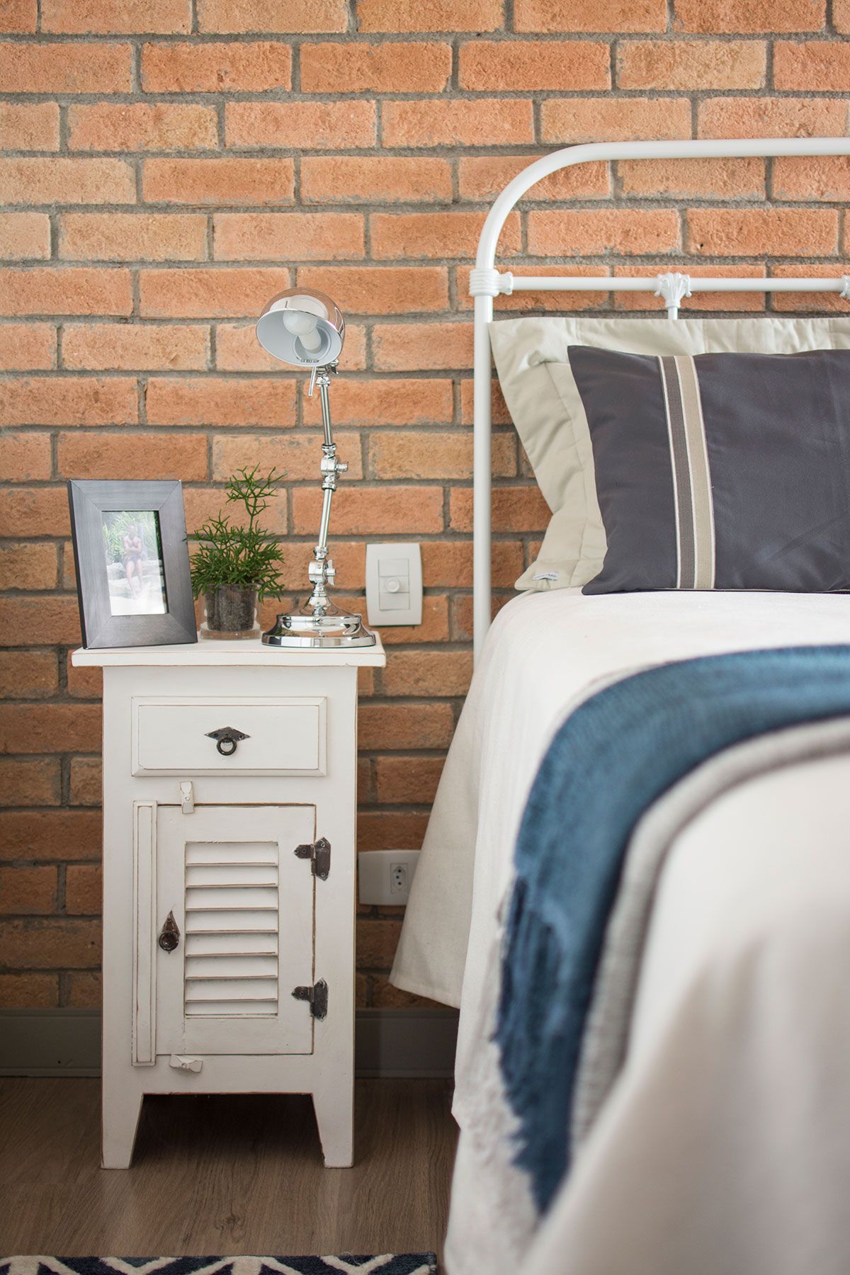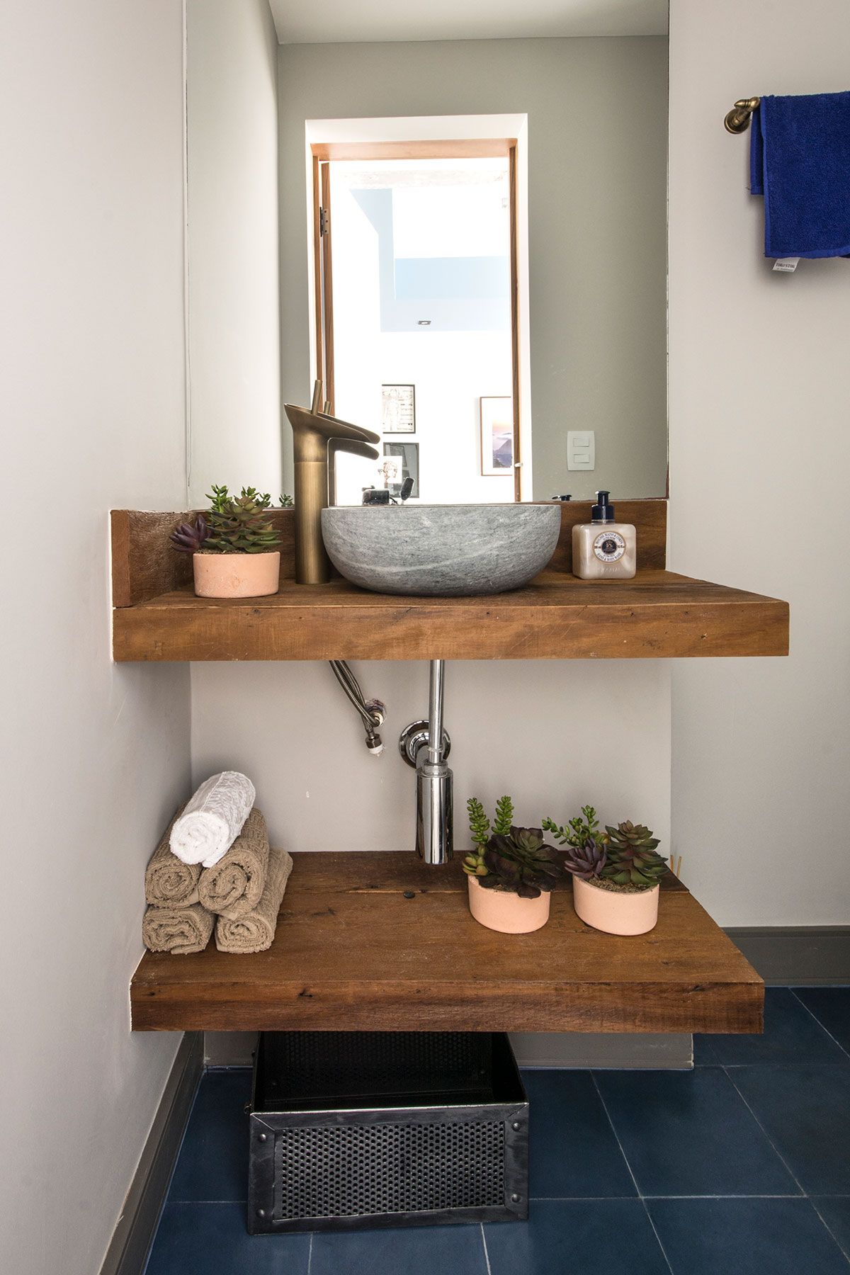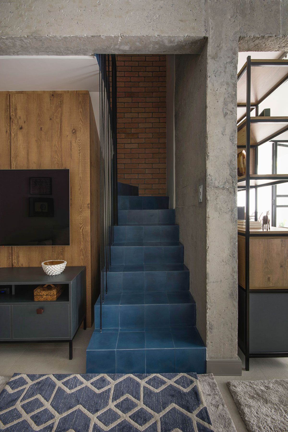 Na cozinha, a marcenaria azul, com o tijolinho e a bancada em concreto armado com acabamento em cimento queimado deixam o ambiente ainda mais charmoso. A lavanderia foi feita bem clean, com bancada de concreto também, e para ocultar um pouco o aquecedor que chamava a atenção, foi feito um pequeno painel de tela perfurada.