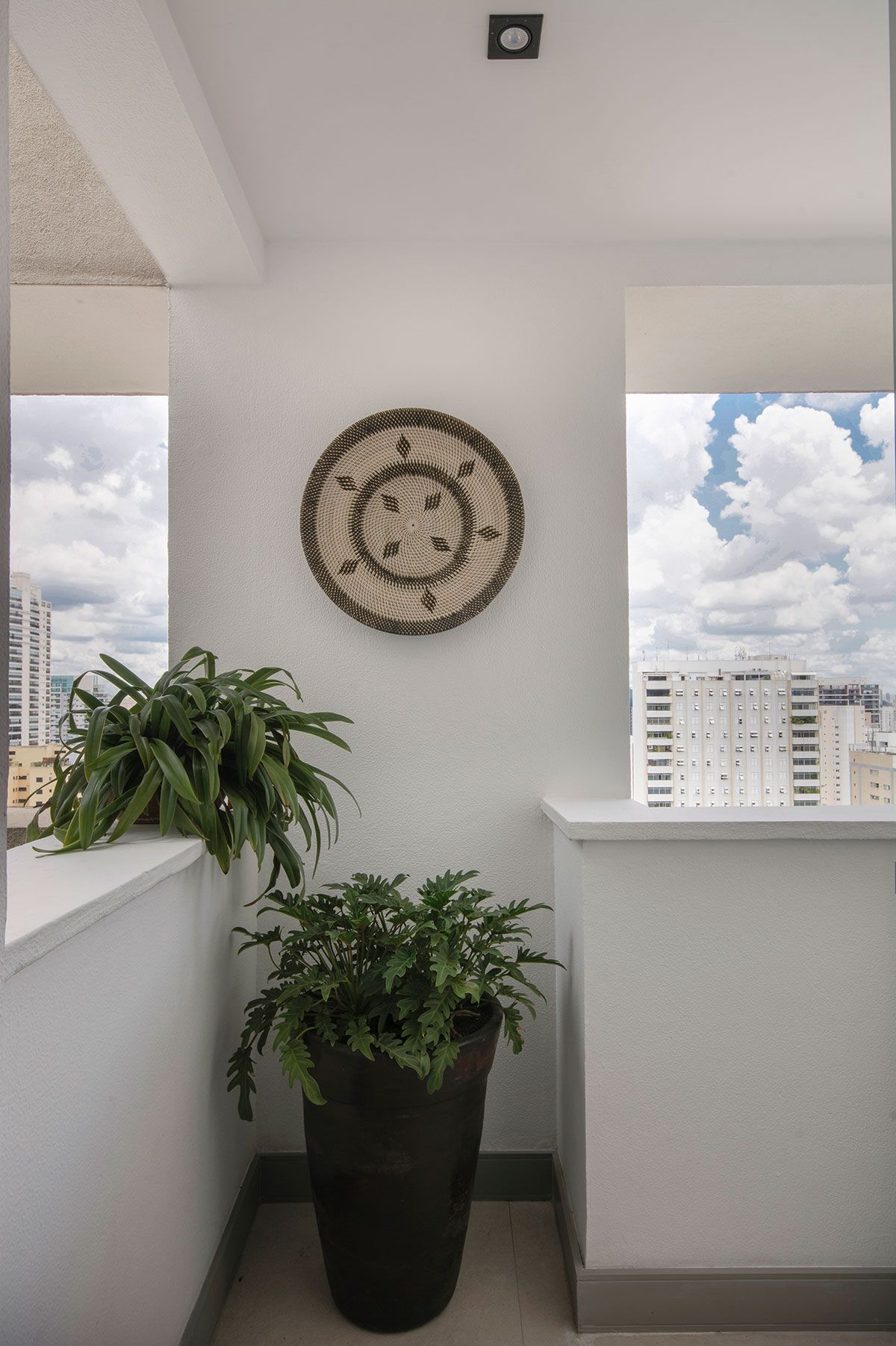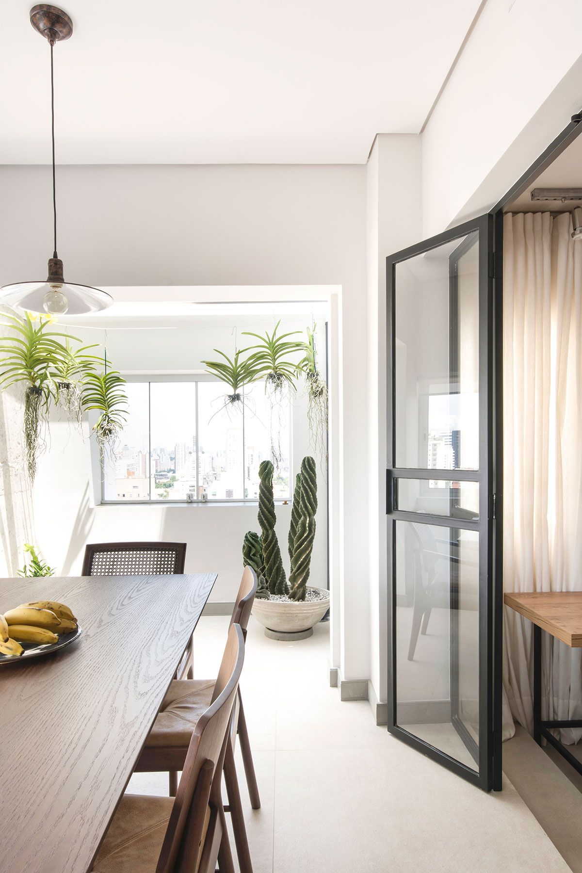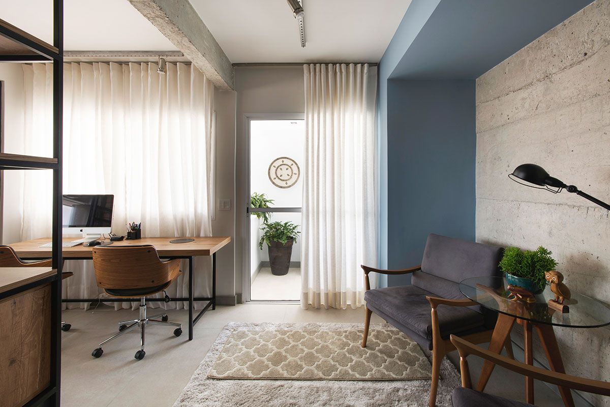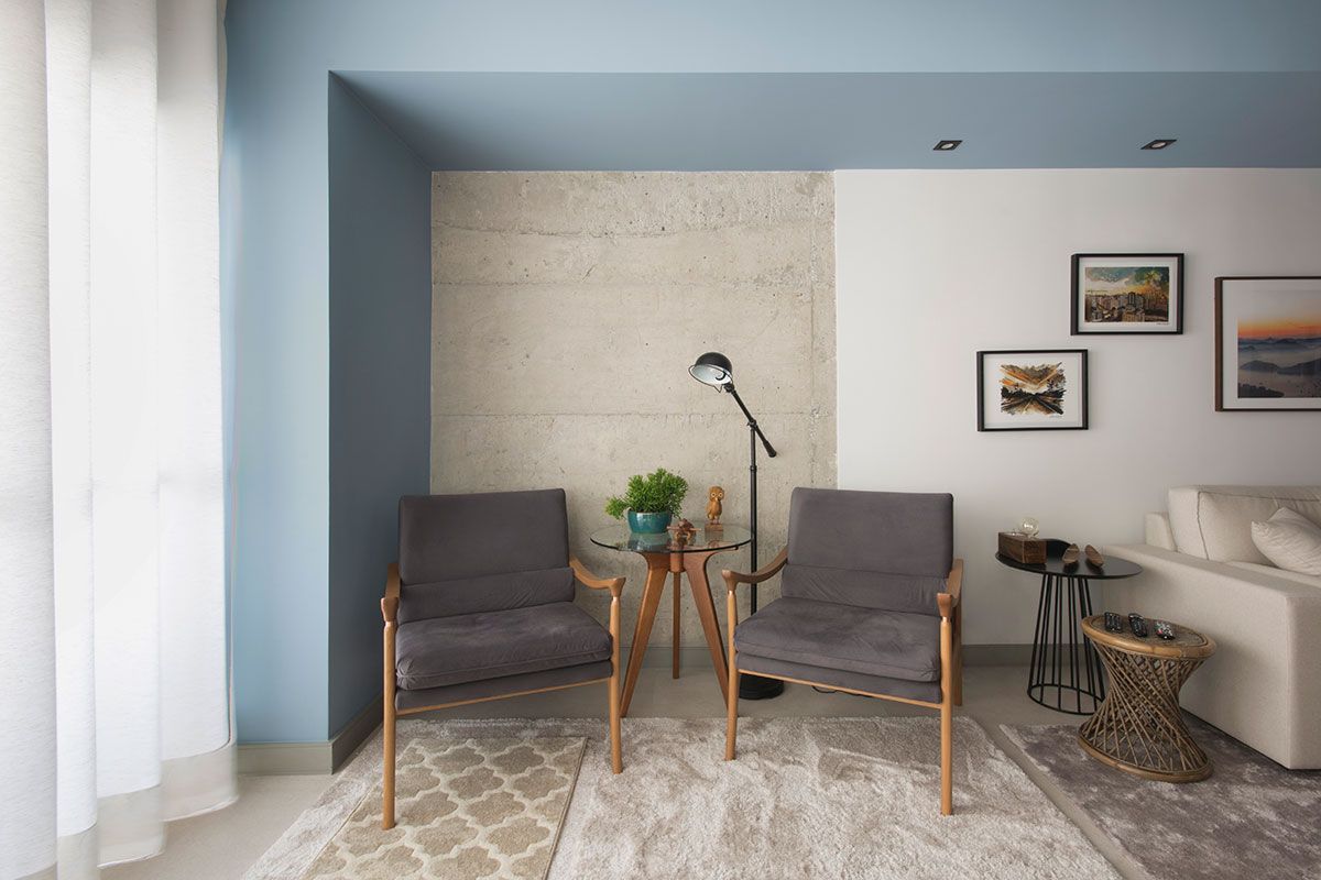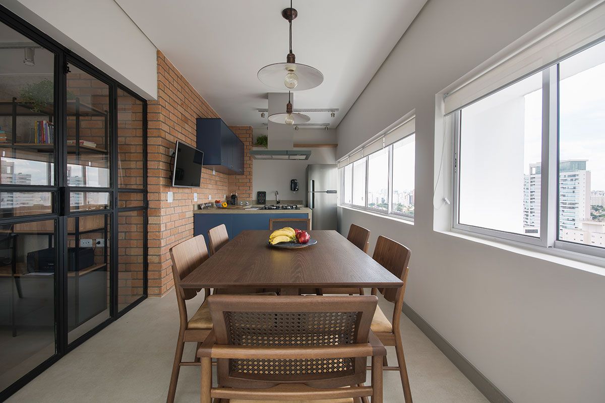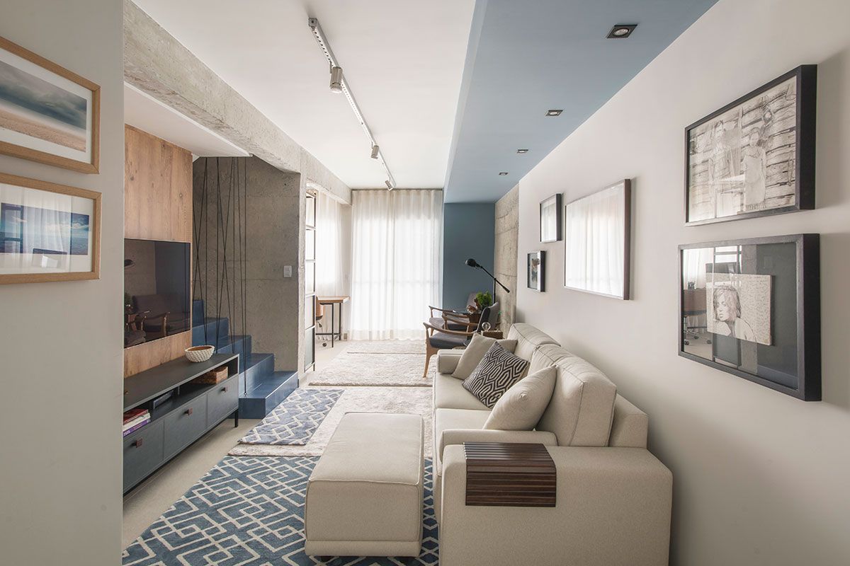 O apartamento de 100m² é uma cobertura duplex assinada pelo escritório Vinícia Brandão Arquitetura, no andar de baixo ficam sala, lavanderia, lavabo, cozinha e terraços. E no andar de cima, a suíte e um dormitório para hóspedes.