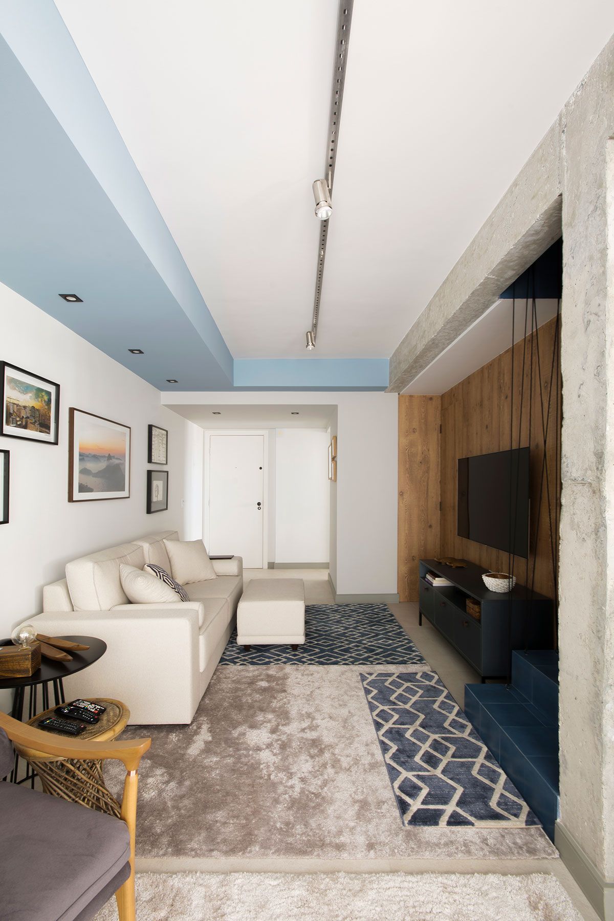 O destaque do projeto é o painel em marcenaria, que além de revestir a parede da TV, oculta a porta do lavabo. Essa solução foi criada pois a parede para a TV tinha apenas 60 cm de largura, o resto do espaço era o vão debaixo da escada e a porta do lavabo.