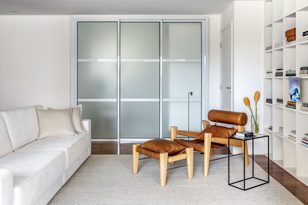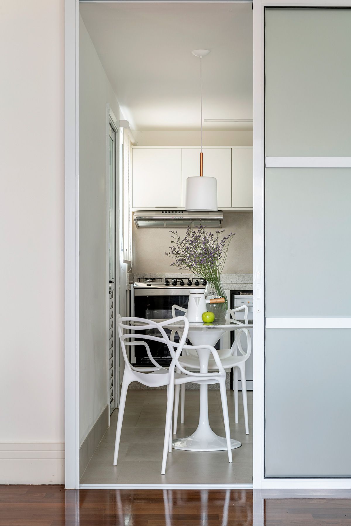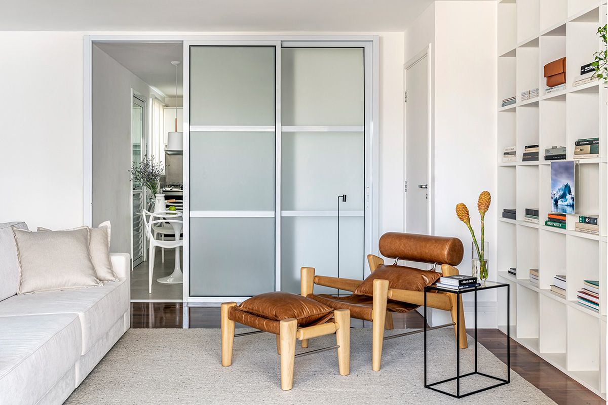 Portas com vidros jateados foram desenhadas para a luminosidade passar, e manter a privacidade da copa e cozinha ao mesmo tempo. Também foi criada uma estante para o morador poder organizar seus objetos favoritos e o desafio foi executar tudo em um prazo apertado.