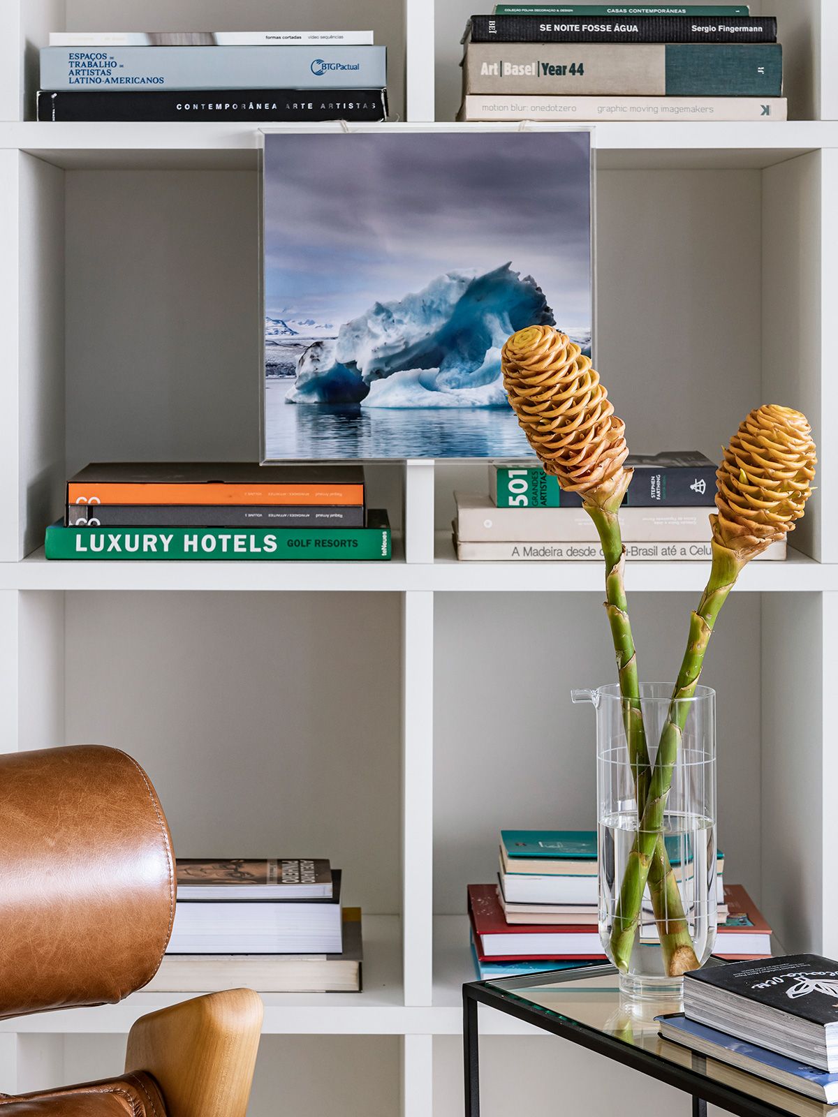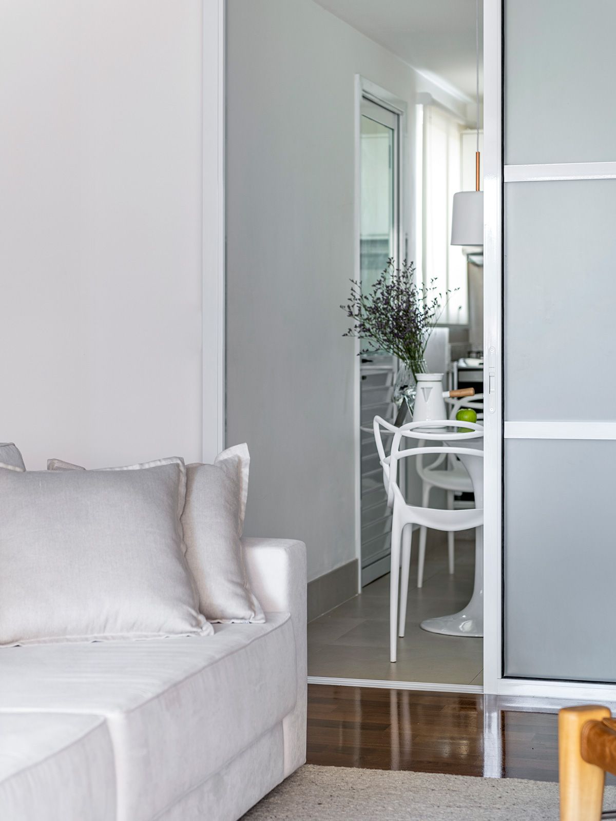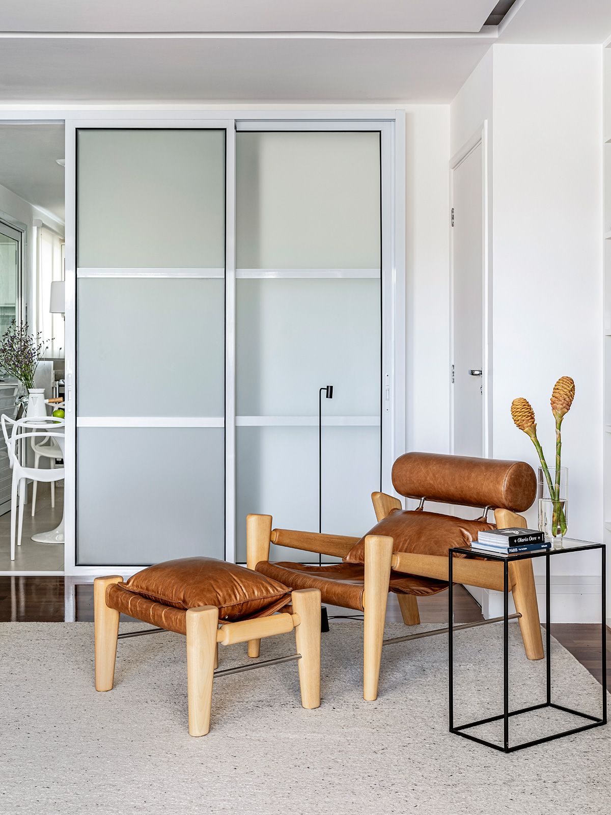 Portas com vidros jateados foram desenhadas para a luminosidade passar, e manter a privacidade da copa e cozinha ao mesmo tempo. Também foi criada uma estante para o morador poder organizar seus objetos favoritos e o desafio foi executar tudo em um prazo apertado.