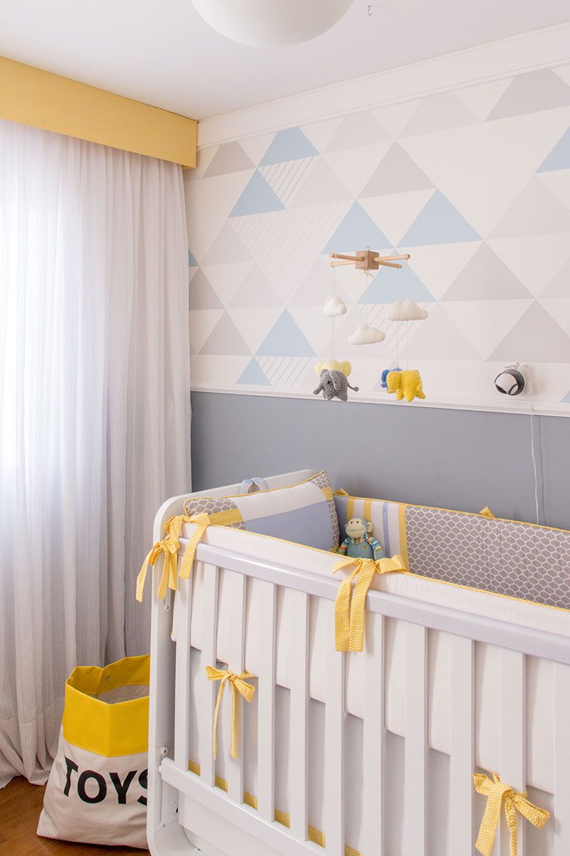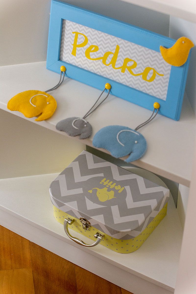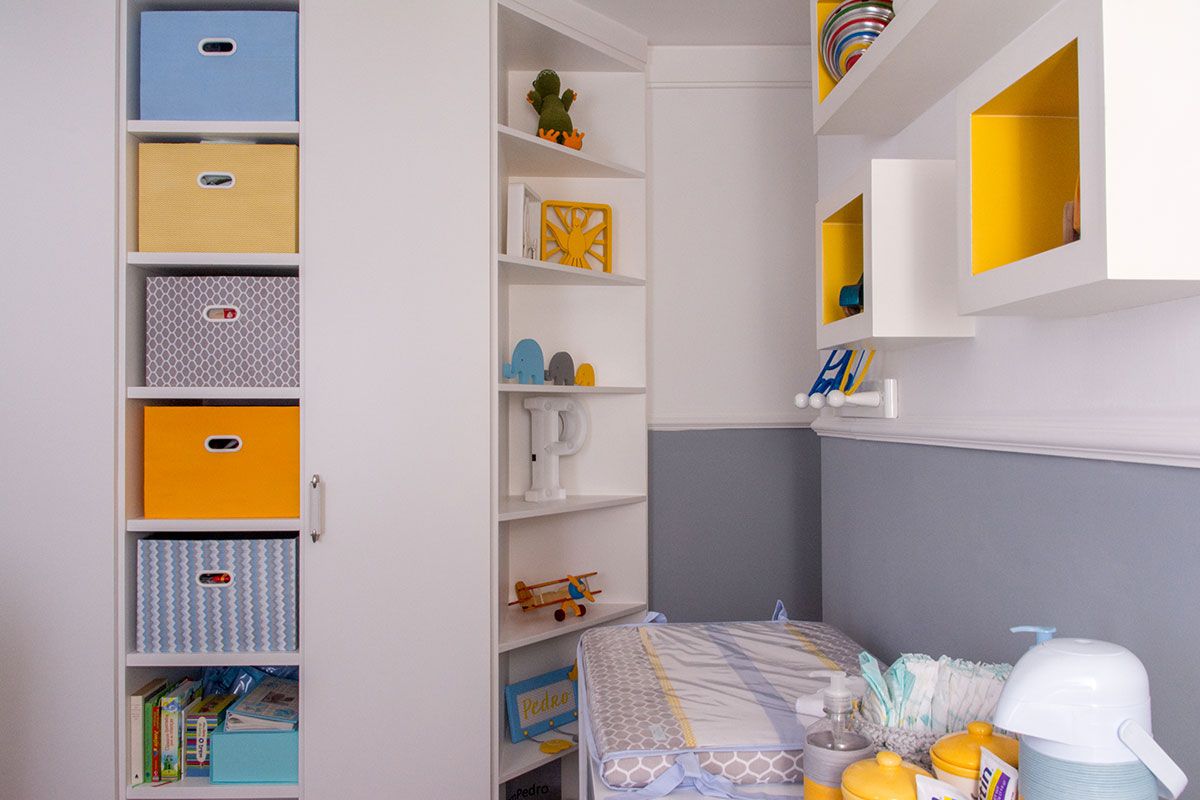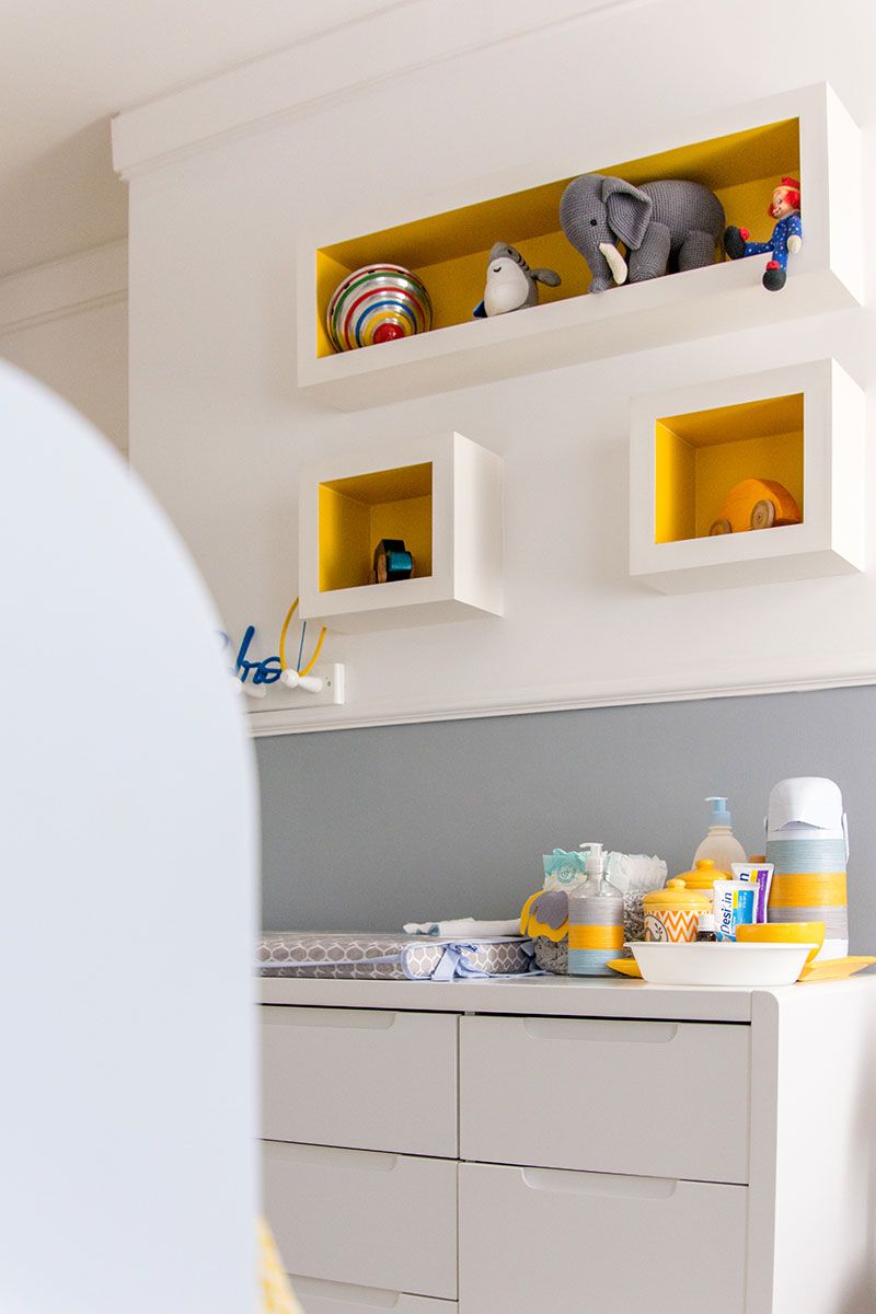 Usamos contact amarelo para forrar os nichos existentes na parede, assim eles podem ser retirados quando os clientes devolverem o apartamento, sem danificar o nicho. Usar papel de parede em apenas uma das paredes já dá um super efeito, sem um grande investimento. Utilizamos o tema do quarto nos objetos e detalhes móveis, como o móbile, o kit berço, o trocador, o conjunto de louça em cima do trocador. Assim, quando os clientes se mudarem, podem recriar o quarto no novo apartamento.