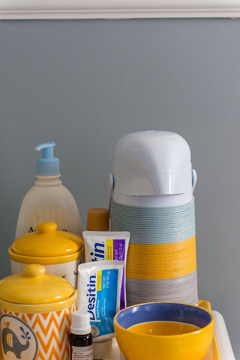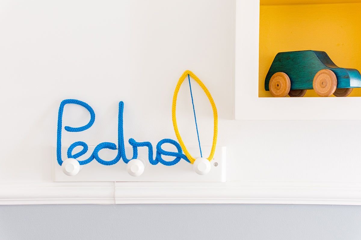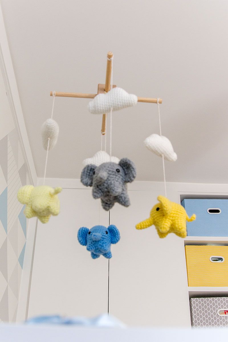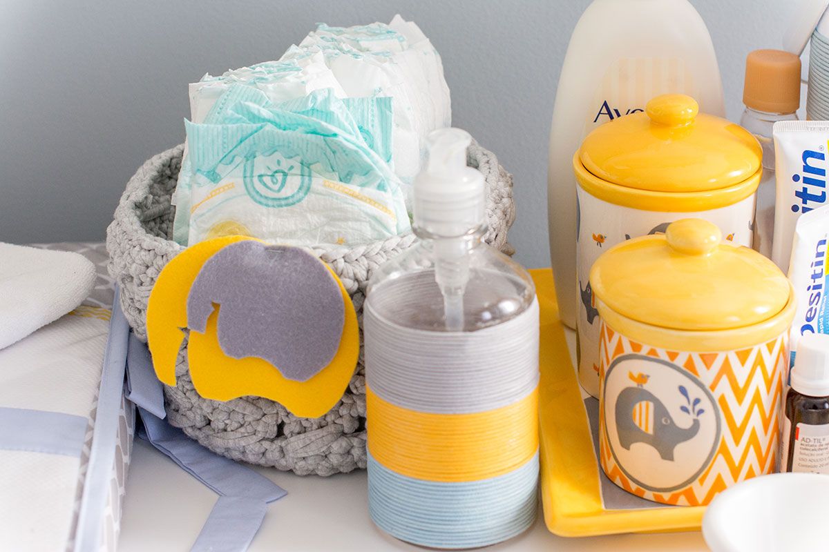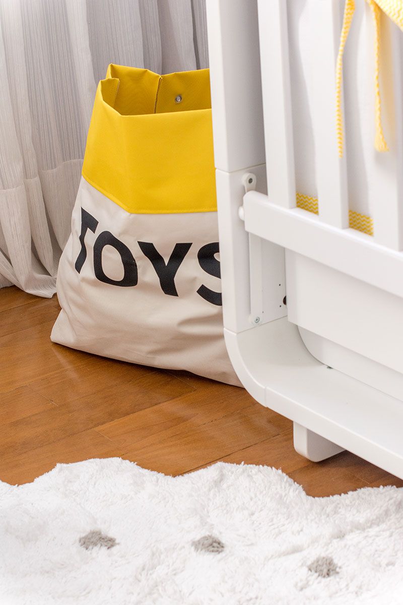 Usamos contact amarelo para forrar os nichos existentes na parede, assim eles podem ser retirados quando os clientes devolverem o apartamento, sem danificar o nicho. Usar papel de parede em apenas uma das paredes já dá um super efeito, sem um grande investimento. Utilizamos o tema do quarto nos objetos e detalhes móveis, como o móbile, o kit berço, o trocador, o conjunto de louça em cima do trocador. Assim, quando os clientes se mudarem, podem recriar o quarto no novo apartamento.