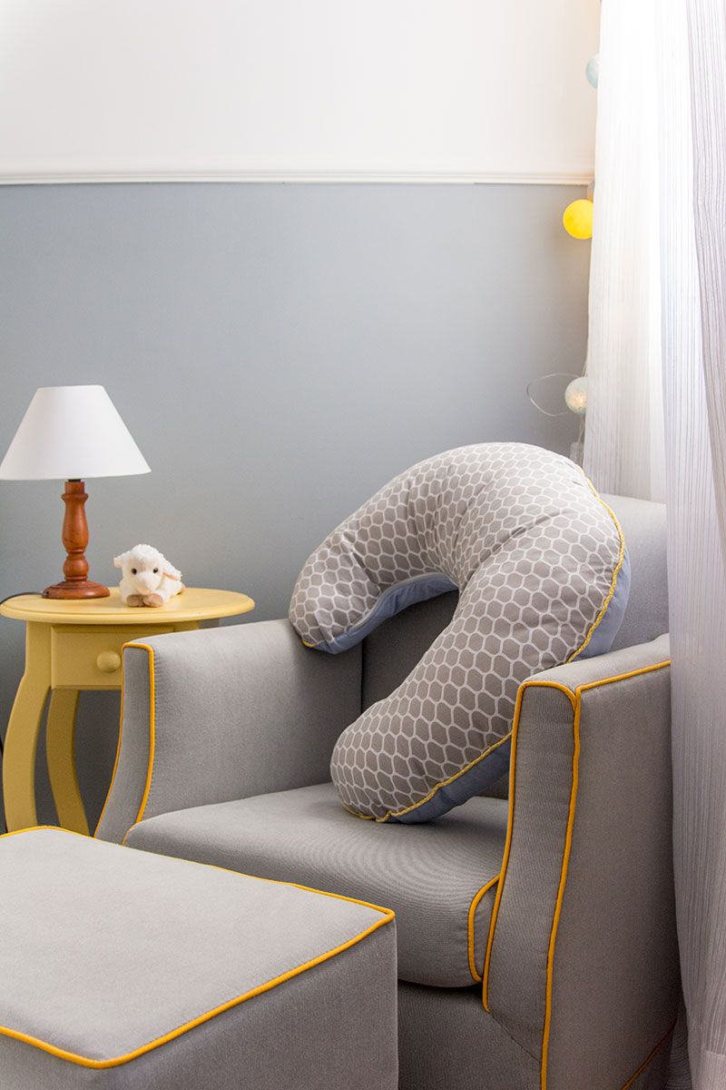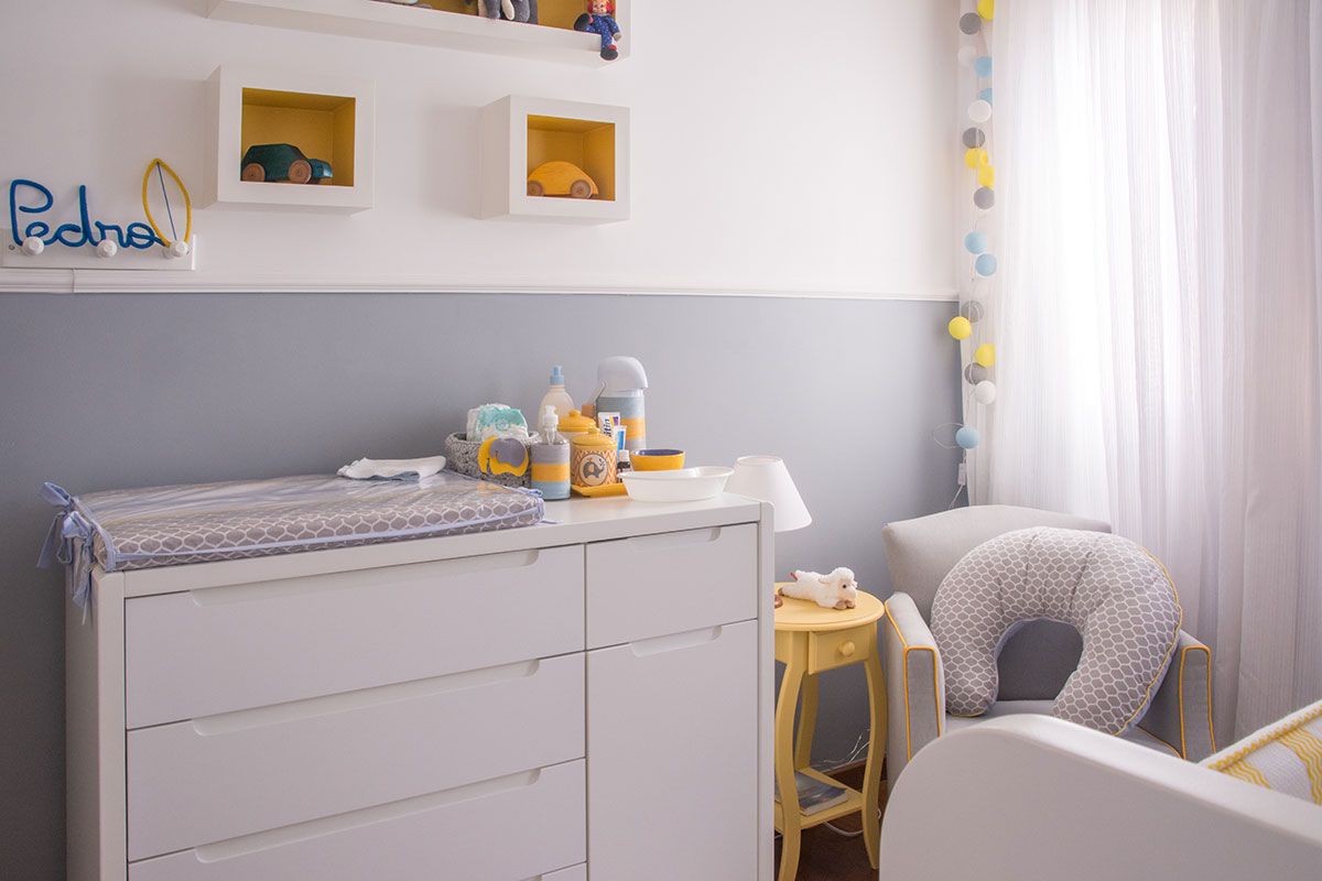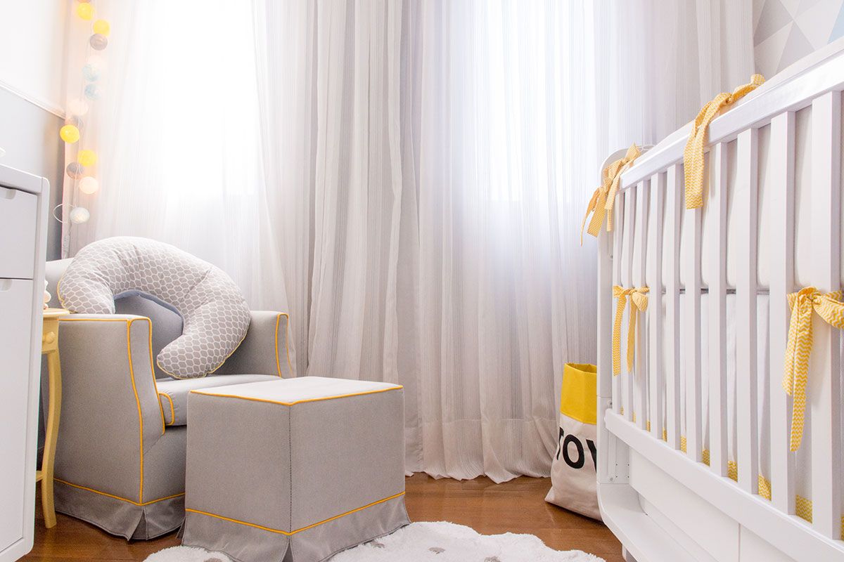 O apartamento da cliente do escritório Lu Boschi Design de Interiores é alugado e eles ficarão nele até o final do ano apenas, então queriam um quarto bonito, mas com um valor de investimento não muito alto, especialmente nas coisas que não pudessem retirar do apartamento. Muitas coisas artesanais foram feitas pela família e a poltrona utilizada para amamentação foi da avó do bebê, apenas foi estofada novamente nas cores do quarto.