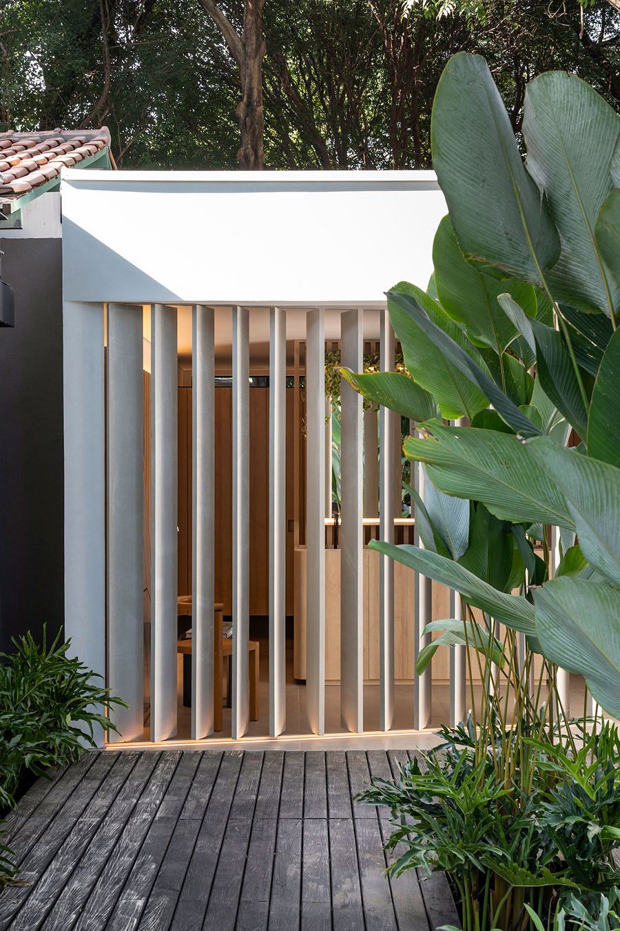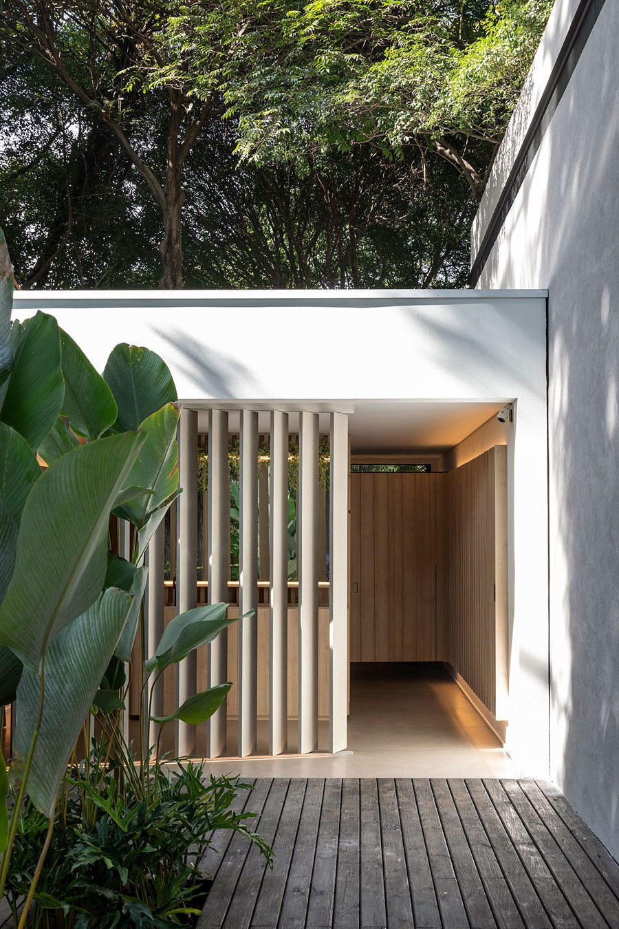 Na entrada, uma solução estética do brise, que equilibra a incidência de luz natural no ambiente, bem como o conforto térmico. Comumente executado com madeira, o arquiteto, com sua veia criativa, optou por placas cimentícias de fibrocimento, que trazem um forte apelo ecológico por sua composição de fibras vegetais mineralizadas.