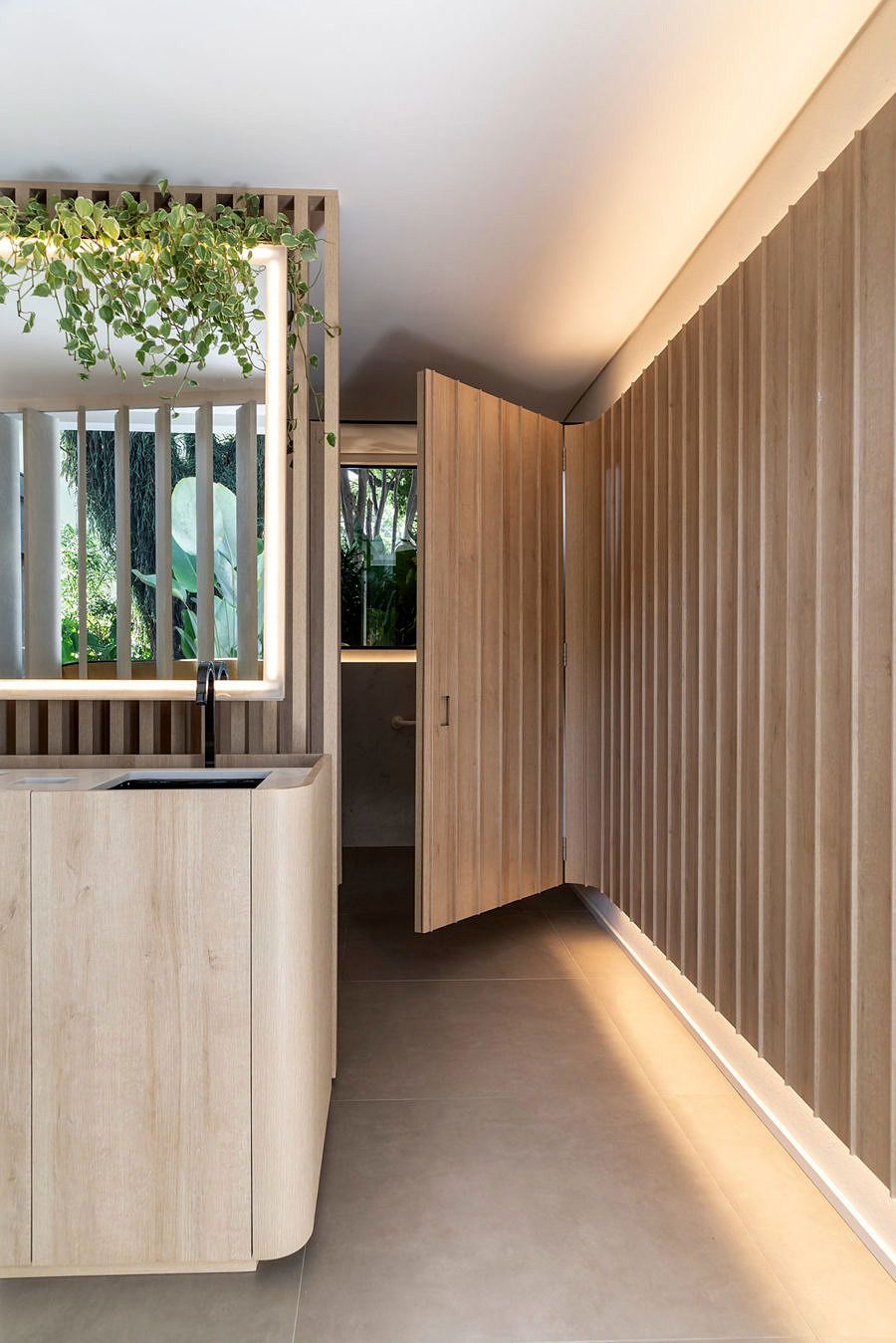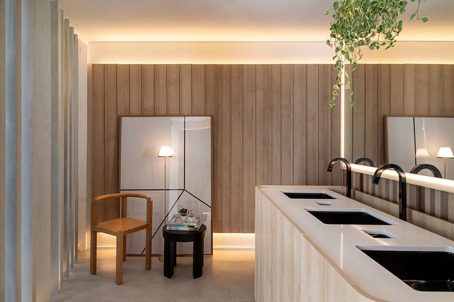 O verde se faz presente no banheiro unissex com o projeto de paisagismo executado pelo Estúdio Embaúba. Em torno do espelho, floreiras com espécies como peperômia pendente, suculenta de fácil cultivo ideal para vasos e jardineiras suspensas, caem por cima do espelho centralizado logo atrás das cubas.