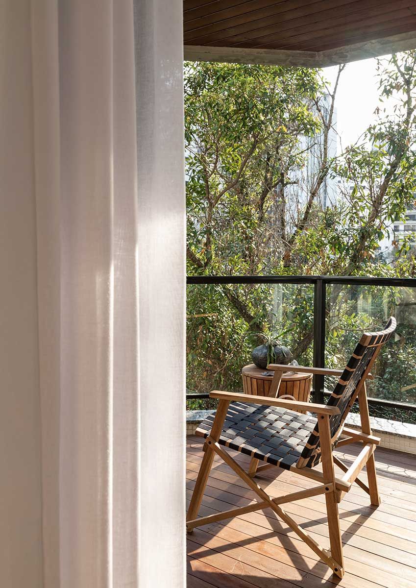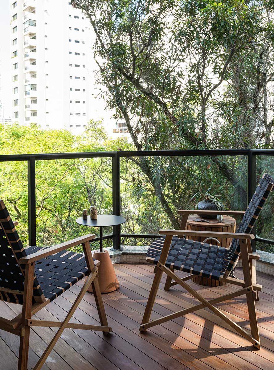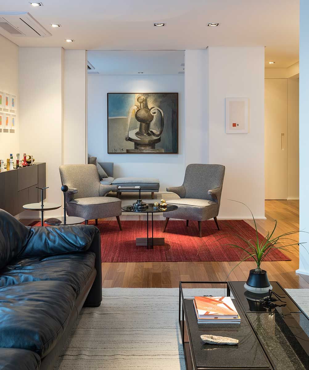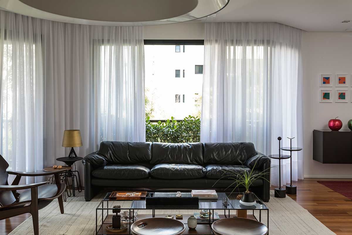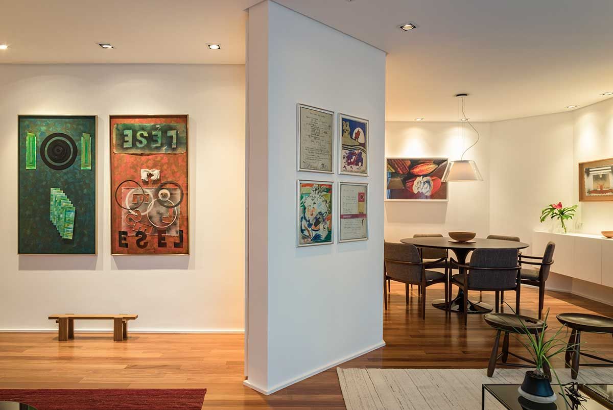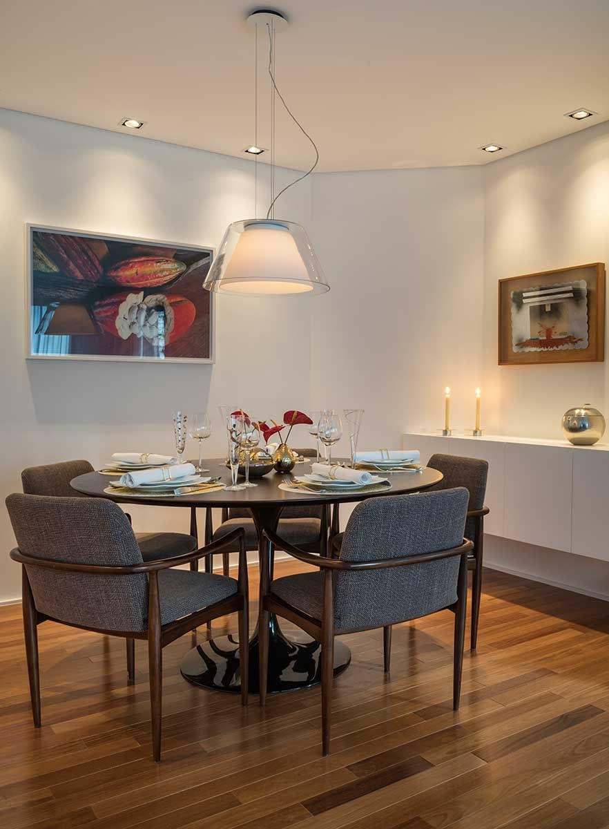A área social foi integrada eliminando-se o desnível que existia entre os espaços, o que garantiu amplitude. Apesar da unidade entre os cômodos, cada ambiente (sala de jantar, living, home, terraço) recebeu uma decoração que os individualiza, podendo ser usados separadamente.