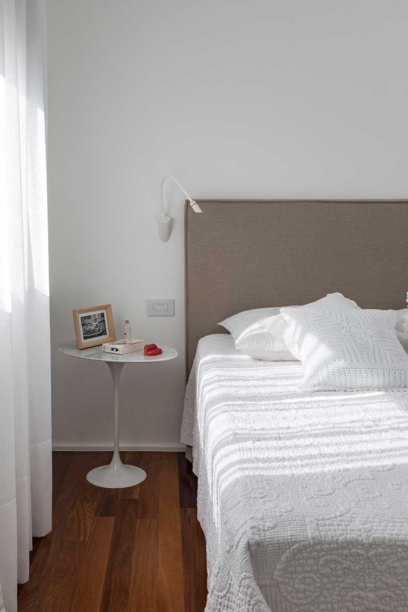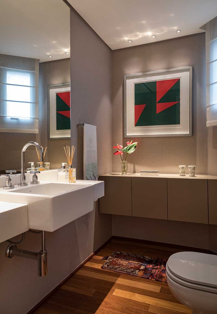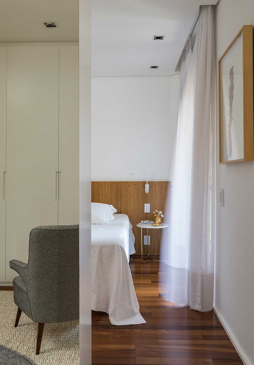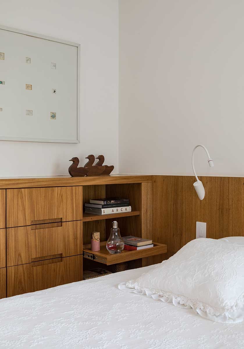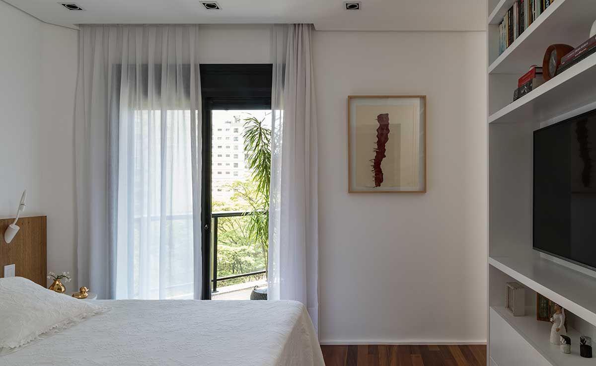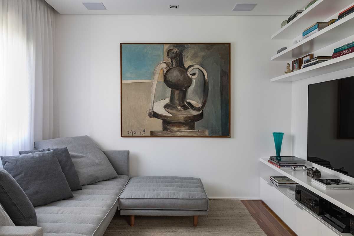 O mobiliário mistura móveis de família com novas peças de design que vão fazer parte da história do casal. A profissional projetou os armários e estantes, aproveitando cada canto disponível, para guardar louça, toalhas e outros objetos. Eles foram pensados para não interferir visualmente nos ambientes, por isso são laqueados de branco apresentando um visual leve e minimalista.