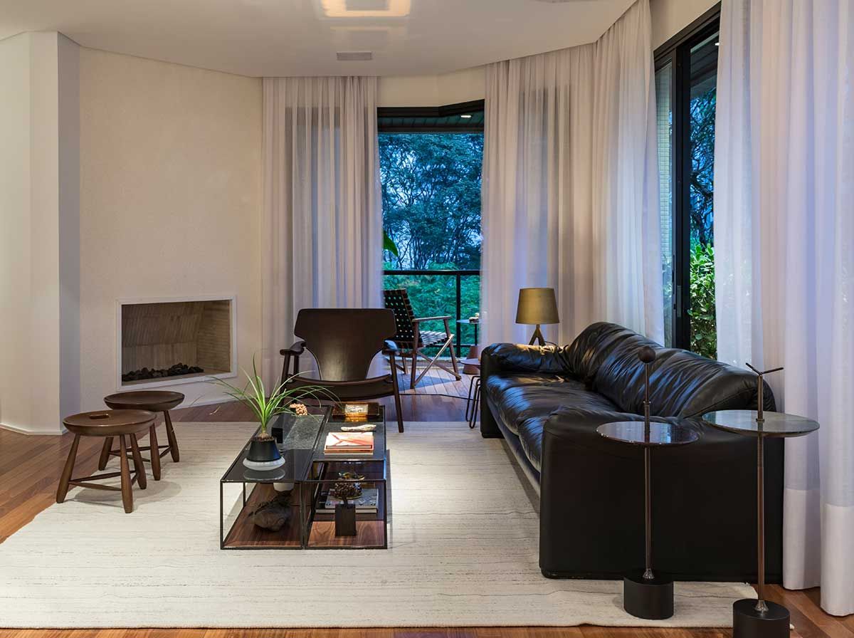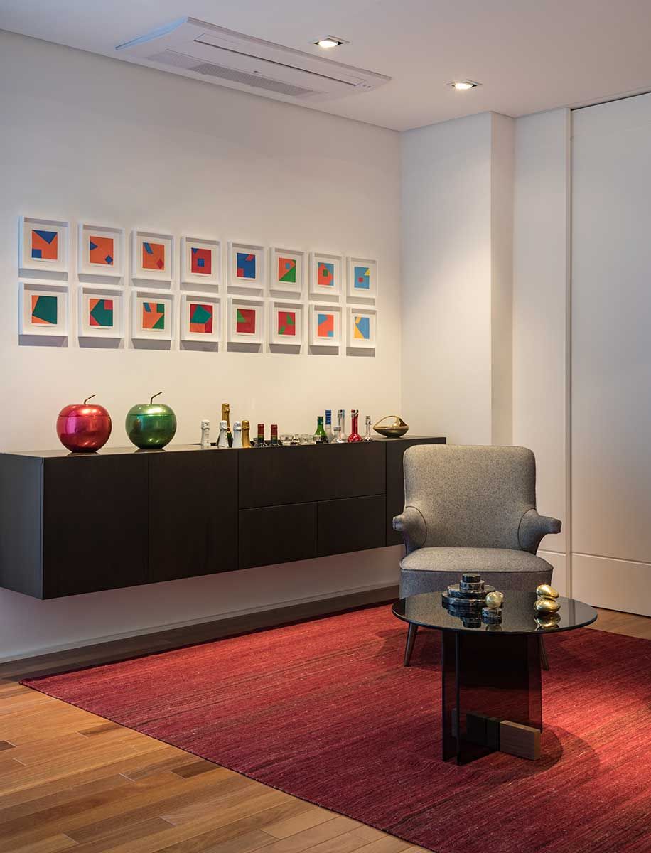 Para receber toda a infraestrututura da climatização e o sistema de luz e de som, o pé-direito foi rebaixado em 15cm. Na sala, a lareira original, que havia sido inutilizada pelos antigos proprietários, foi resgatada e valorizada. A parede em ângulo que a abriga ganhou uma textura para se diferenciar das outras.