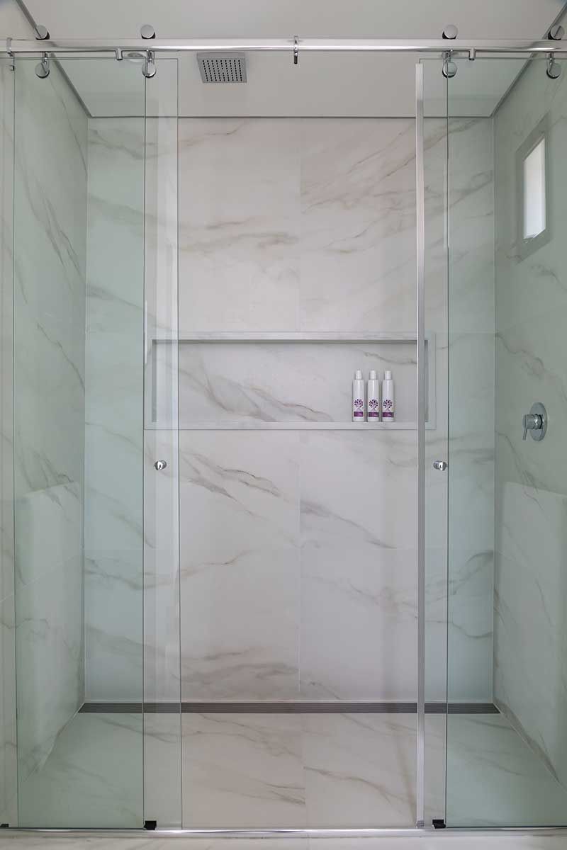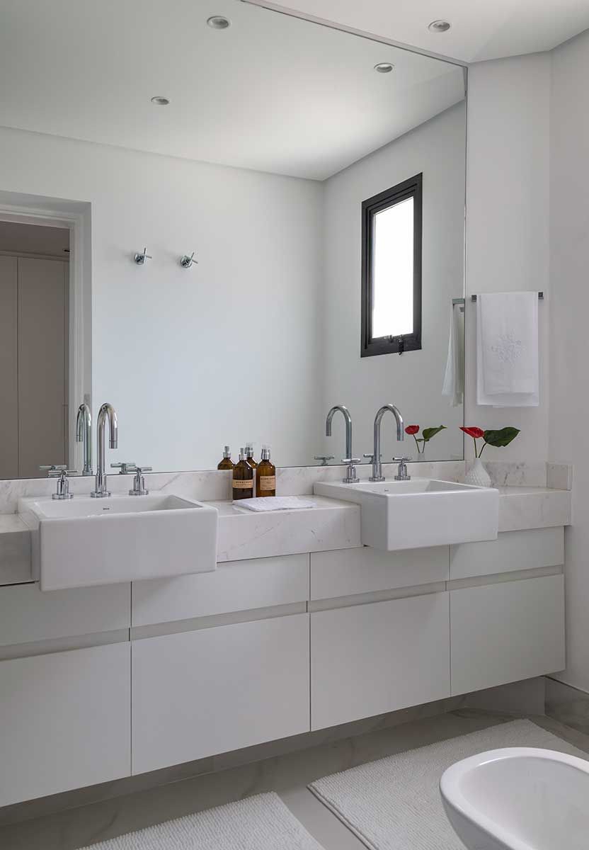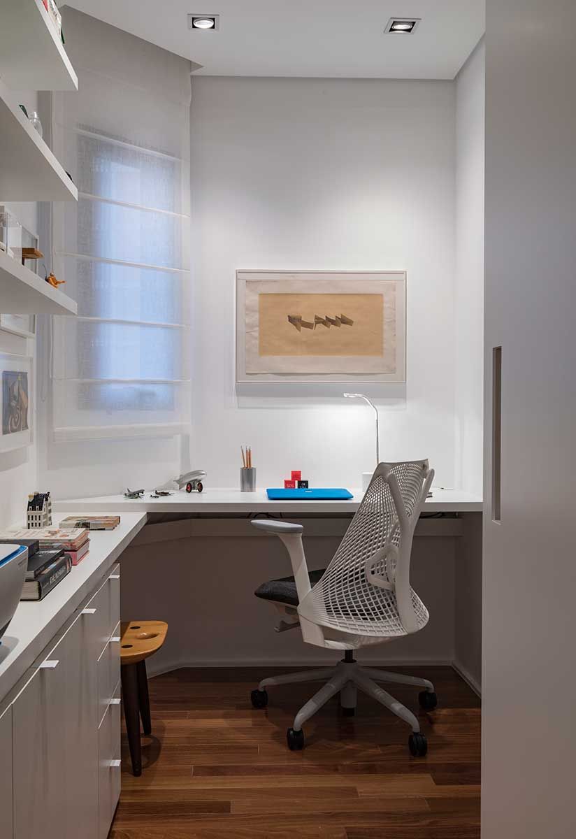 Como o casal tem o costume de fazer as refeições na sala de jantar, a copa da cozinha foi revertida e transformada em escritório. Segundo a profissional, mesmo perdendo esta área, a cozinha não foi prejudicada, pois houve um melhor aproveitamento do espaço, nova iluminação, armários bem planejados e integração entre o cômodo e a área de serviço, com uma sensação de amplitude garantida pela unidade entre as bancadas longitudinais em mármore Carrara.