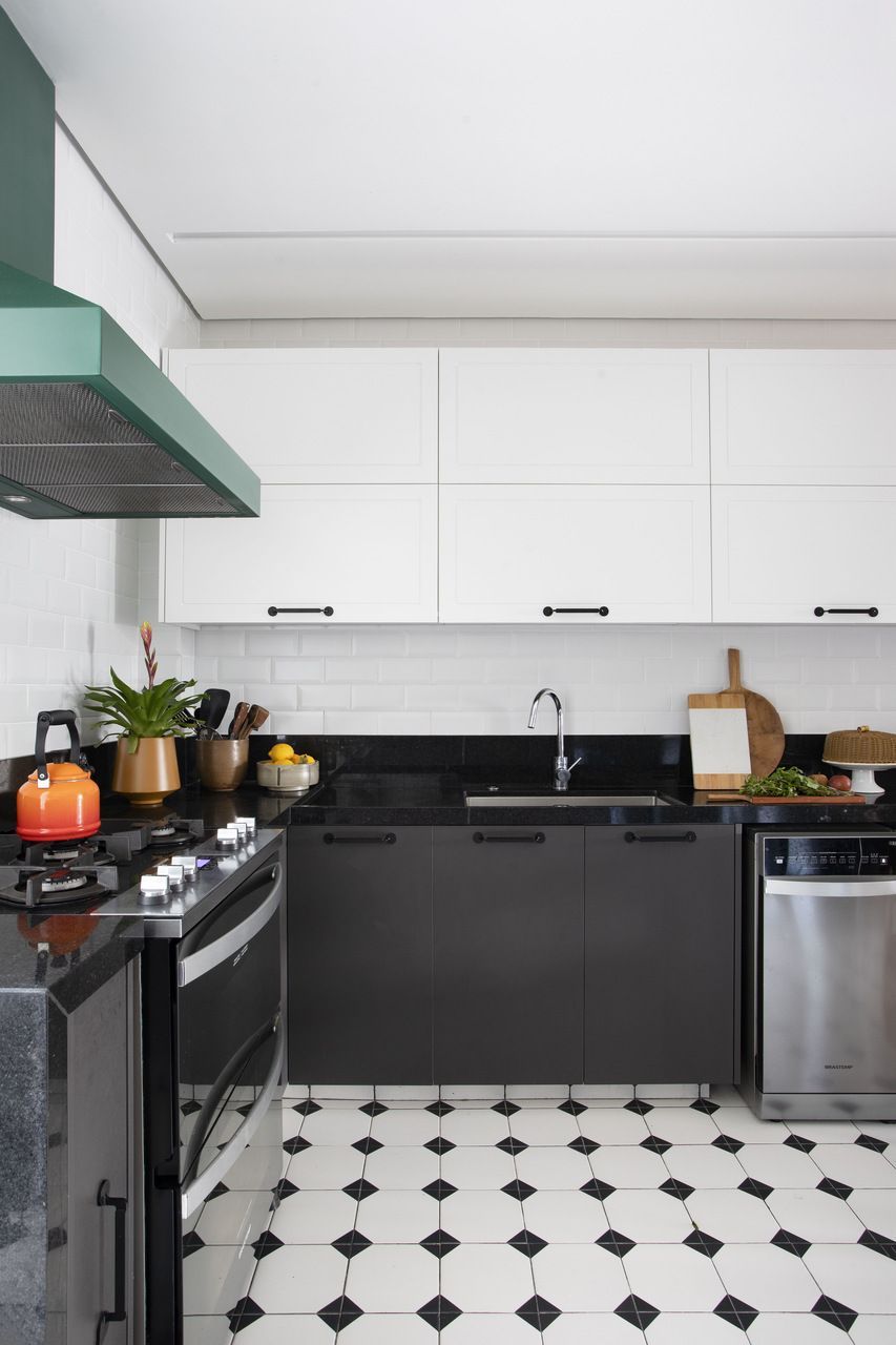 A materialidade reforça o caráter atemporal do apartamento. Nas áreas sociais, as tábuas corridas de cumaru foram preservadas, enquanto a área íntima mantém o taco em espinha de peixe. As paredes alternam superfícies brancas e textura cinza de tecnocimento, em diálogo com a marcenaria em carvalho americano natural. Na cozinha, a coifa verde se destaca como elemento decorativo sobre o piso preto e branco de inspiração retrô, trazendo um gesto de personalidade ao ambiente.