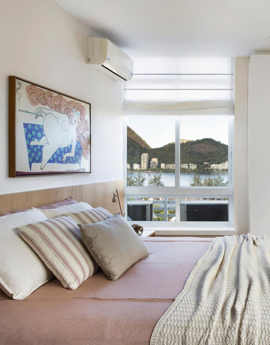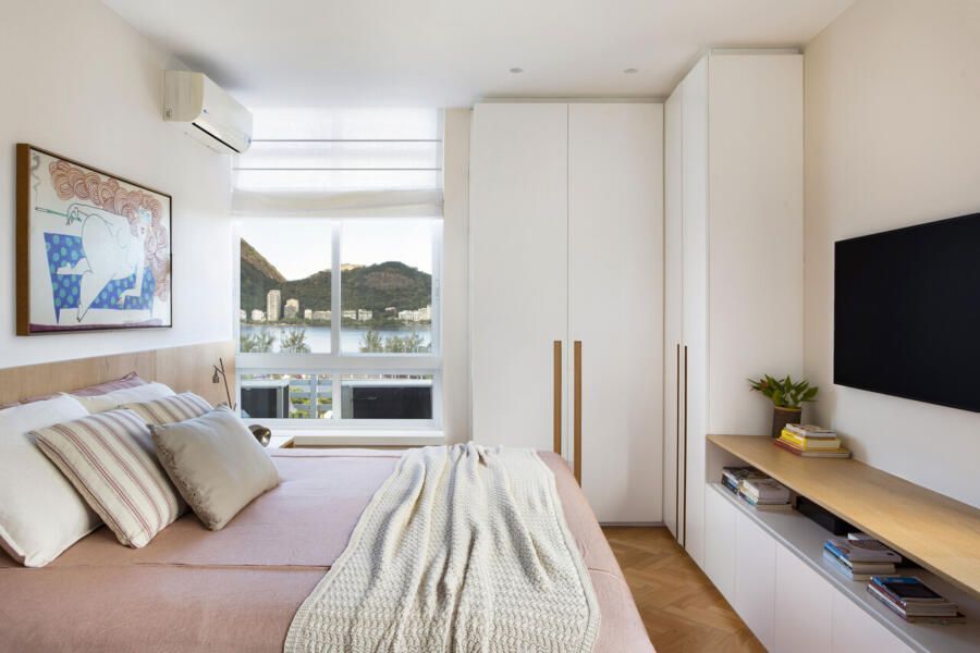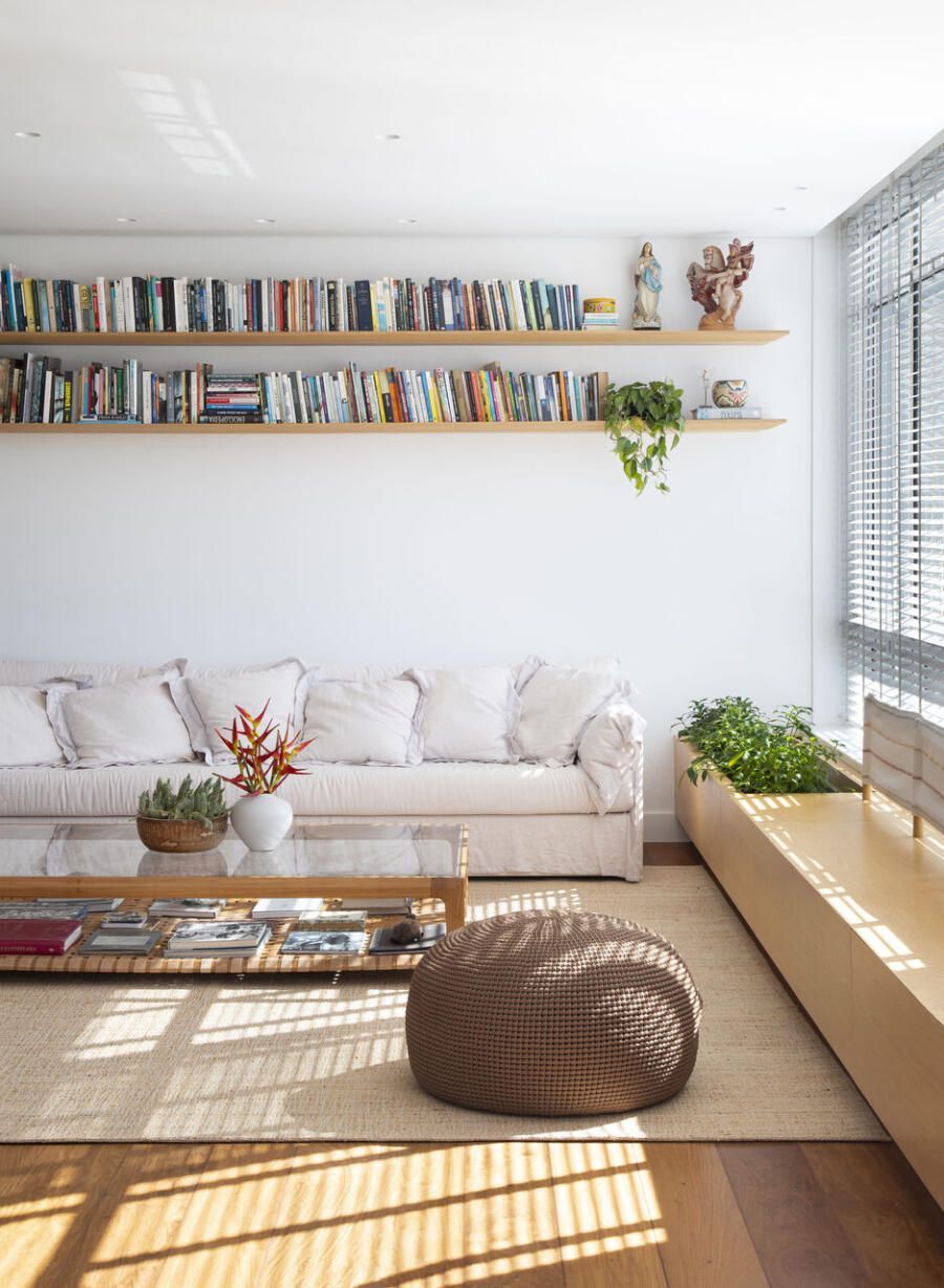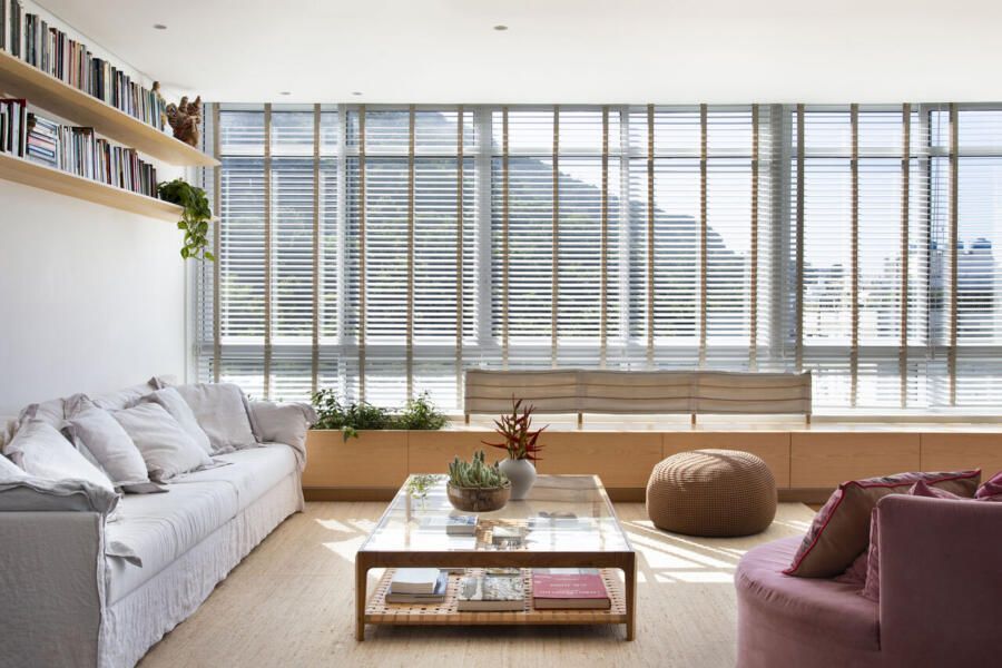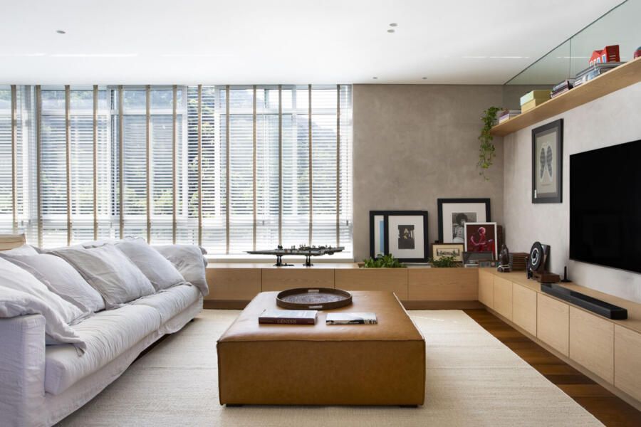 A marcenaria sob medida assume papel estruturador no projeto. Um banco-aparador em “L” percorre toda a extensão da janela da sala e avança até a área de TV, integrando funções e desenhando o espaço com precisão. Com gavetas inferiores e uma jardineira na extremidade, a peça sintetiza o cuidado com o detalhe e a busca por soluções que unem estética e funcionalidade. Ao redor, persianas horizontais filtram a luz natural de forma delicada, contribuindo para a atmosfera acolhedora.