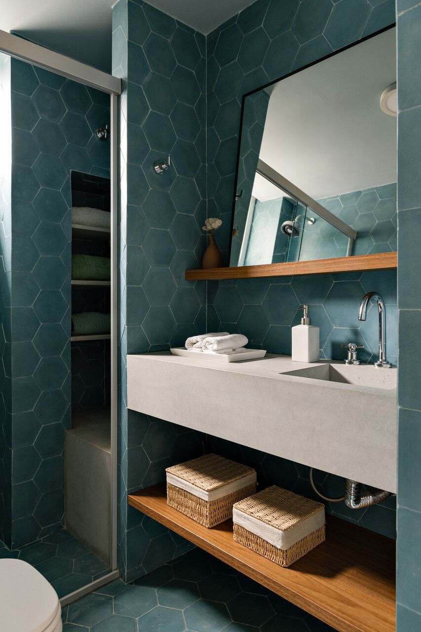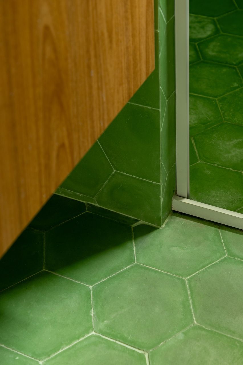 Com a liberdade conquistada pelos arquitetos, a cozinha ganhou um protagonismo descontraído. É nela que aparecem os primeiros pontos de cor, equilibrando a neutralidade do restante da casa. O pedido inegociável do morador, o ladrilho hidráulico, surge em detalhes estratégicos e carrega parte da identidade do projeto. No banheiro principal, a escolha pelo ladrilho verde revela uma homenagem afetiva: o morador é palmeirense e queria que essa paixão estivesse presente de maneira sutil, porém marcante.