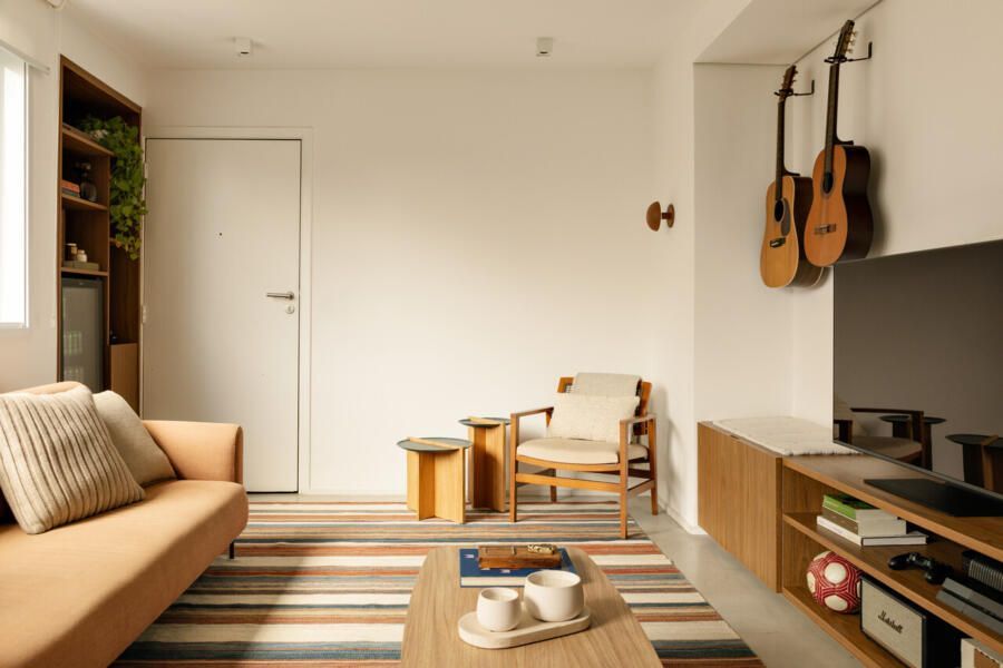 “O legal é que, mesmo sendo uma sala compacta, dá pra fazer um monte de coisas. Tem canto pra ler, ver algo no note ou na TV, tocar violão, comer, bater papo… Tudo flui de forma leve, sem que o espaço pareça apertado.”