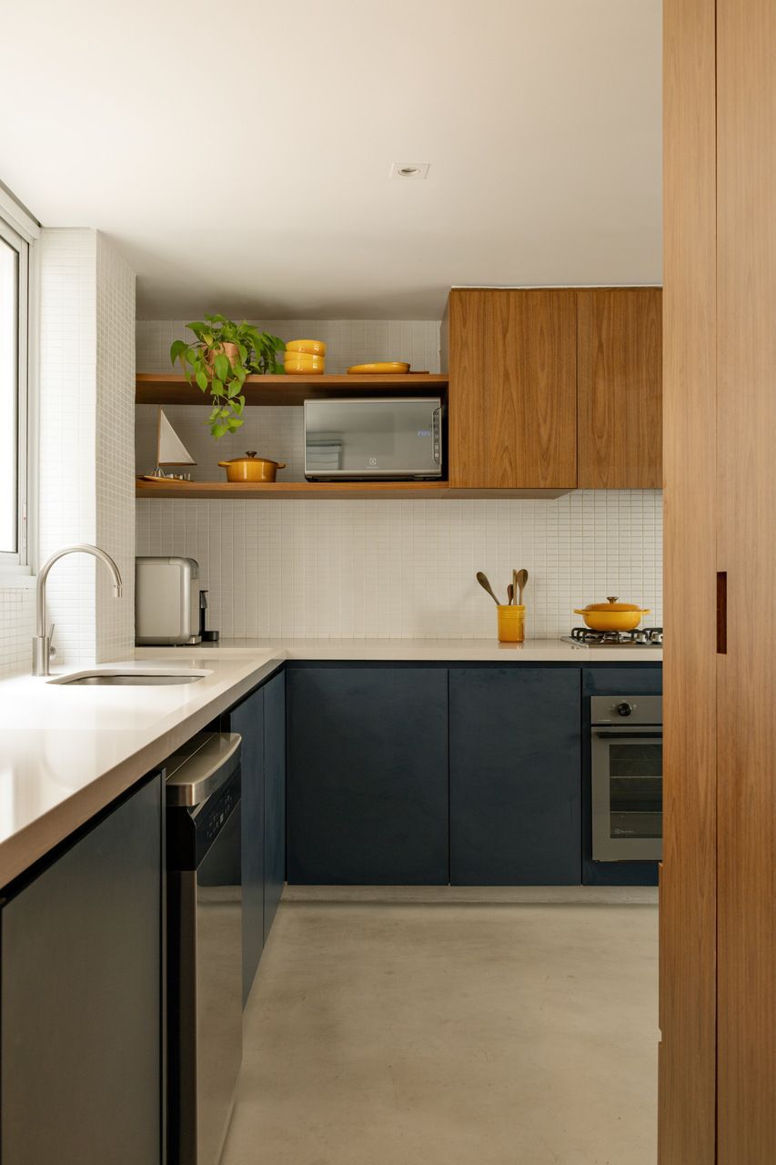 A antiga planta compartimentada não dialogava com esse cotidiano. Para resolver isso, a integração entre sala e cozinha se tornou o ponto central da reforma, abrindo respiros e circulações que antes não existiam. O apê então se tornou é um espaço fluido, onde o olhar percorre o ambiente sem barreiras visuais, guiado pela base de cimento queimado, madeira clara e paredes brancas que fazem o apartamento parecer mais amplo do que realmente é.