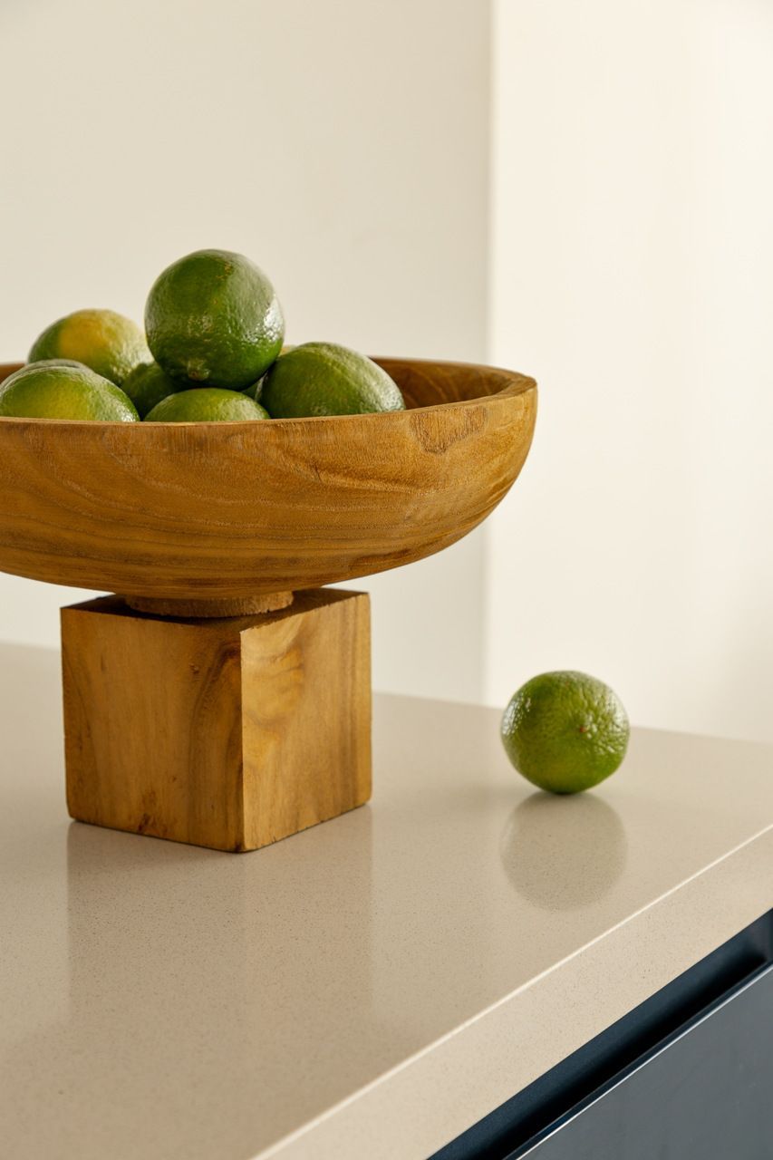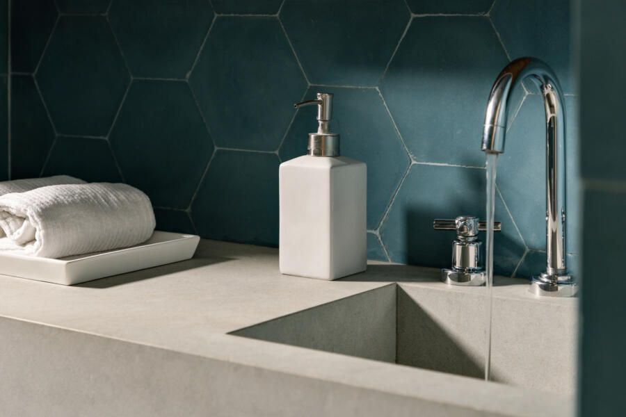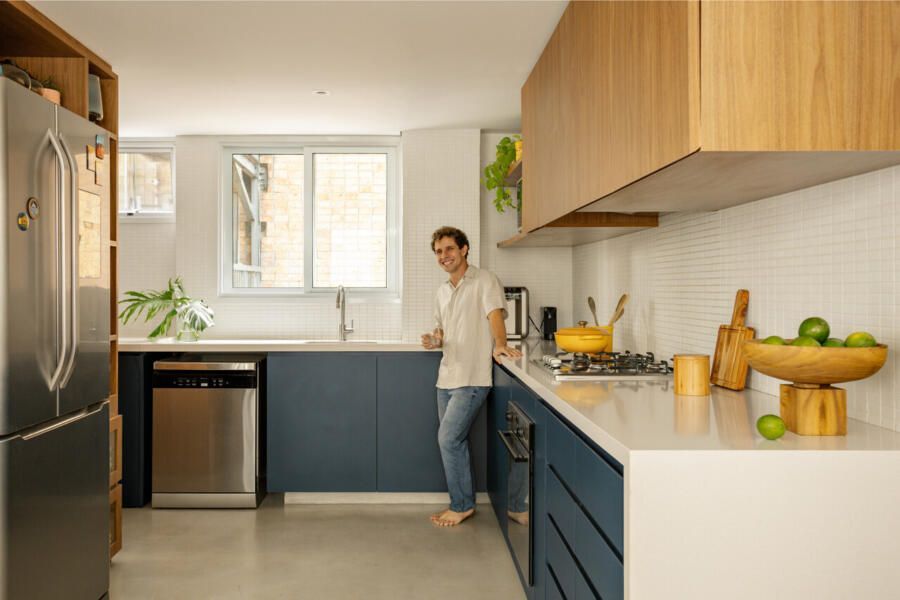 Com a liberdade conquistada pelos arquitetos, a cozinha ganhou um protagonismo descontraído. É nela que aparecem os primeiros pontos de cor, equilibrando a neutralidade do restante da casa. O pedido inegociável do morador, o ladrilho hidráulico, surge em detalhes estratégicos e carrega parte da identidade do projeto. No banheiro principal, a escolha pelo ladrilho verde revela uma homenagem afetiva: o morador é palmeirense e queria que essa paixão estivesse presente de maneira sutil, porém marcante.