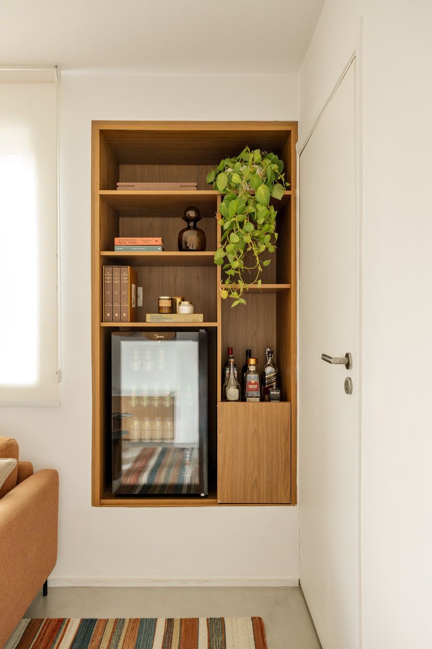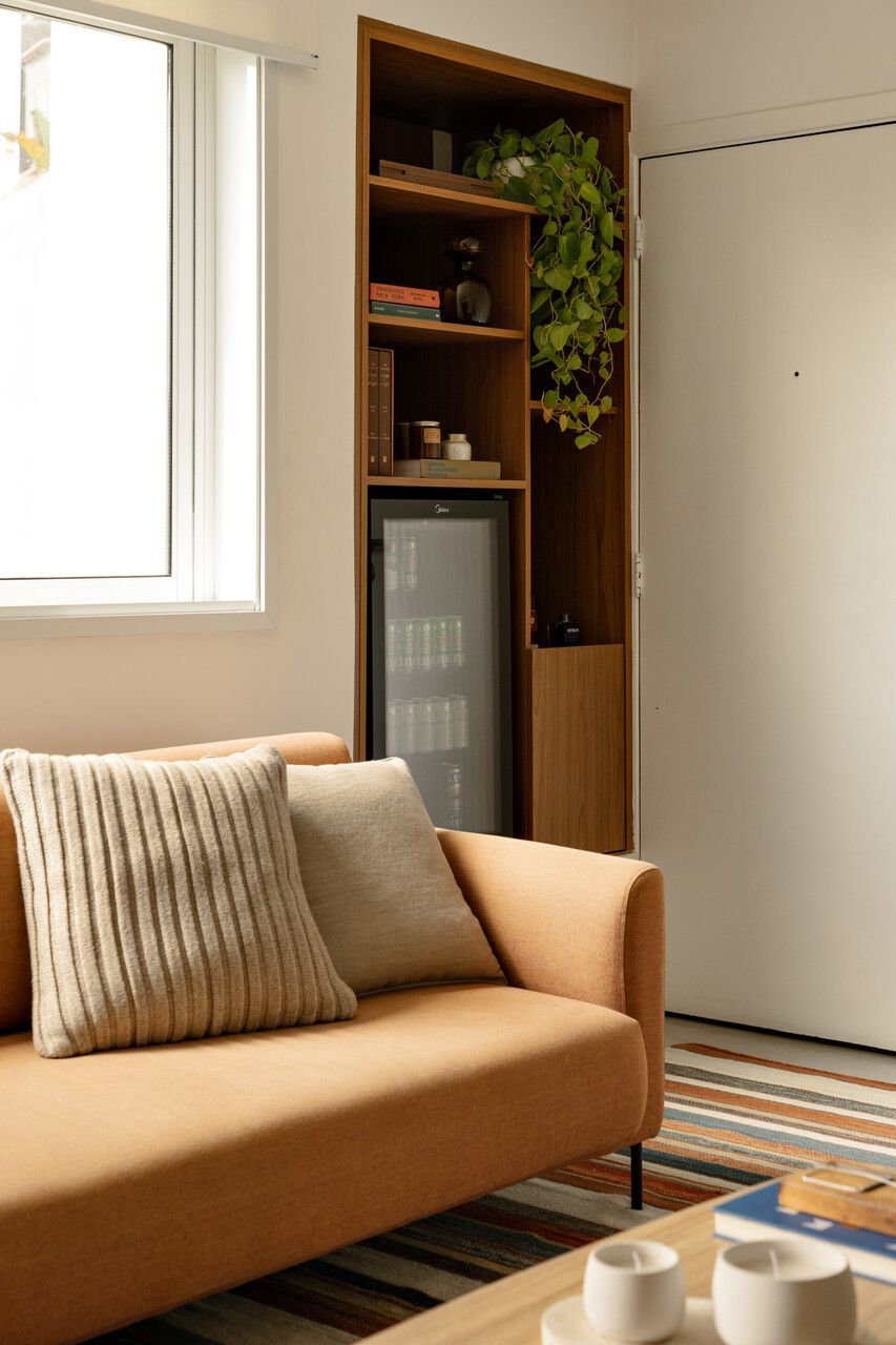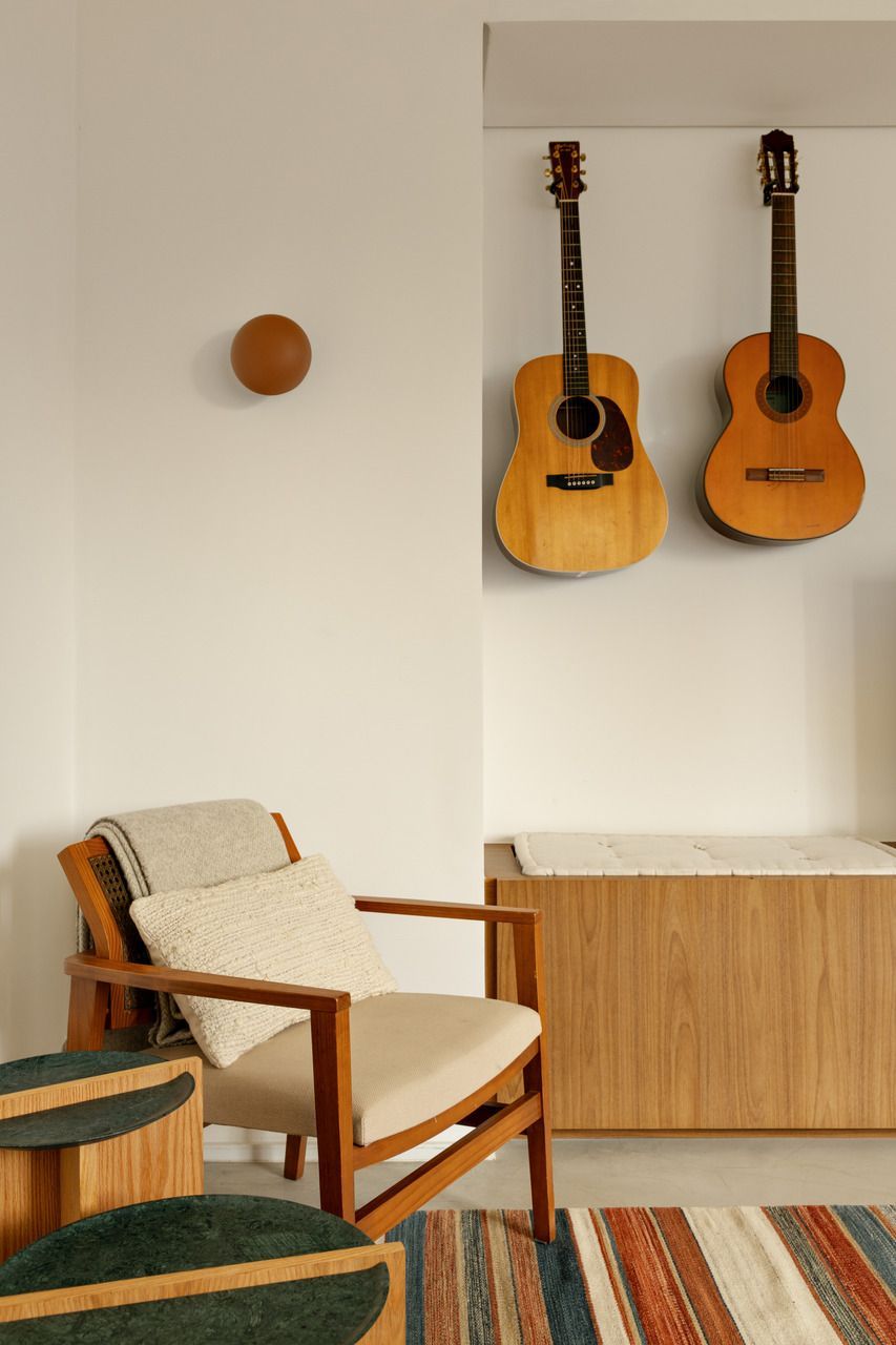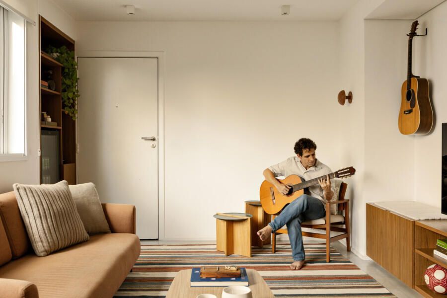 “O legal é que, mesmo sendo uma sala compacta, dá pra fazer um monte de coisas. Tem canto pra ler, ver algo no note ou na TV, tocar violão, comer, bater papo… Tudo flui de forma leve, sem que o espaço pareça apertado.”