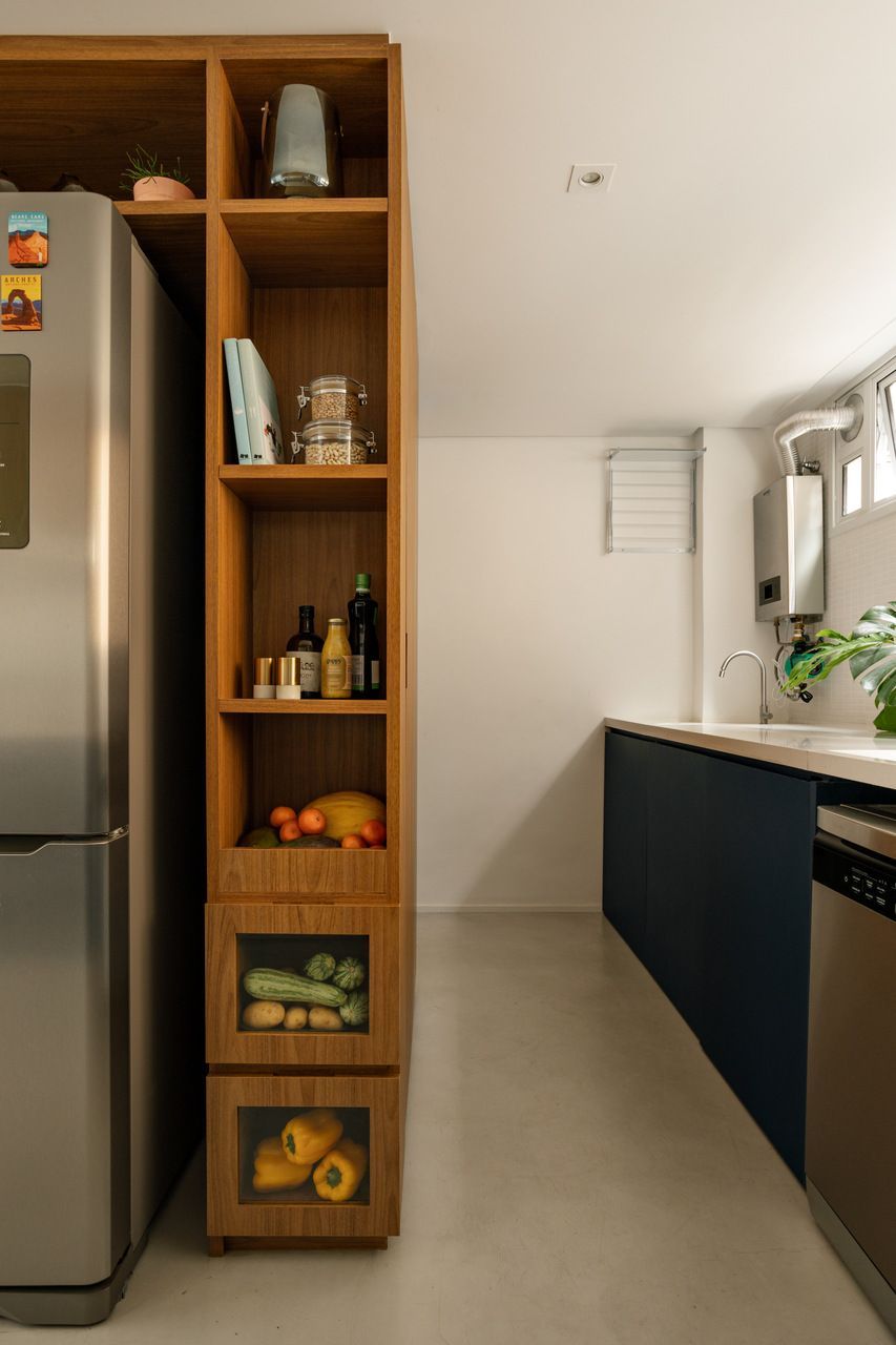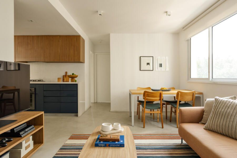 A antiga planta compartimentada não dialogava com esse cotidiano. Para resolver isso, a integração entre sala e cozinha se tornou o ponto central da reforma, abrindo respiros e circulações que antes não existiam. O apê então se tornou é um espaço fluido, onde o olhar percorre o ambiente sem barreiras visuais, guiado pela base de cimento queimado, madeira clara e paredes brancas que fazem o apartamento parecer mais amplo do que realmente é.