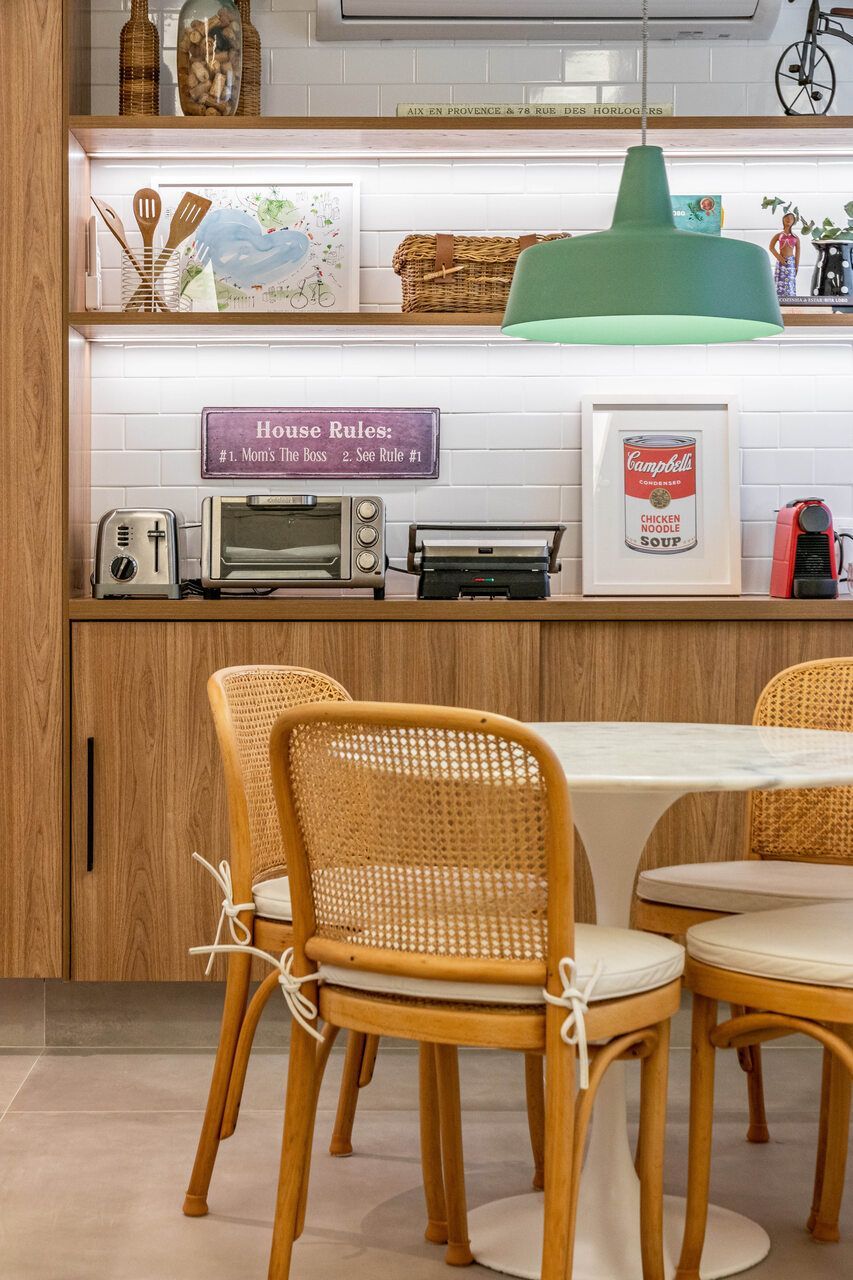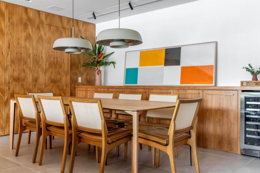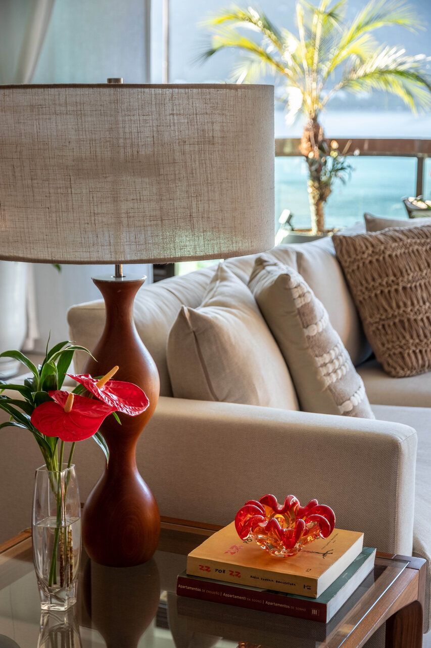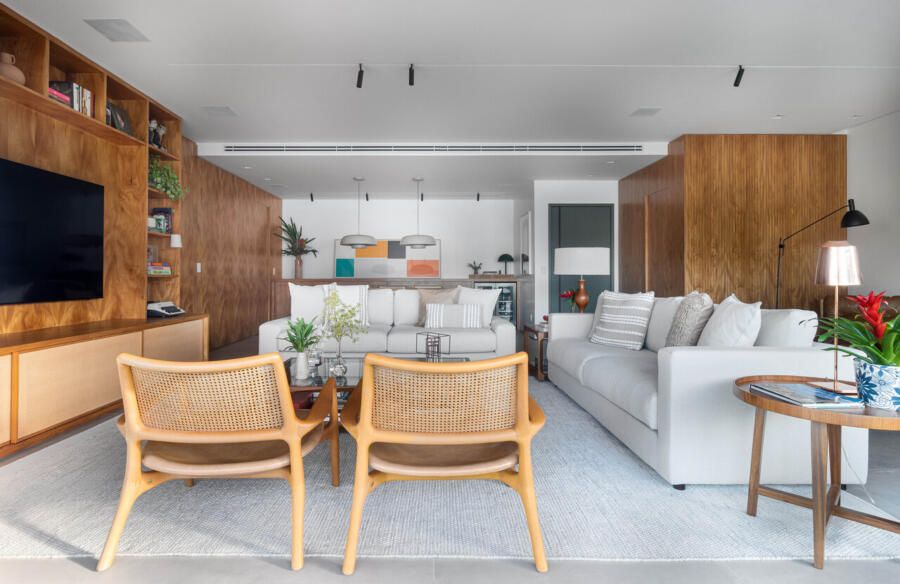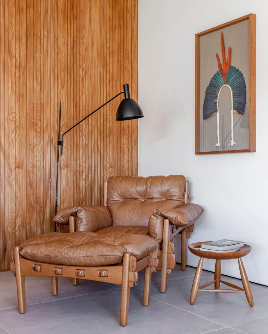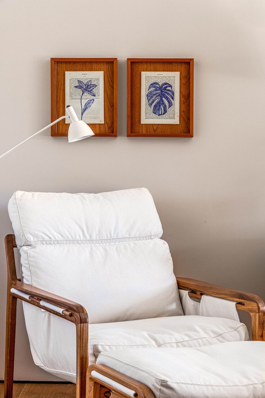 Na decoração, as arquitetas optaram por um contemporâneo acolhedor, com base neutra e atemporal. Algumas peças do apartamento anterior foram reaproveitadas, como o sofá, a mesa de centro e duas poltronas, dialogando com novos ícones do design brasileiro. No canto de leitura da sala, a poltrona Moleca, de Sérgio Rodrigues, divide a cena com a luminária Bauhaus, da Lumini. Já no estar, duas poltronas Mad, de Jader Almeida, reforçam o conforto, enquanto a sala de jantar é marcada pela mesa Dinn, do mesmo designer, acompanhada das luminárias pendentes Gamela, assinadas por Lia Siqueira.