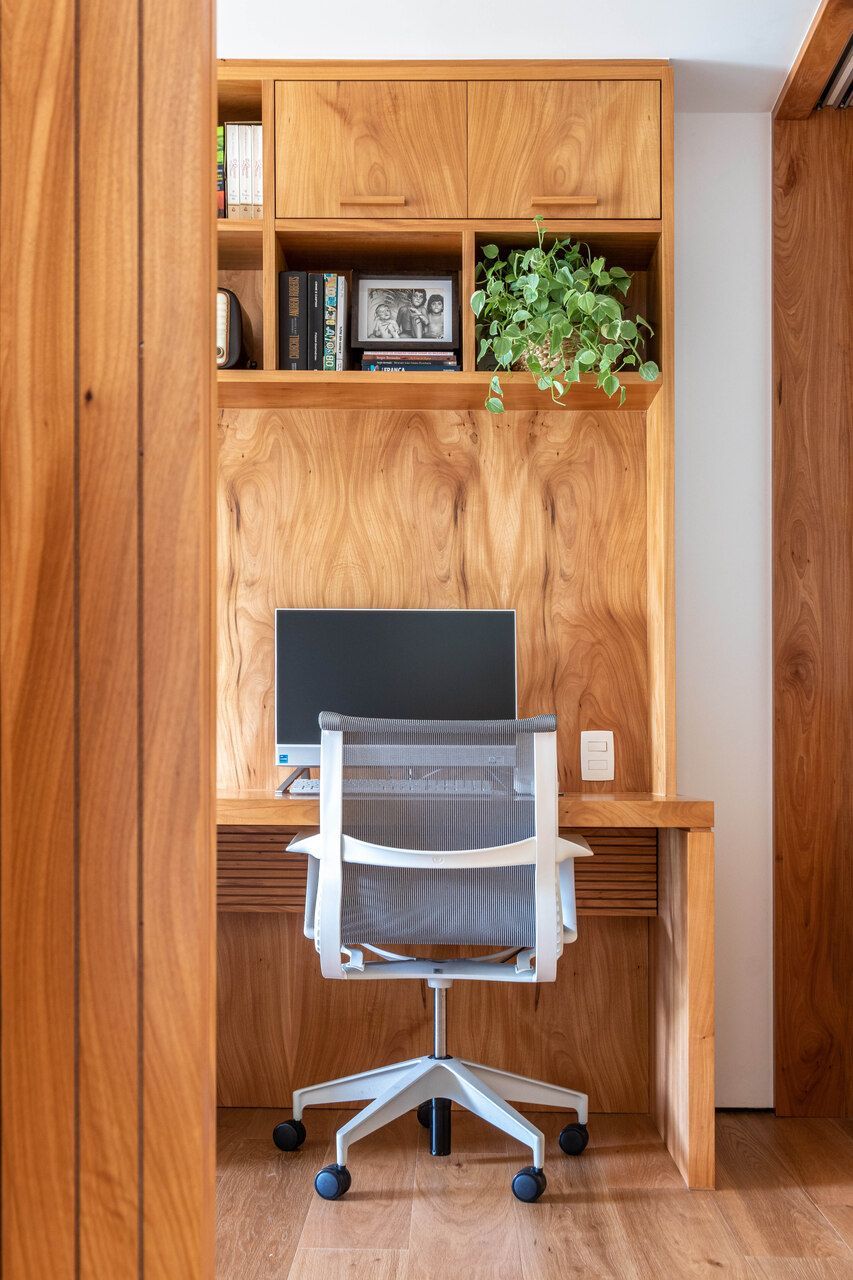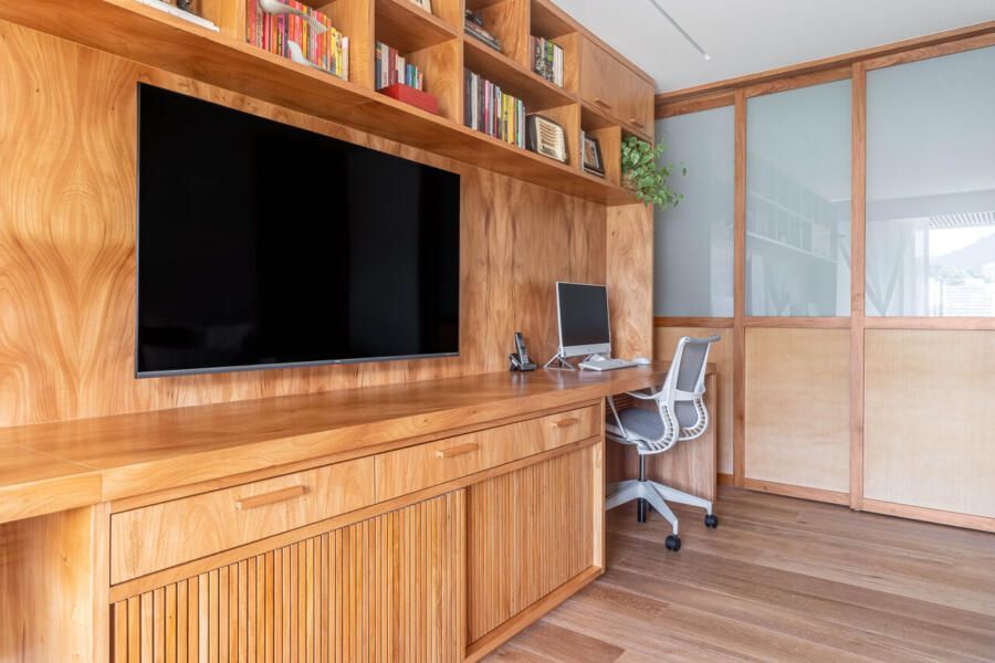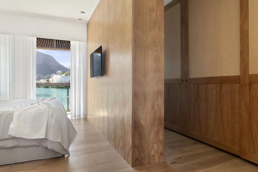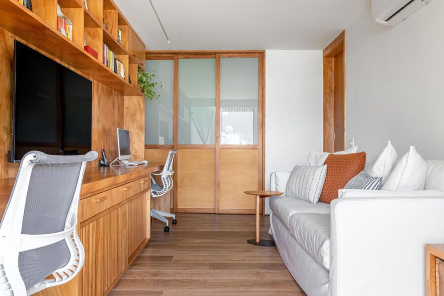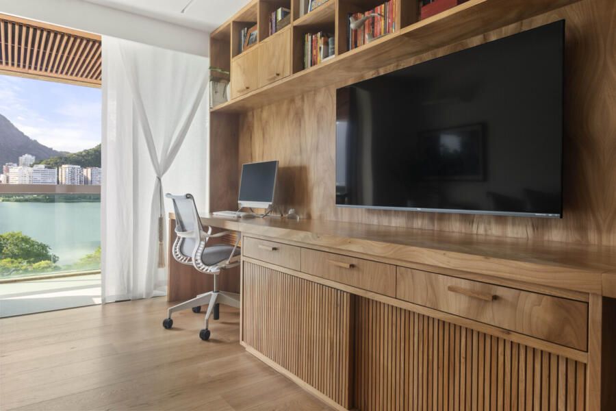Após a reforma, o apartamento passou a contar com sala, varanda, escritório, circulação íntima, suíte do casal, duas suítes para as filhas, cozinha com copa integrada, lavanderia e dependência de serviço. A área social — composta por sala, escritório e suíte master — se abre generosamente para a varanda, reforçando a relação constante com a paisagem da Lagoa. Posicionado entre a sala e a circulação íntima, o escritório funciona também como sala de TV e ganha versatilidade graças às portas de correr em madeira, vidro e palha, que permitem integração, ventilação e privacidade conforme o momento.