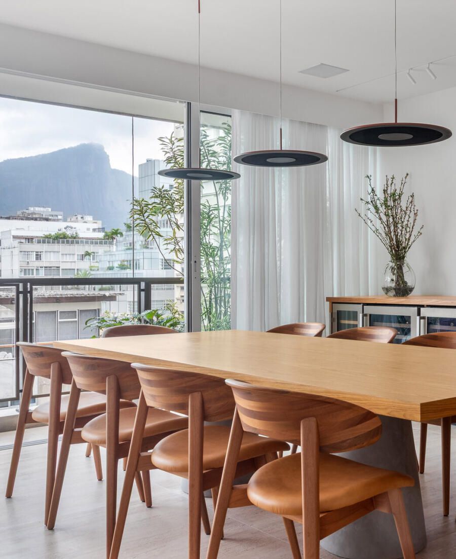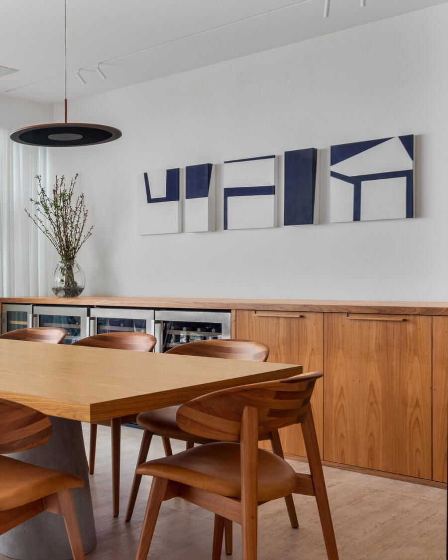 O projeto de interiores segue uma linha contemporânea, atemporal e elegante, pensado para amadurecer junto com a família. A curadoria privilegia o design brasileiro, combinando peças clássicas e contemporâneas com naturalidade. Na sala de estar, o sofá Vírgula, de Arthur de Menezes, divide a cena com a mesa de centro Pigmento, de Gerson de Oliveira e Luciana Martins, e a poltrona Renata, de Sergio Rodrigues. Um conjunto que equilibra leveza formal e presença.