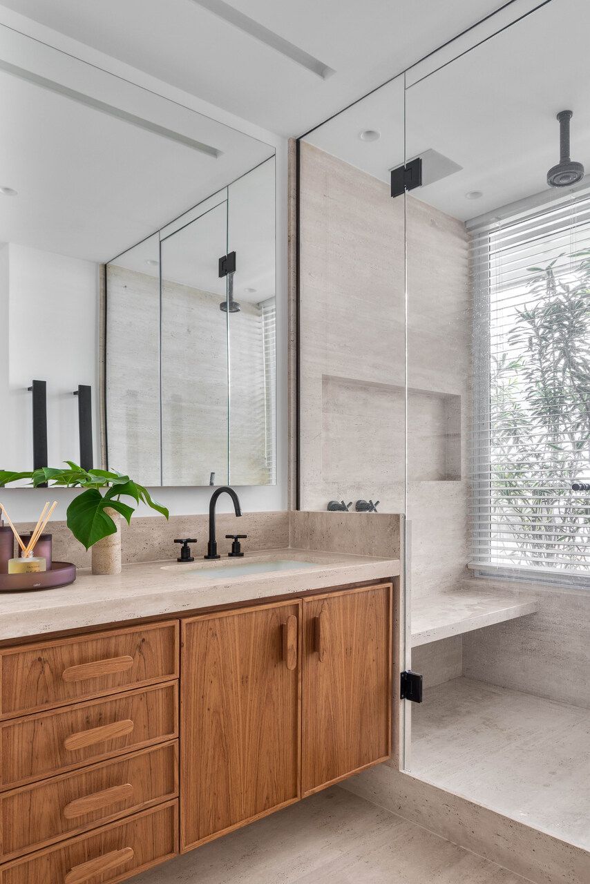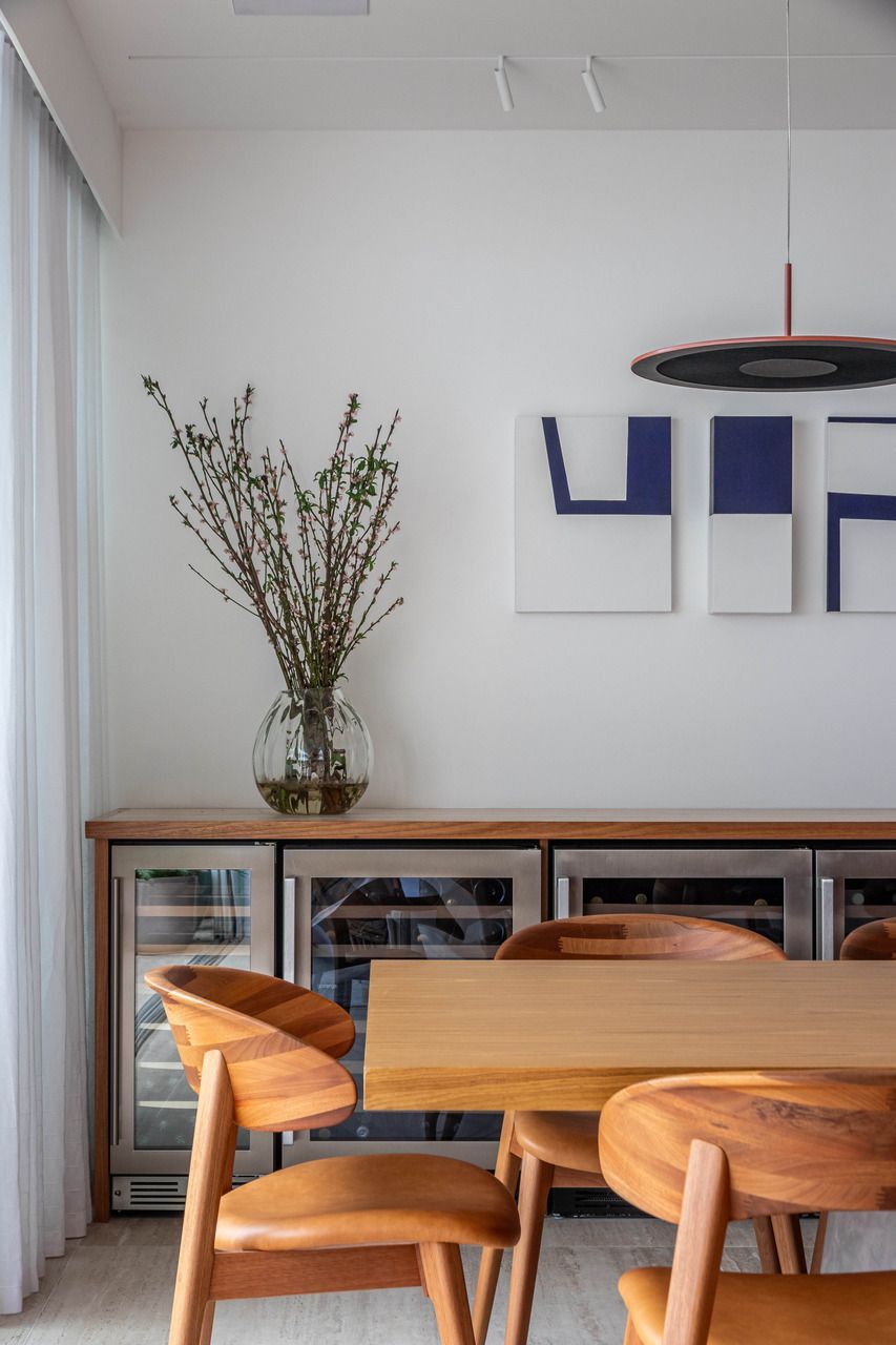 Na sala de jantar, a mesa Concrete, do Estudiobola, estabelece um diálogo preciso com as cadeiras Ostra, do estúdio Mula Preta. A base neutra do projeto permite que cada peça respire, enquanto os materiais criam camadas de textura e sofisticação. O mármore Travertino Navona define o piso da área social, refletindo a luz que atravessa o apartamento, e a peroba-mica aquece a ala íntima com seu tom amadeirado.