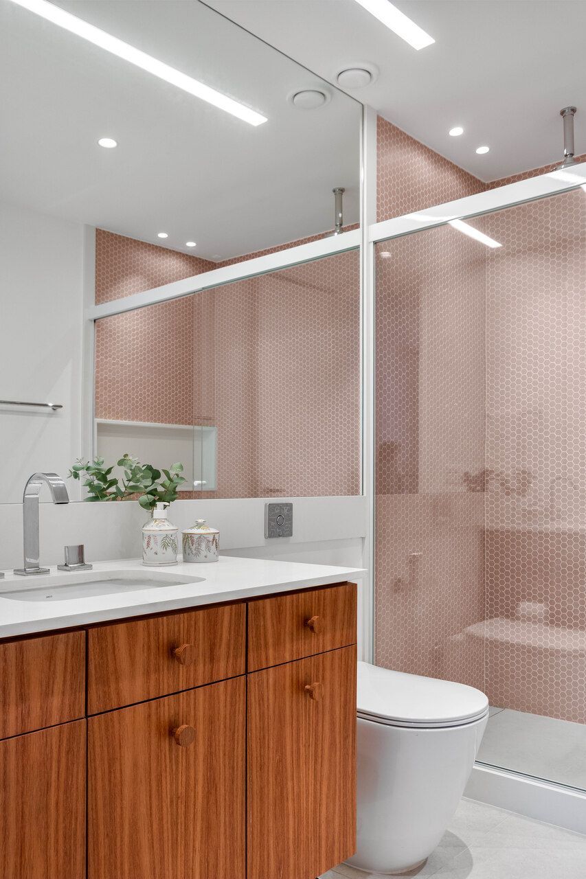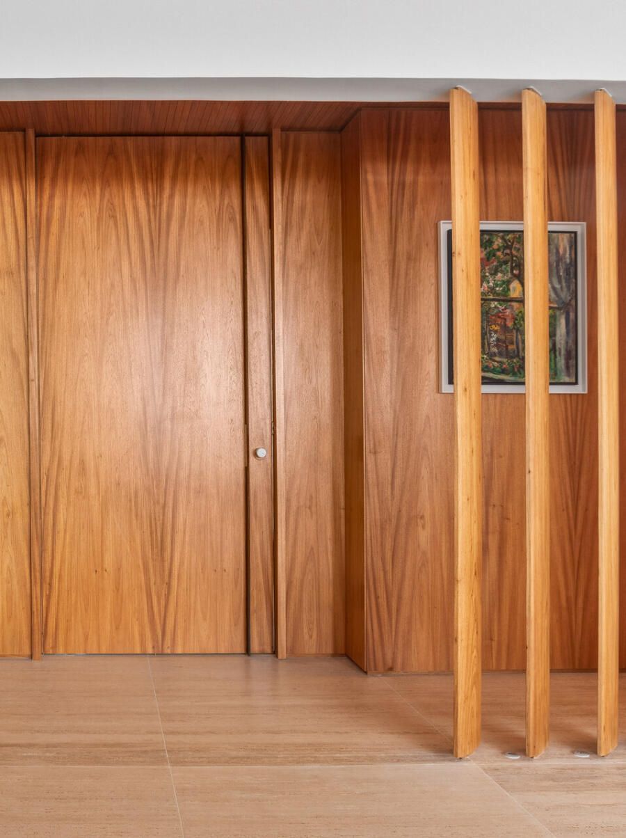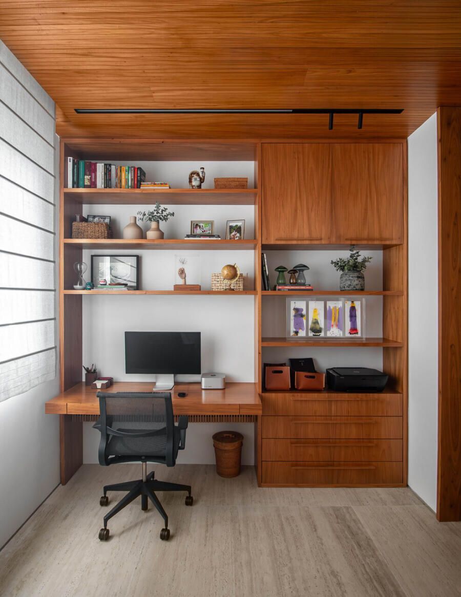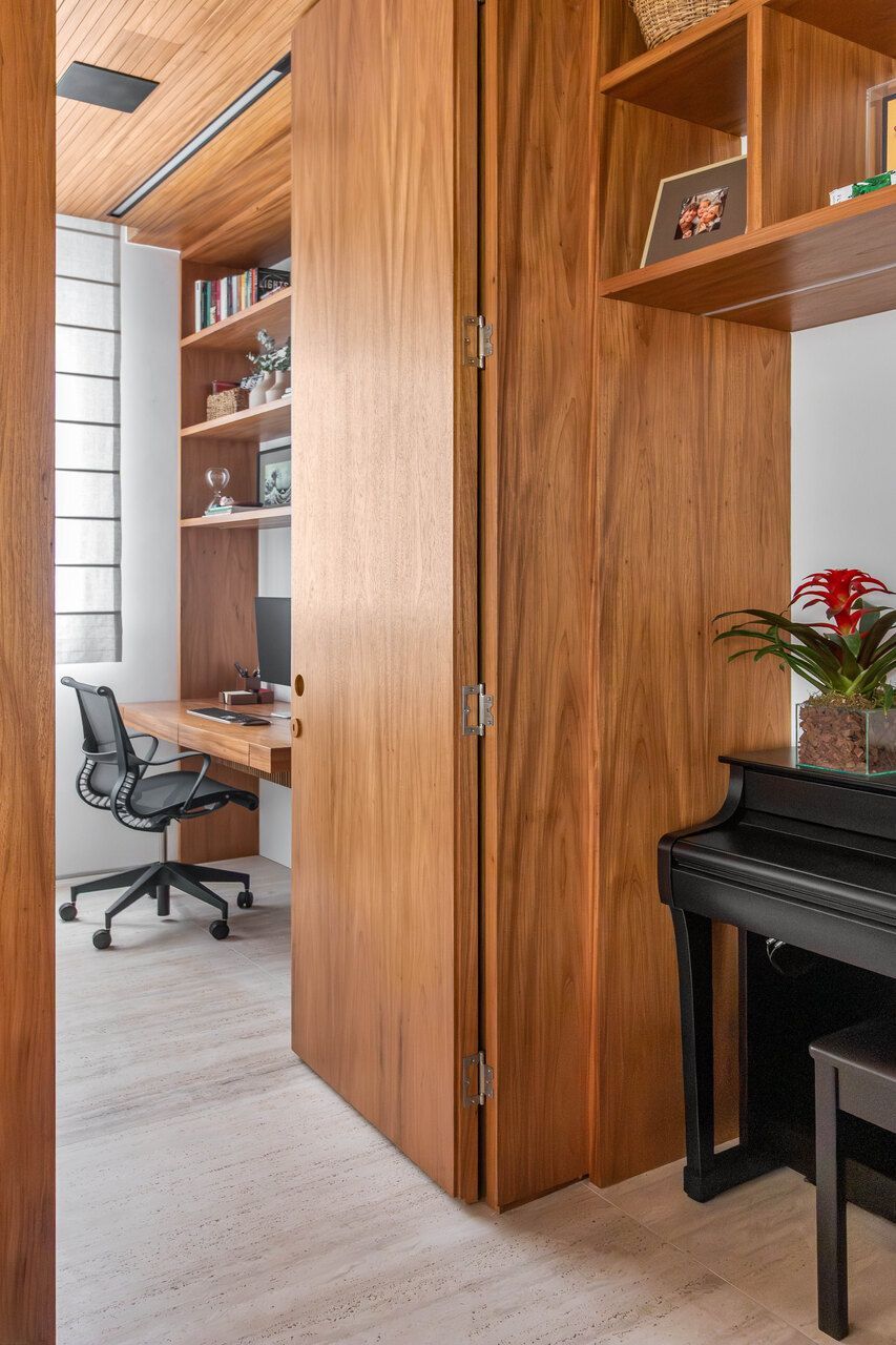 O imóvel, com planta original compartimentada e apenas uma suíte entre os quatro quartos, pedia uma reorganização profunda. O desejo era claro: cada criança deveria ter seu próprio quarto e banheiro, o casal sonhava com uma suíte confortável com closet, e a rotina profissional exigia um escritório reservado para o marido. As arquitetas reestruturaram os espaços para criar duas suítes e dois quartos atendidos por dois banheiros externos, equilibrando funcionalidade e fluidez.