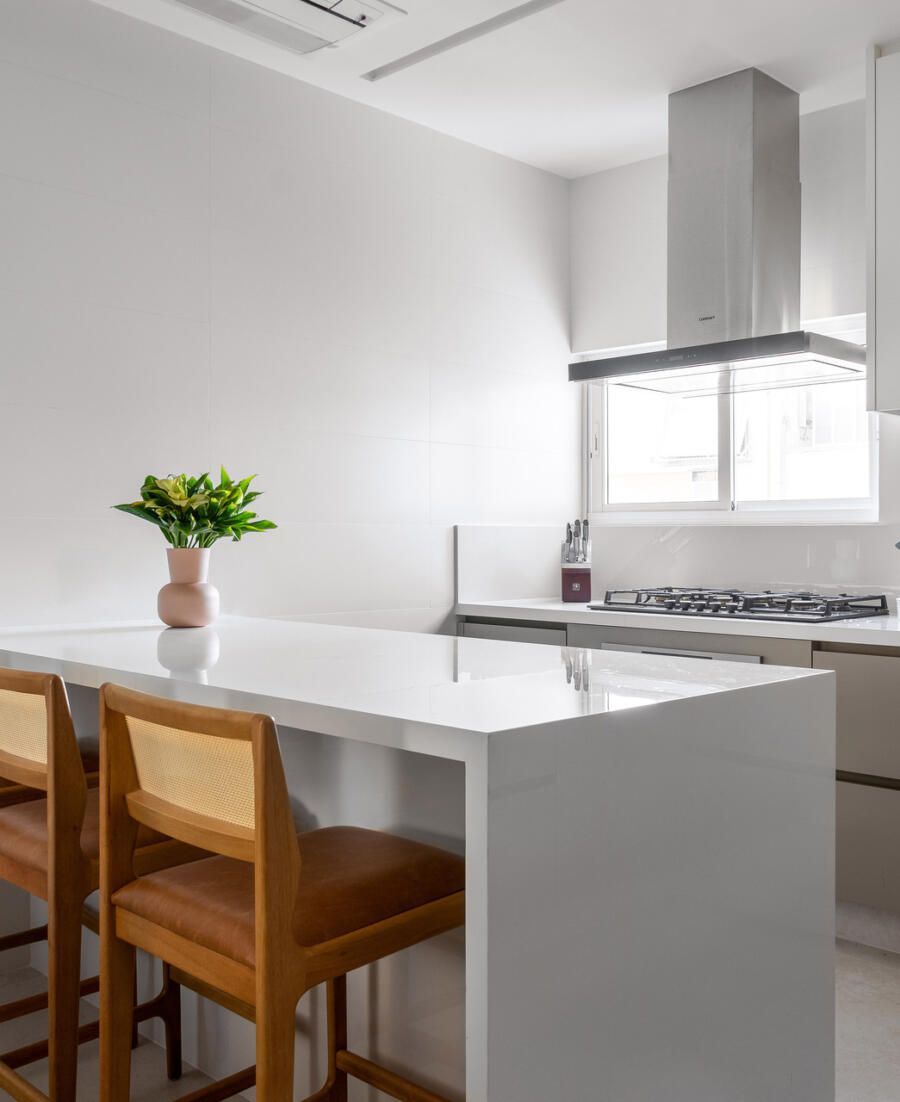 A área social ganhou respiro ao ter as paredes da antiga sala de TV removidas, integrando estar, jantar e home theater em um único ambiente contínuo. Um dos quartos de serviço foi eliminado para ampliar a cozinha, agora mais generosa e conectada à dinâmica da casa. Já a antiga copa deu lugar ao escritório, com acesso direto pela sala, garantindo praticidade sem abrir mão da privacidade necessária ao trabalho.