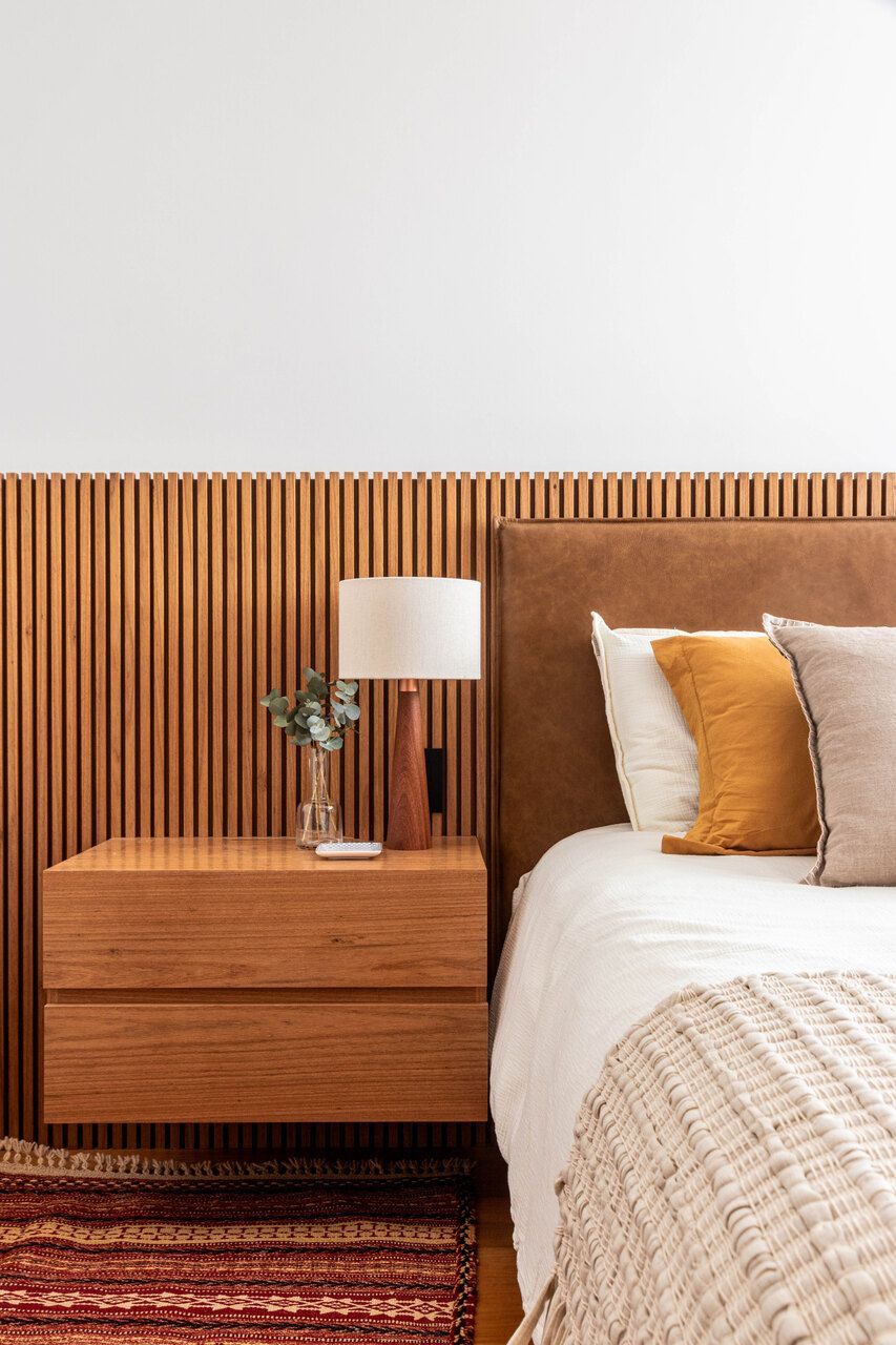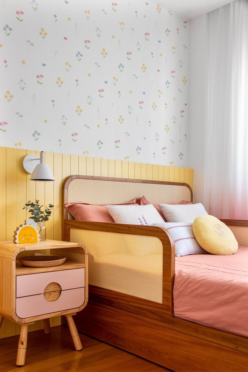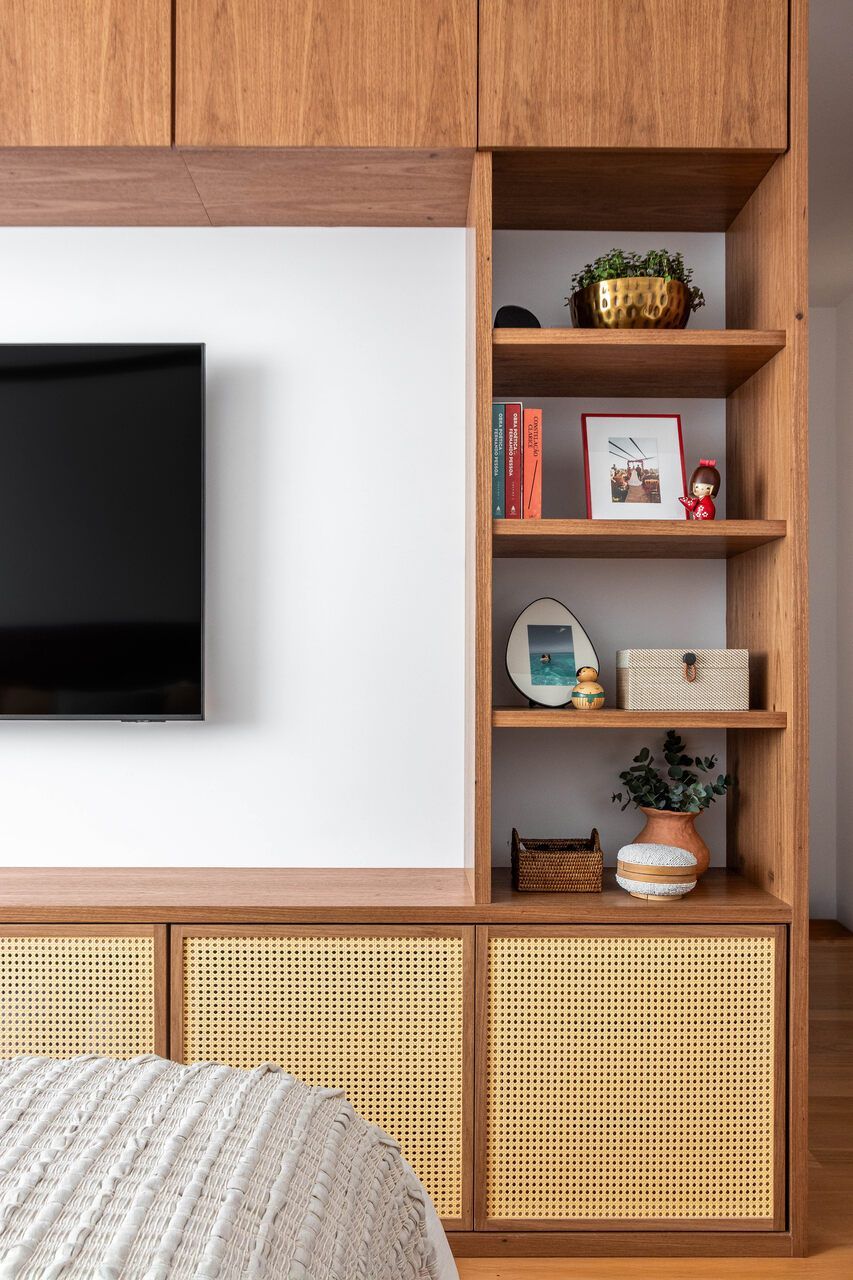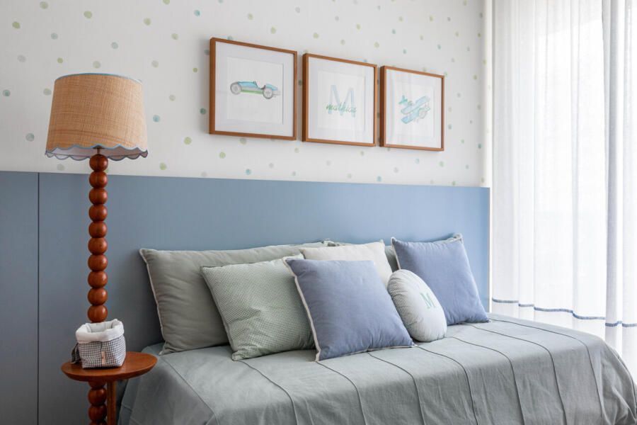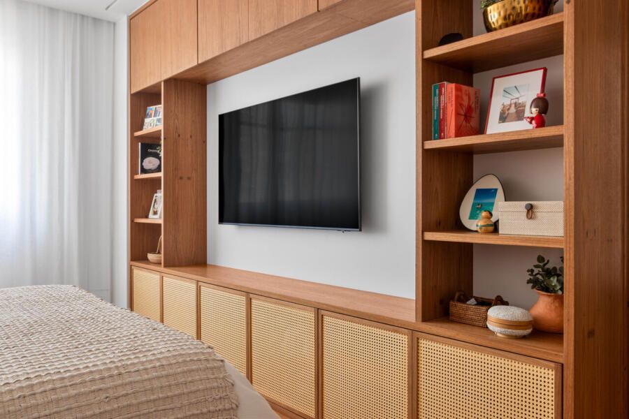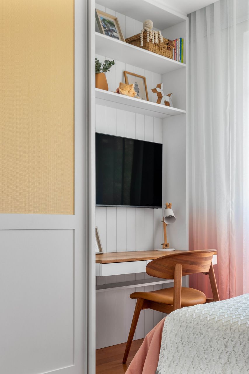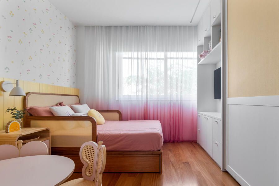 As paredes predominantemente brancas ampliam a sensação de luminosidade, enquanto a marcenaria em freijó natural reforça a atmosfera acolhedora. Na suíte do casal, tons suaves convidam ao descanso; nos quartos das crianças, cores vibrantes e uma atmosfera lúdica traduzem personalidade e afeto.