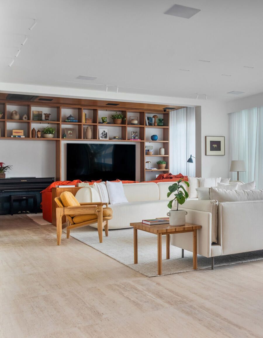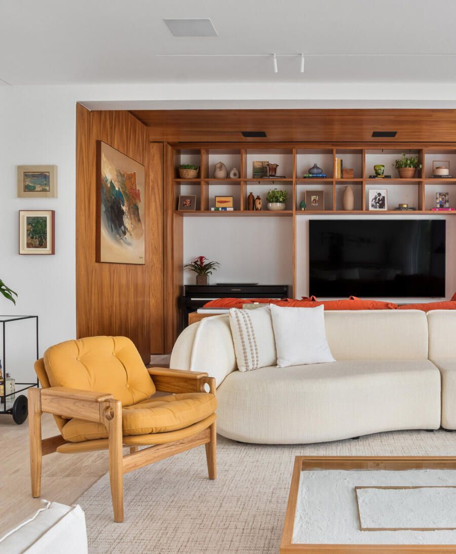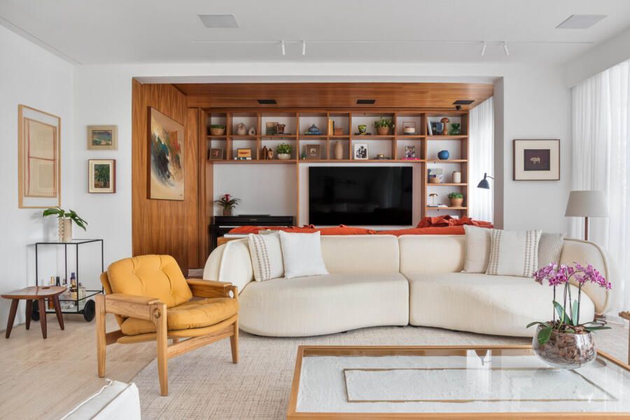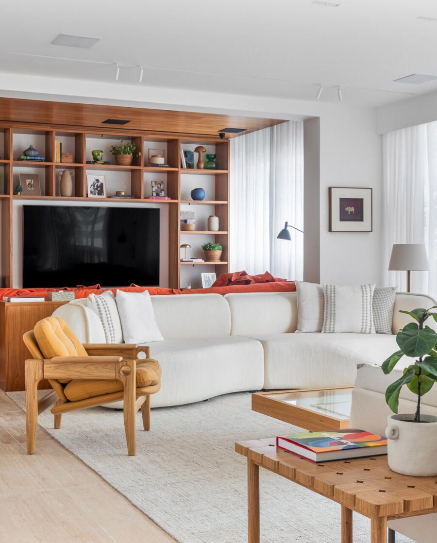 “Na sala, a cor aparece de forma pontual e estratégica — no sofá cereja do home theater e nas obras de arte.”