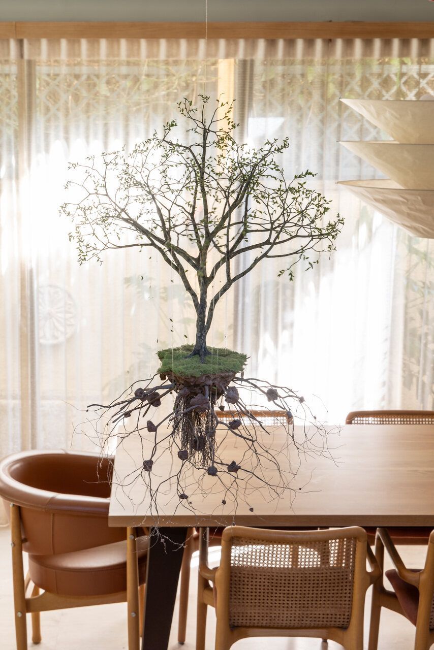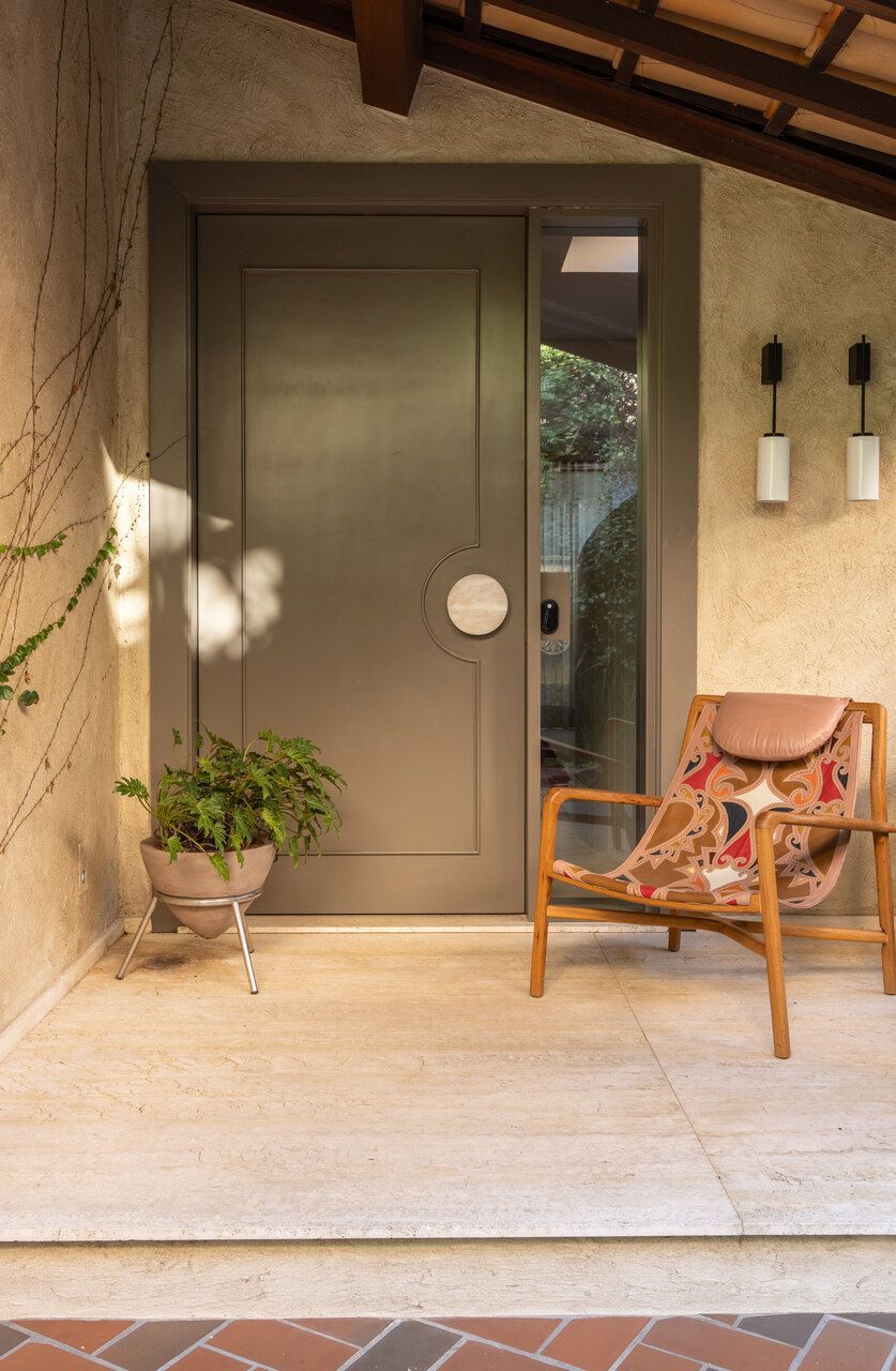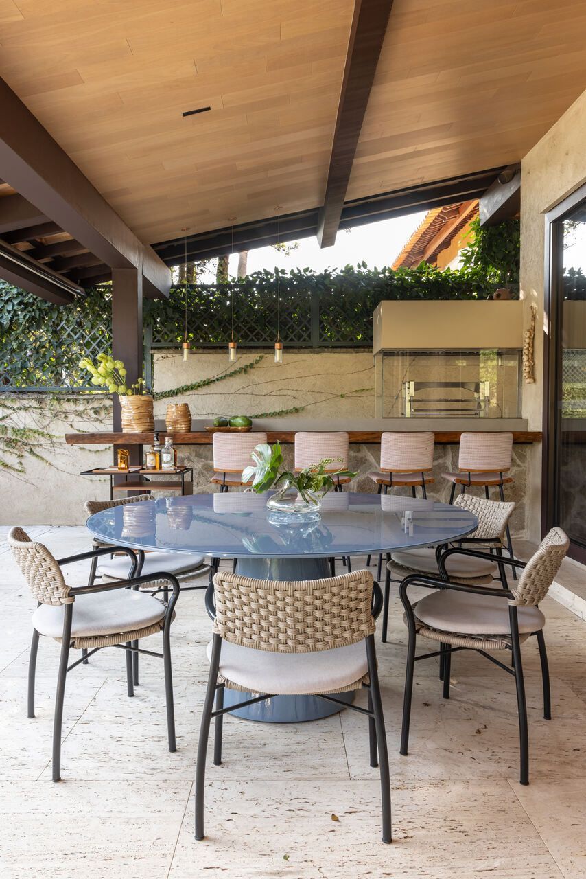 A área social ganhou uma nova configuração e se tornou o coração da casa. A sala foi reduzida para dar lugar a uma varanda coberta, hoje palco de encontros entre amigos e longos almoços de fim de semana. Com churrasqueira, mesa ampla e estar com vista para o verde, o ambiente reflete o espírito do projeto: receber com conforto. A paisagista Cristina Araujo completou o cenário com espécies tropicais e volumes orgânicos, criando uma transição fluida entre dentro e fora.