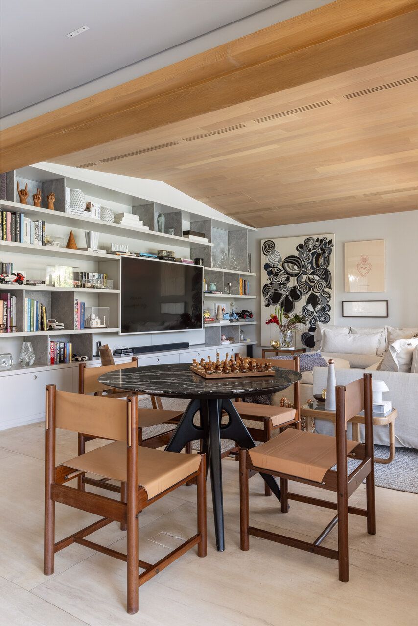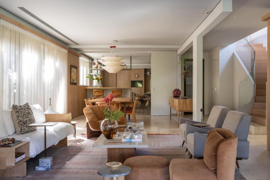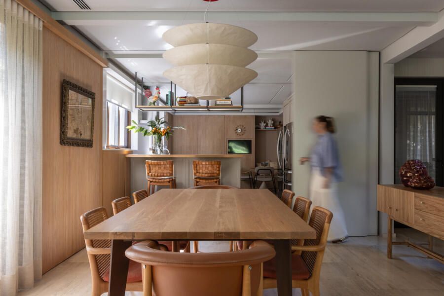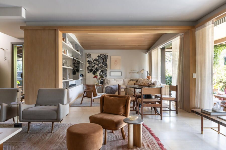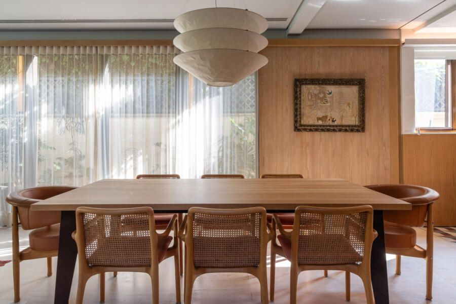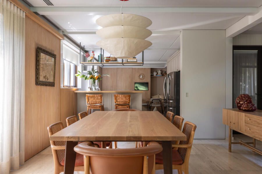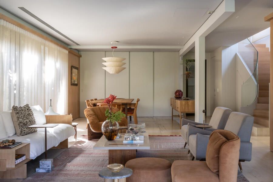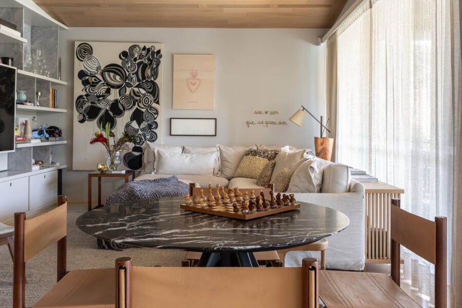 Nos interiores, o projeto abraça o afeto e a memória. Grande parte do mobiliário veio do antigo apartamento da família, apenas com tapetes trocados de lugar, tecidos renovados e novas peças pontuais completando o conjunto. A mistura de histórias e texturas trouxe autenticidade à casa sem abrir mão do conforto. O entrosamento entre arquiteto e clientes foi essencial para o resultado, com decisões certeiras e um olhar maduro sobre o que realmente importa.