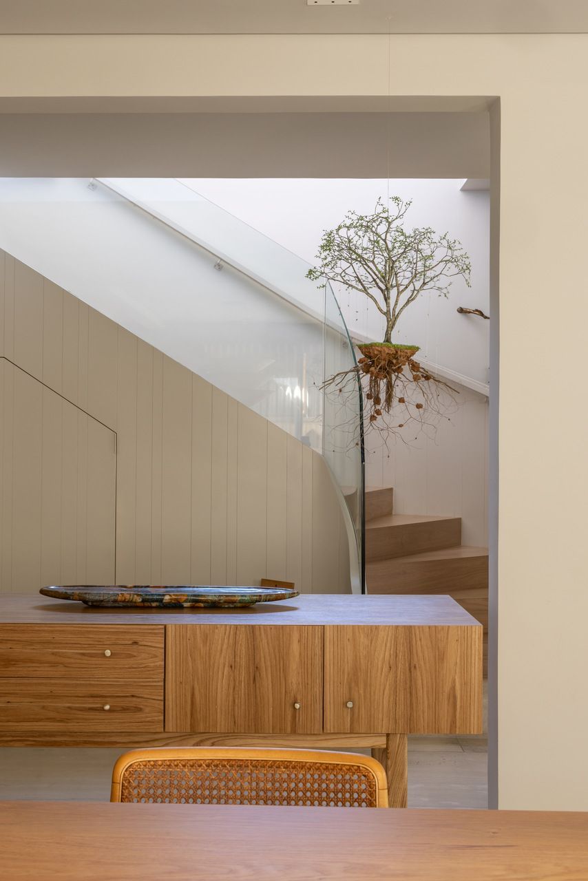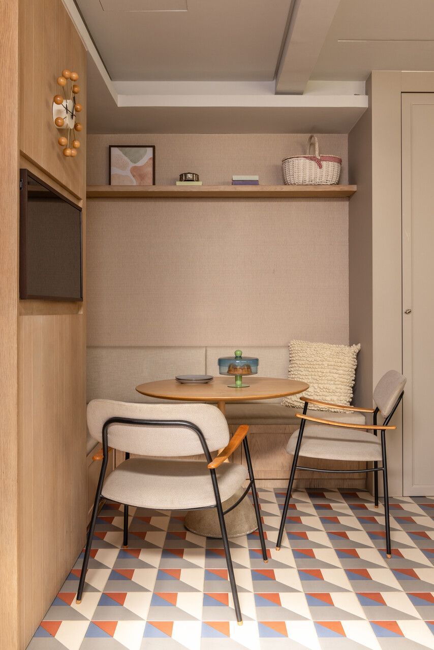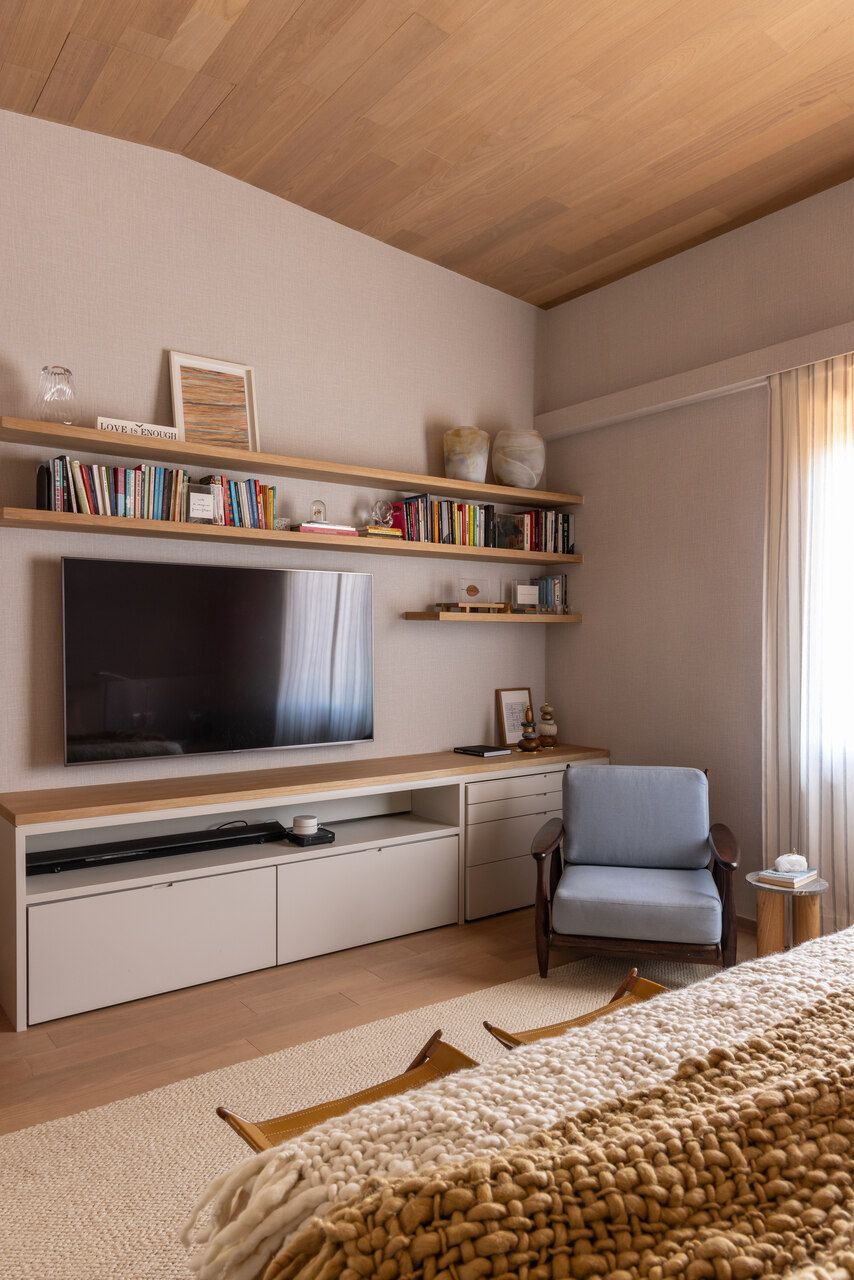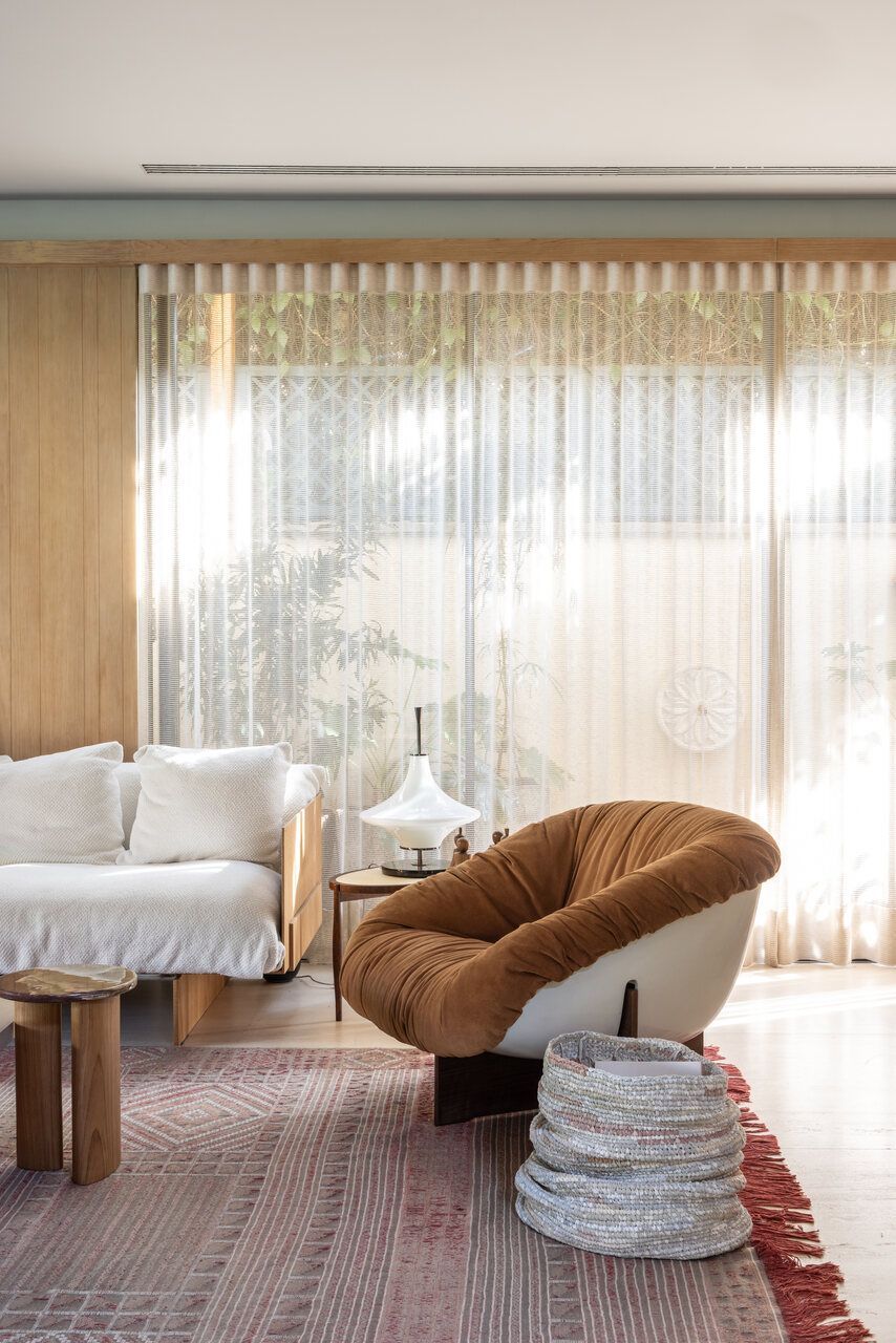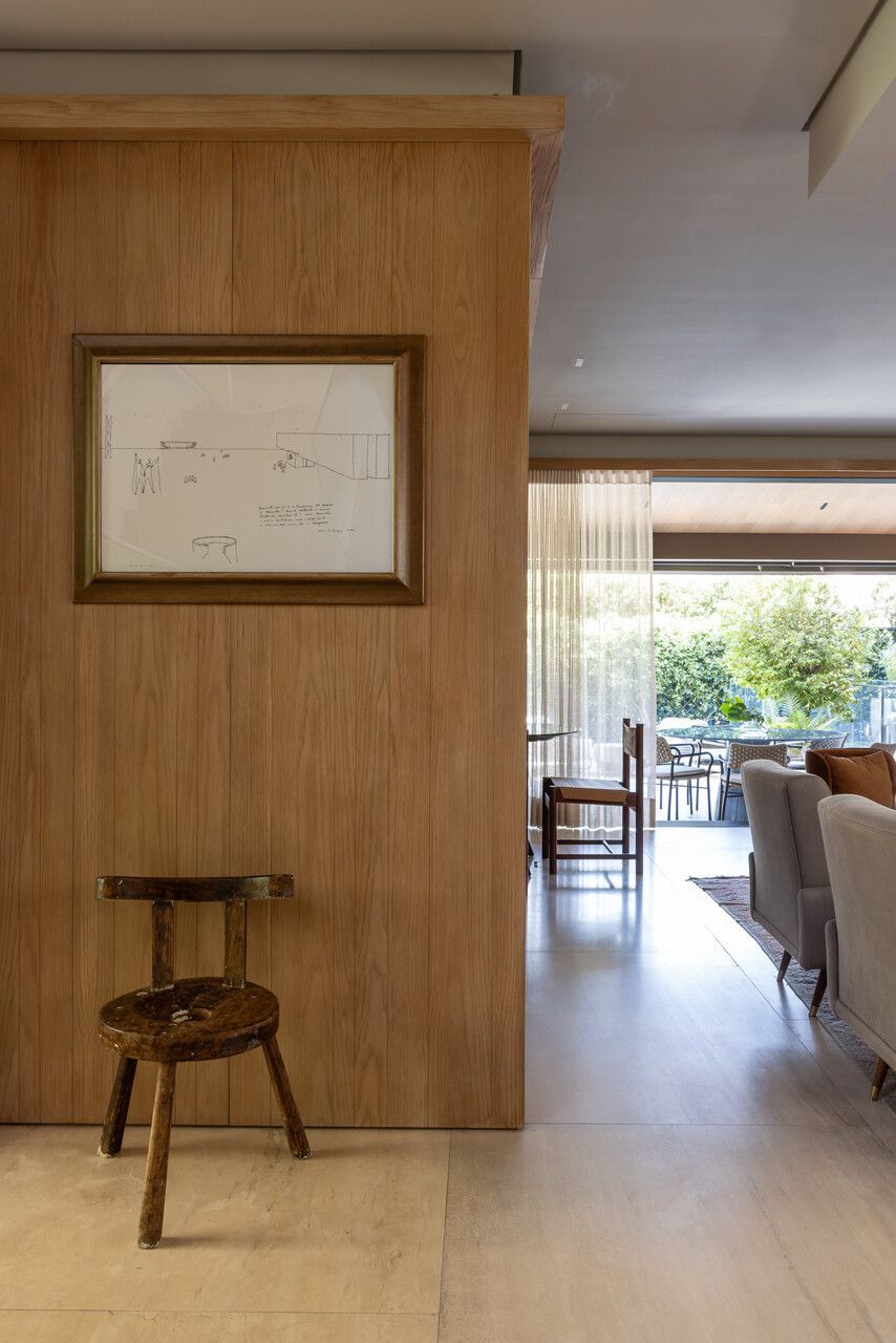 Nos interiores, o projeto abraça o afeto e a memória. Grande parte do mobiliário veio do antigo apartamento da família, apenas com tapetes trocados de lugar, tecidos renovados e novas peças pontuais completando o conjunto. A mistura de histórias e texturas trouxe autenticidade à casa sem abrir mão do conforto. O entrosamento entre arquiteto e clientes foi essencial para o resultado, com decisões certeiras e um olhar maduro sobre o que realmente importa.