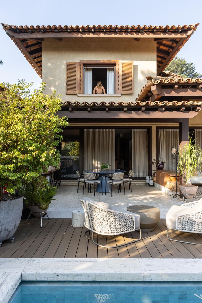Foi uma reforma enorme. O condomínio permitia pouquíssimas alterações na fachada, então mantivemos o mesmo modelo de telhado, caixilhos, texturas etc., mas tudo novo e modernizado. Das grandes alterações que fizemos, foi diminuir a sala para ganhar uma varanda coberta com churrasqueira, mesa de refeições e estar. E a outra foi fazer uma piscina e, abaixo da piscina, um outro andar com os vestiários, lugar para massagem, sauna e área de repouso. Esse era o grande pedido: um jardim, muita vegetação e ar livre para as crianças e os cachorros.”