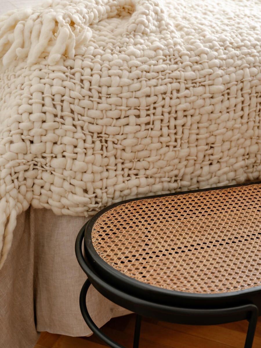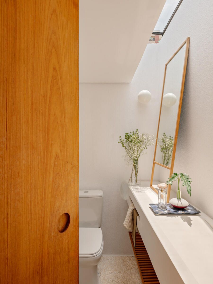 No pavimento superior, a área íntima se desenrola em torno de uma circulação linear iluminada por uma grande abertura zenital, uma janela para o céu que banha o corredor de luz natural. A suíte máster ocupa a fachada principal e recebe um banho em ladrilho hidráulico rosa e cimento queimado, com ventilação e iluminação também garantidas pela zenital. Os quartos das filhas mantêm o mesmo diálogo entre rusticidade e aconchego, com venezianas camarão ripadas em madeira e vistas para a copa do Araçá.