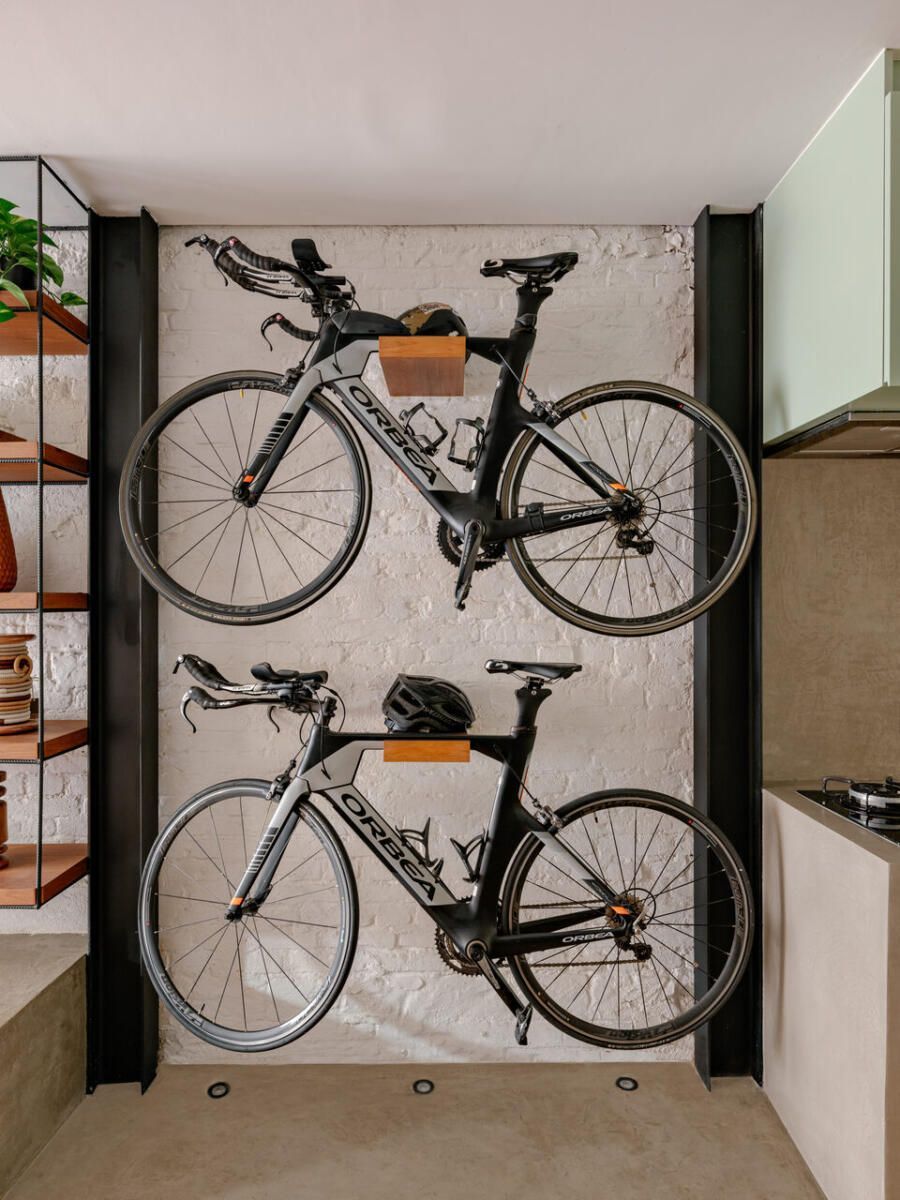 Com a chegada do primeiro bebê, a decisão foi imediata: demolir tudo e erguer uma casa completamente nova. A arquiteta Mona Singal, do escritório RUA 141 Arquitetura e Design, foi chamada para conduzir o projeto, onde a arquitetura industrial se transformou no fio condutor. Em um terreno estreito de 4×18 metros, o desafio era criar uma residência acolhedora, permeada pela natureza e com espaços amplos o suficiente para abrigar o estilo de vida ativo dos moradores e suas cinco bicicletas, que precisavam ocupar lugar de destaque no layout.