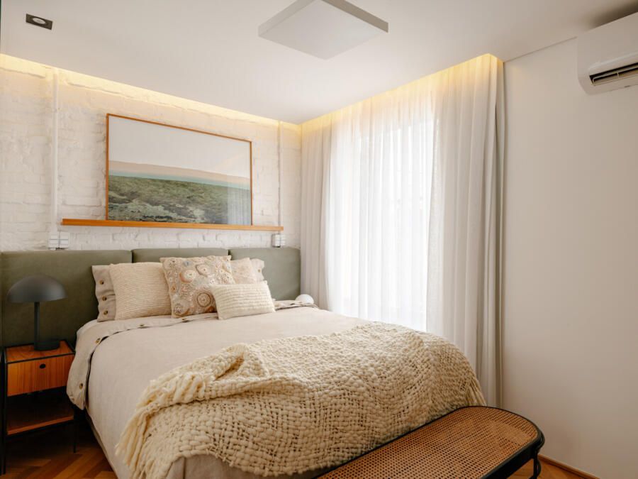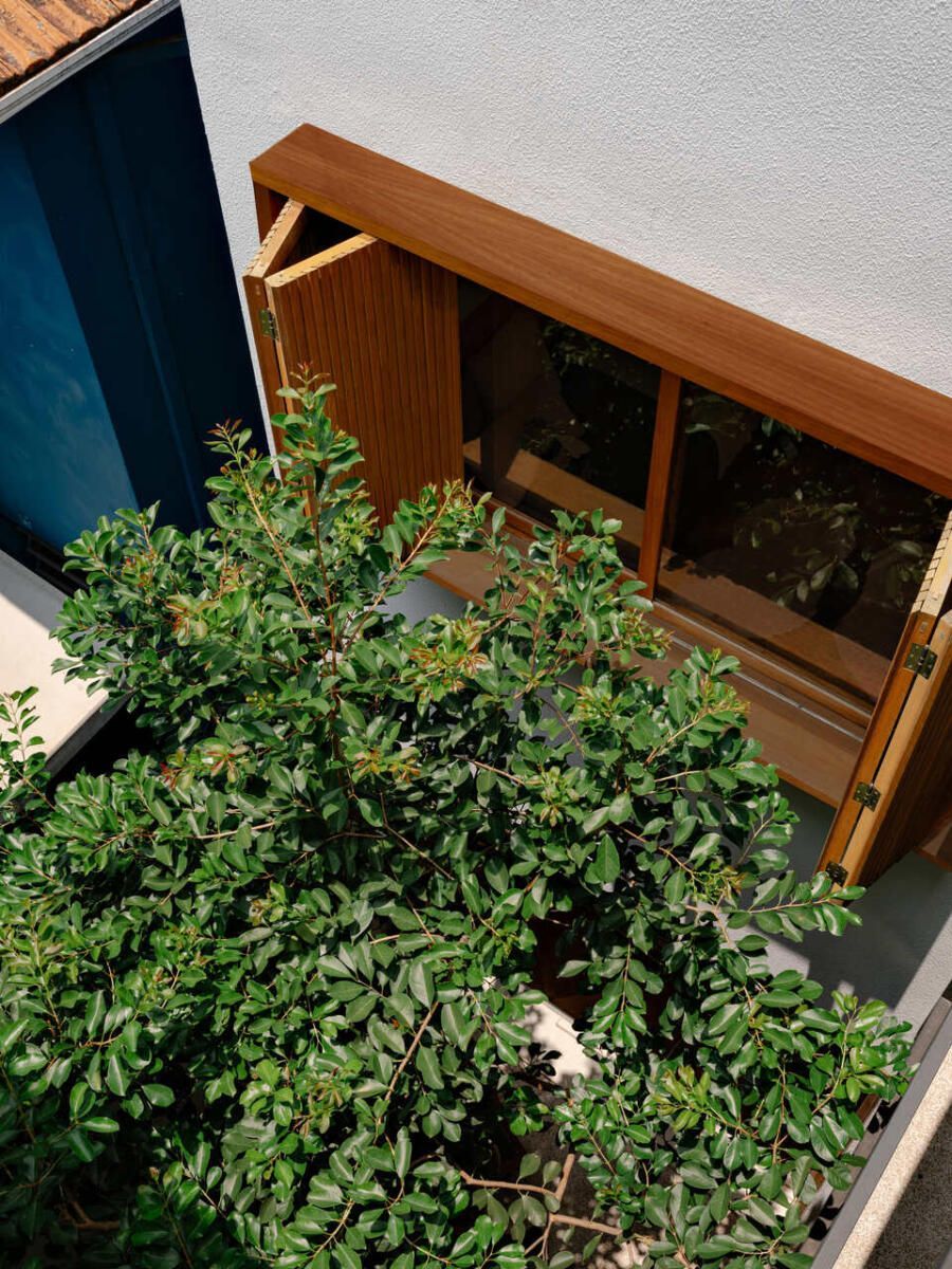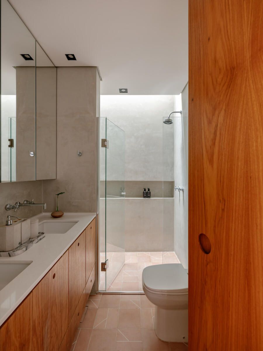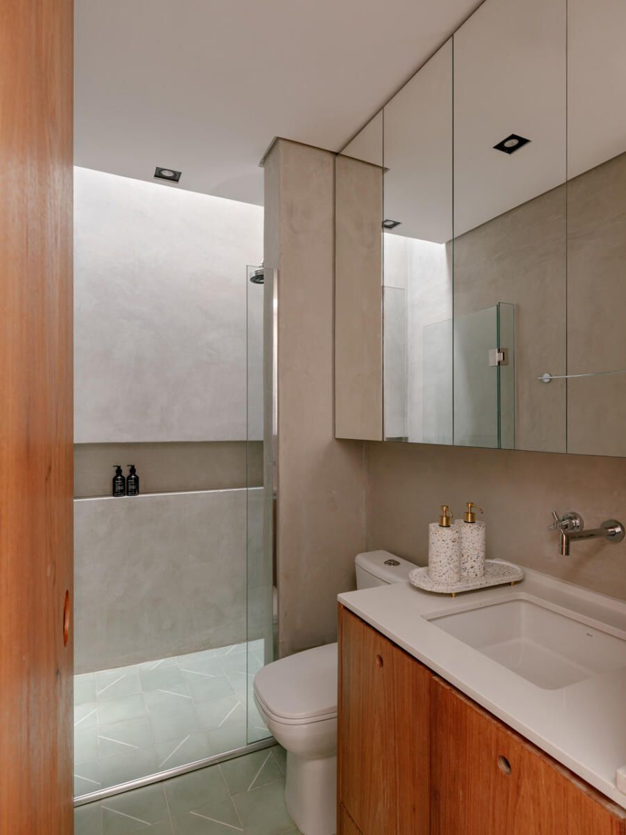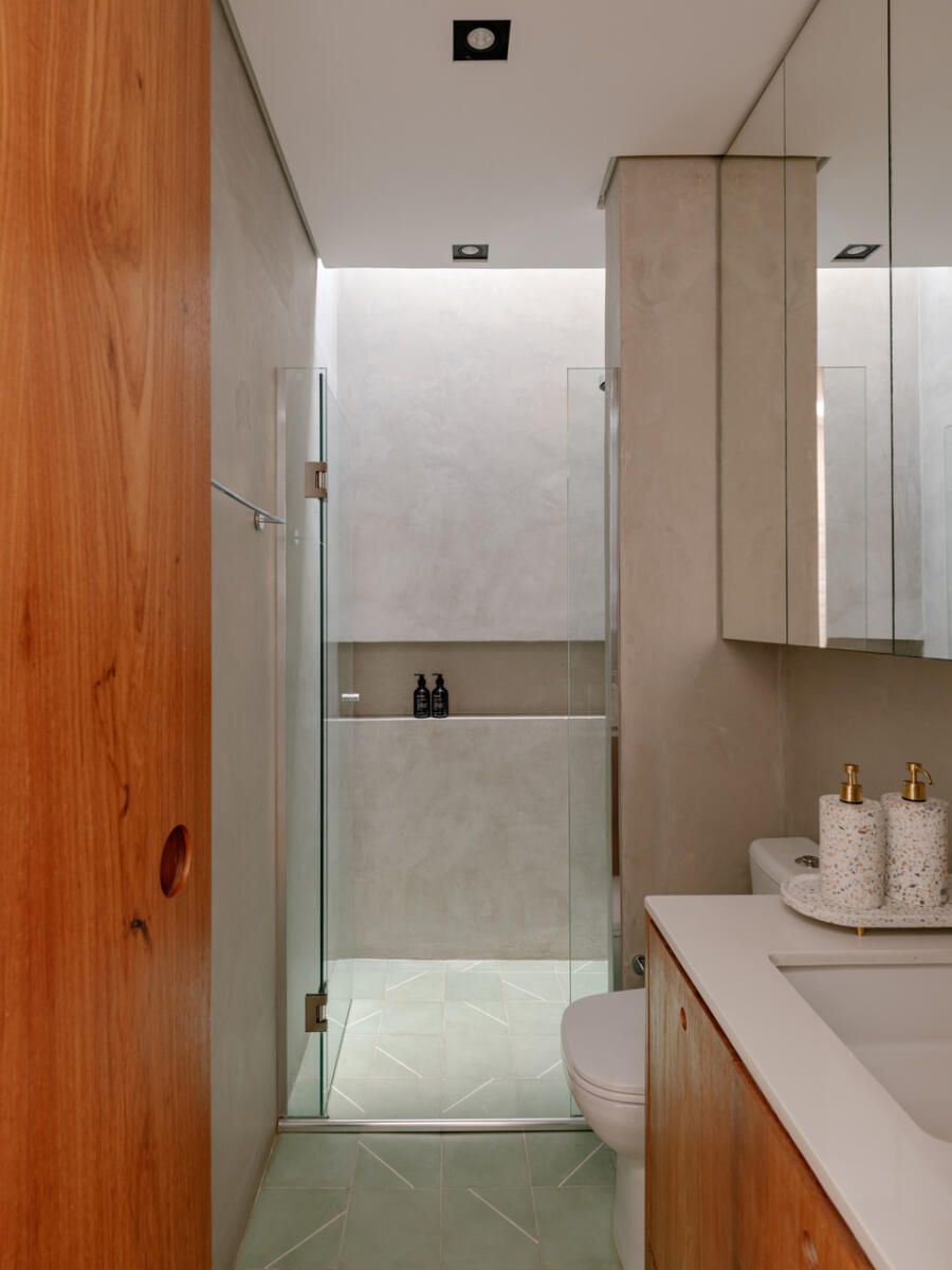 No pavimento superior, a área íntima se desenrola em torno de uma circulação linear iluminada por uma grande abertura zenital, uma janela para o céu que banha o corredor de luz natural. A suíte máster ocupa a fachada principal e recebe um banho em ladrilho hidráulico rosa e cimento queimado, com ventilação e iluminação também garantidas pela zenital. Os quartos das filhas mantêm o mesmo diálogo entre rusticidade e aconchego, com venezianas camarão ripadas em madeira e vistas para a copa do Araçá.