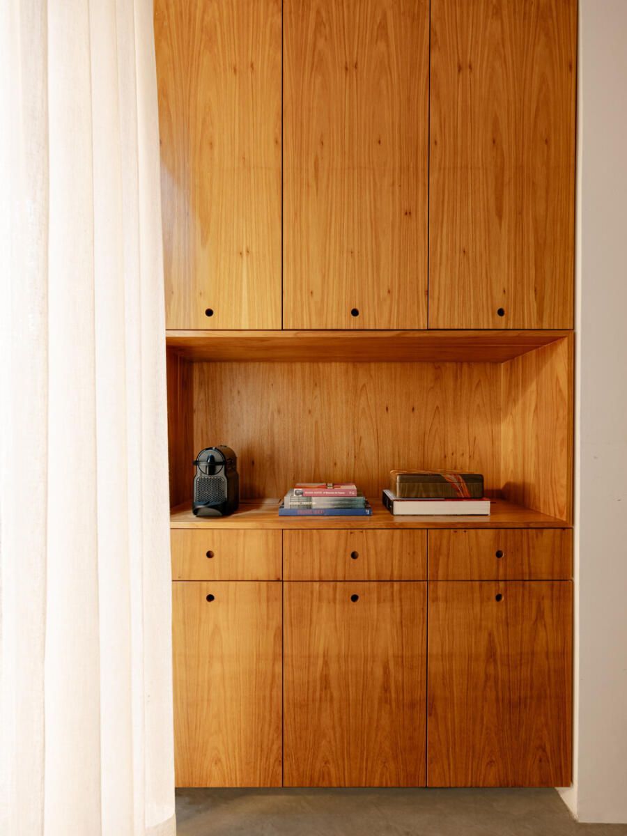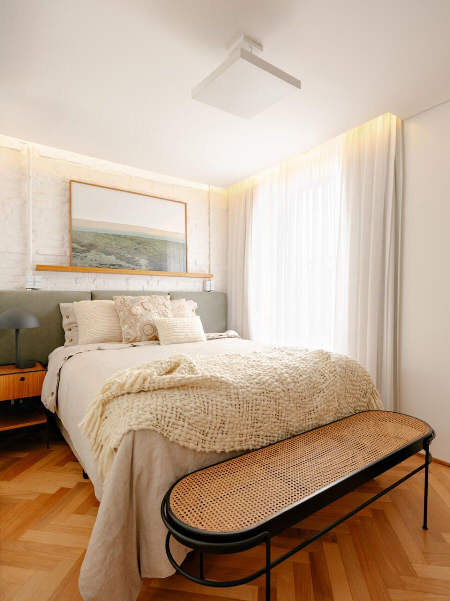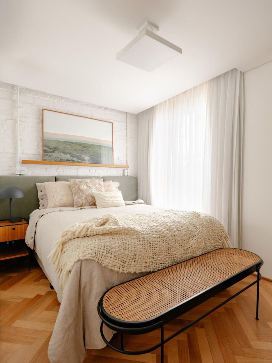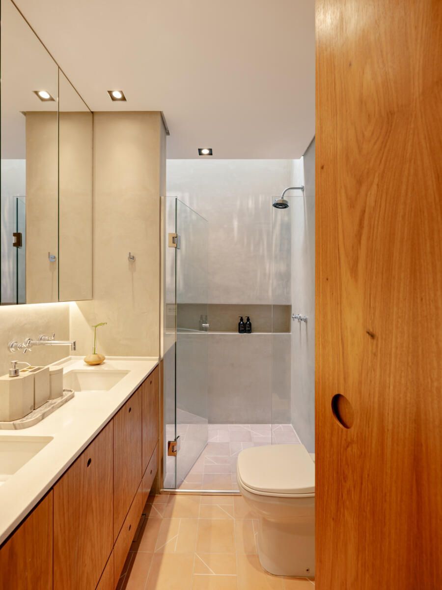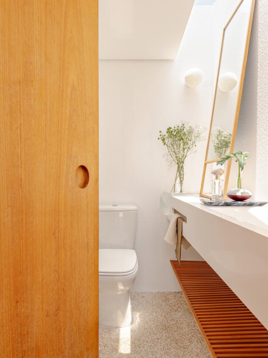 No pavimento superior, a área íntima se desenrola em torno de uma circulação linear iluminada por uma grande abertura zenital, uma janela para o céu que banha o corredor de luz natural. A suíte máster ocupa a fachada principal e recebe um banho em ladrilho hidráulico rosa e cimento queimado, com ventilação e iluminação também garantidas pela zenital. Os quartos das filhas mantêm o mesmo diálogo entre rusticidade e aconchego, com venezianas camarão ripadas em madeira e vistas para a copa do Araçá.