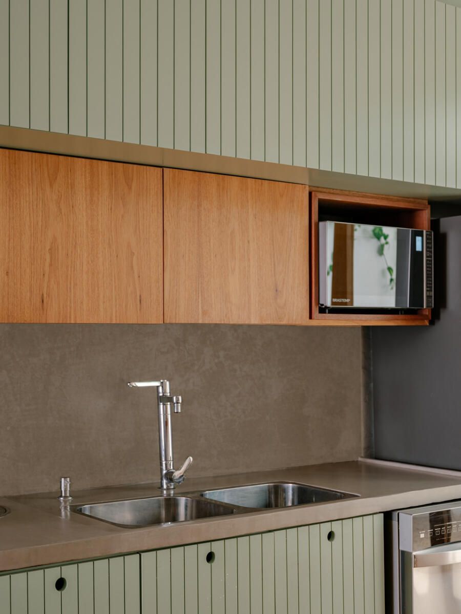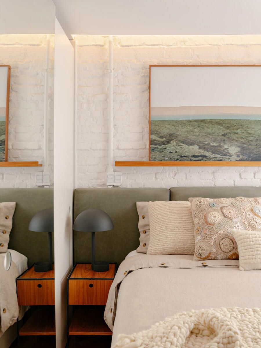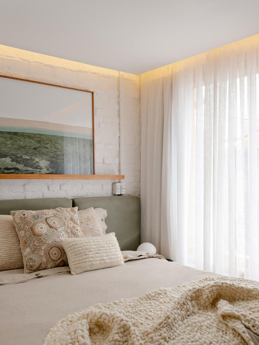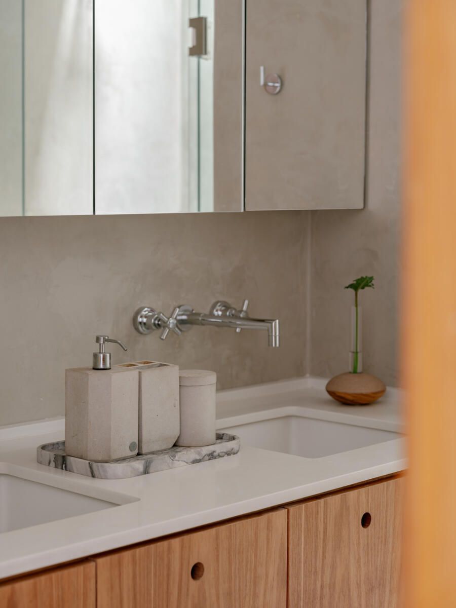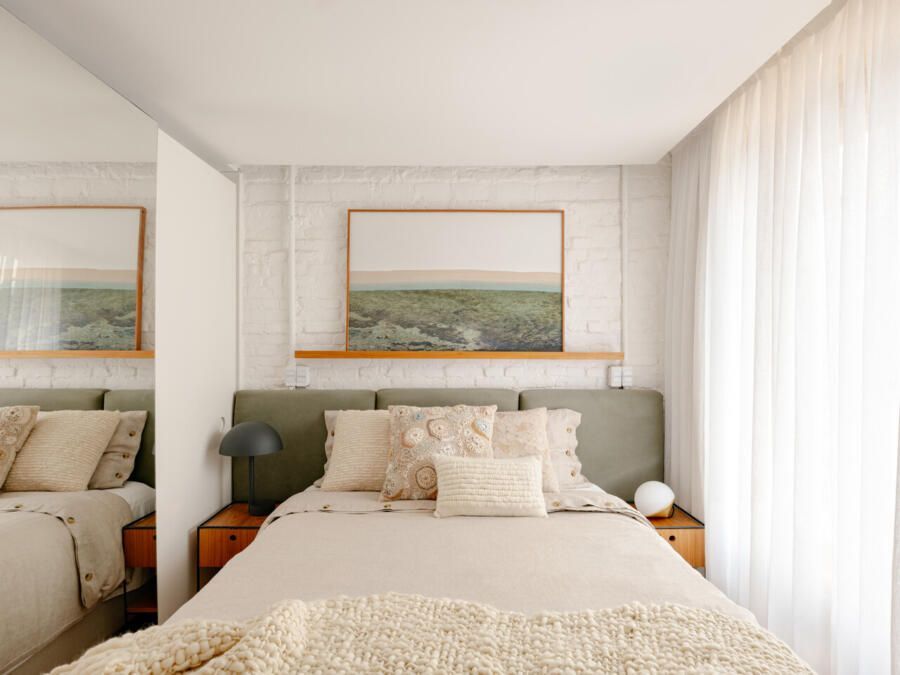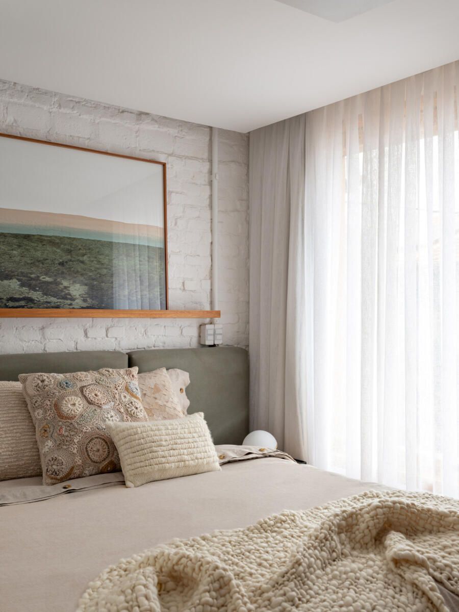 No pavimento superior, a área íntima se desenrola em torno de uma circulação linear iluminada por uma grande abertura zenital, uma janela para o céu que banha o corredor de luz natural. A suíte máster ocupa a fachada principal e recebe um banho em ladrilho hidráulico rosa e cimento queimado, com ventilação e iluminação também garantidas pela zenital. Os quartos das filhas mantêm o mesmo diálogo entre rusticidade e aconchego, com venezianas camarão ripadas em madeira e vistas para a copa do Araçá.