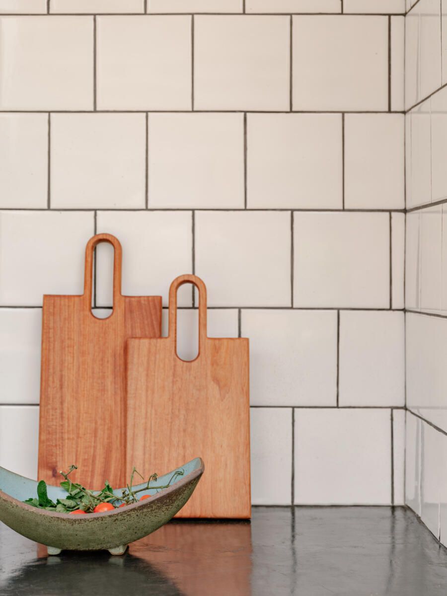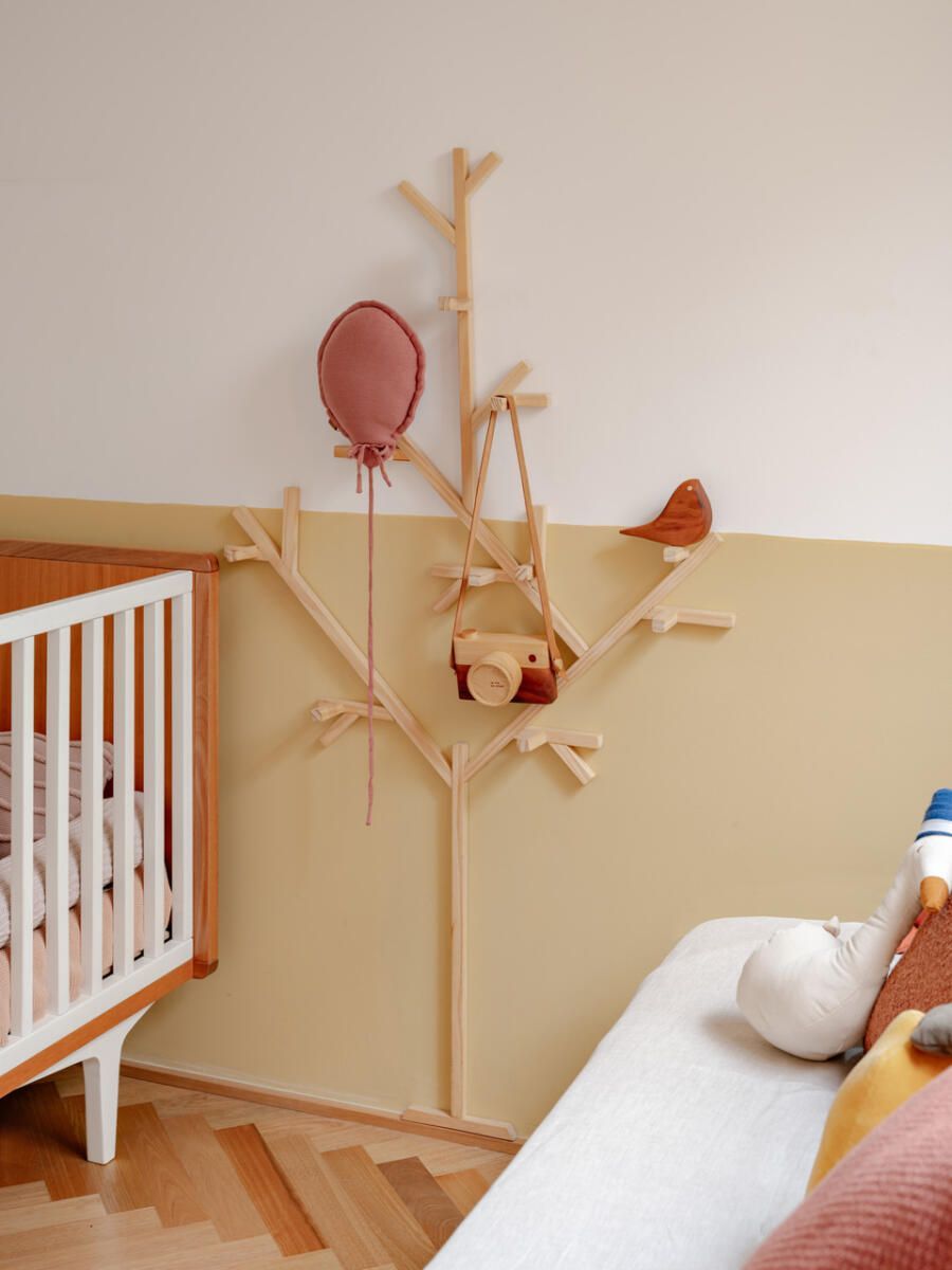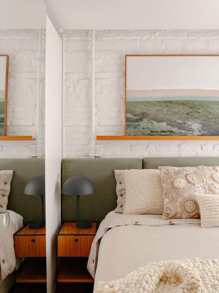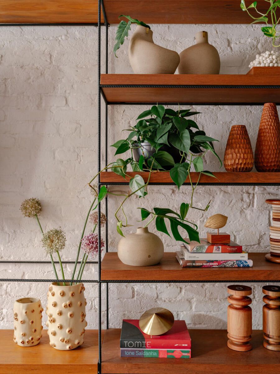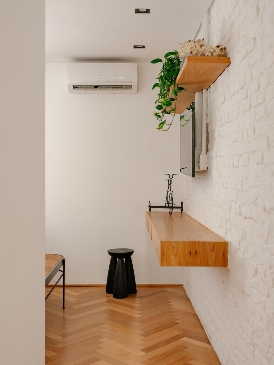 No pavimento superior, a área íntima se desenrola em torno de uma circulação linear iluminada por uma grande abertura zenital, uma janela para o céu que banha o corredor de luz natural. A suíte máster ocupa a fachada principal e recebe um banho em ladrilho hidráulico rosa e cimento queimado, com ventilação e iluminação também garantidas pela zenital. Os quartos das filhas mantêm o mesmo diálogo entre rusticidade e aconchego, com venezianas camarão ripadas em madeira e vistas para a copa do Araçá.