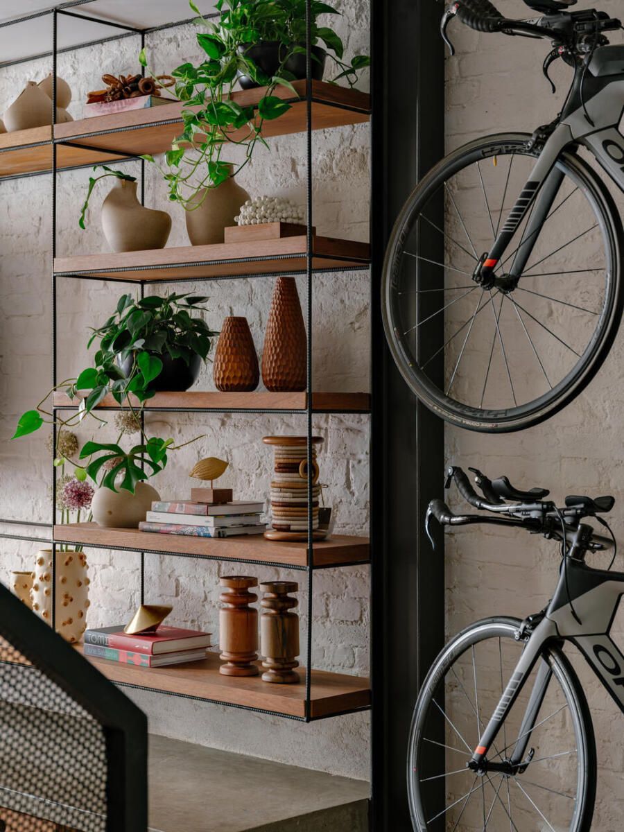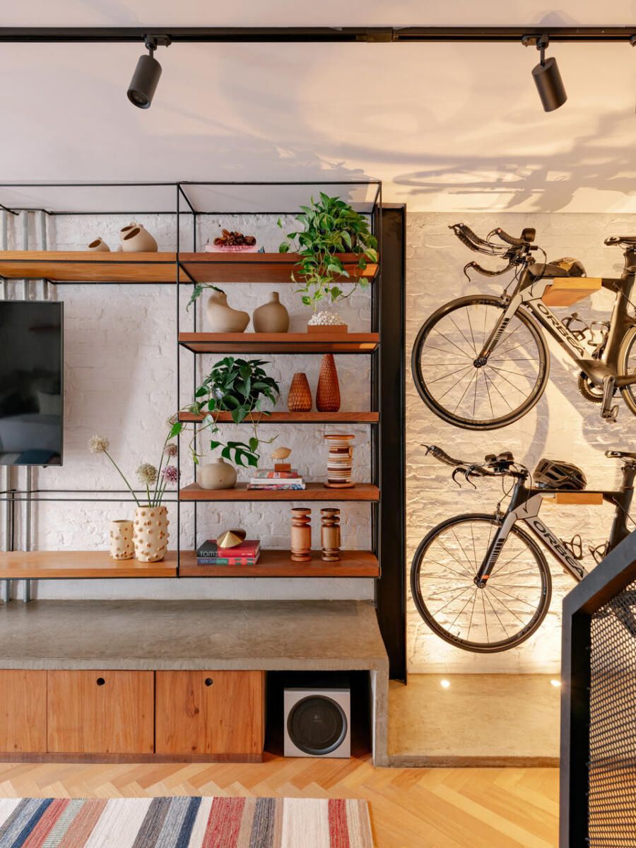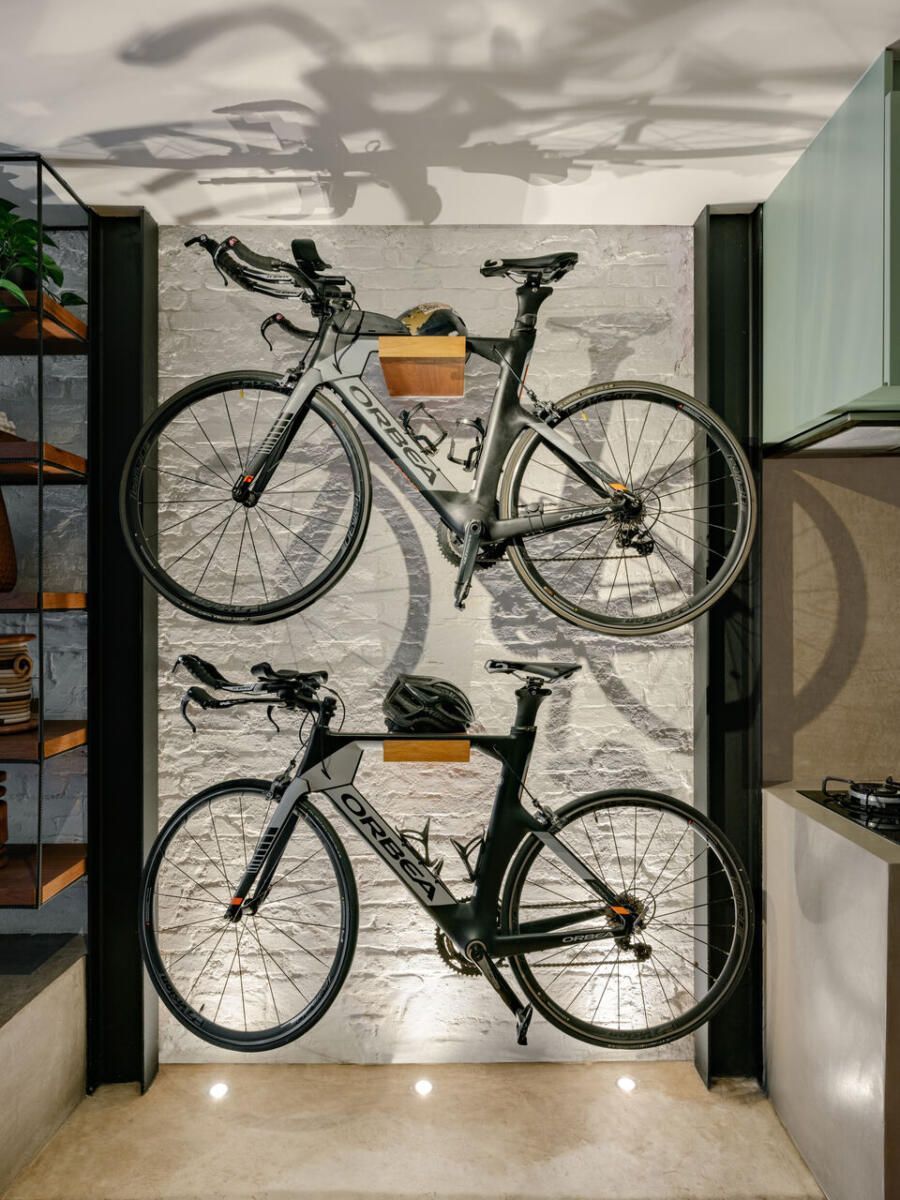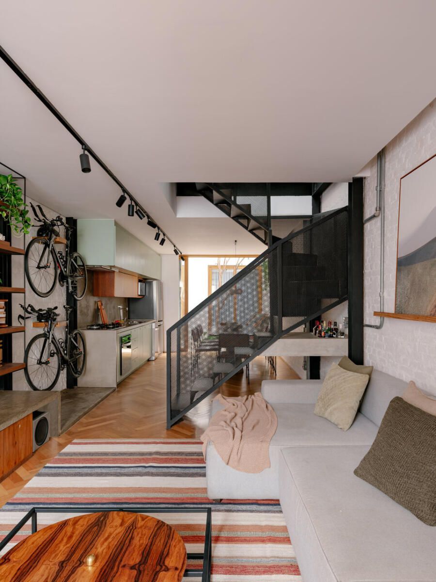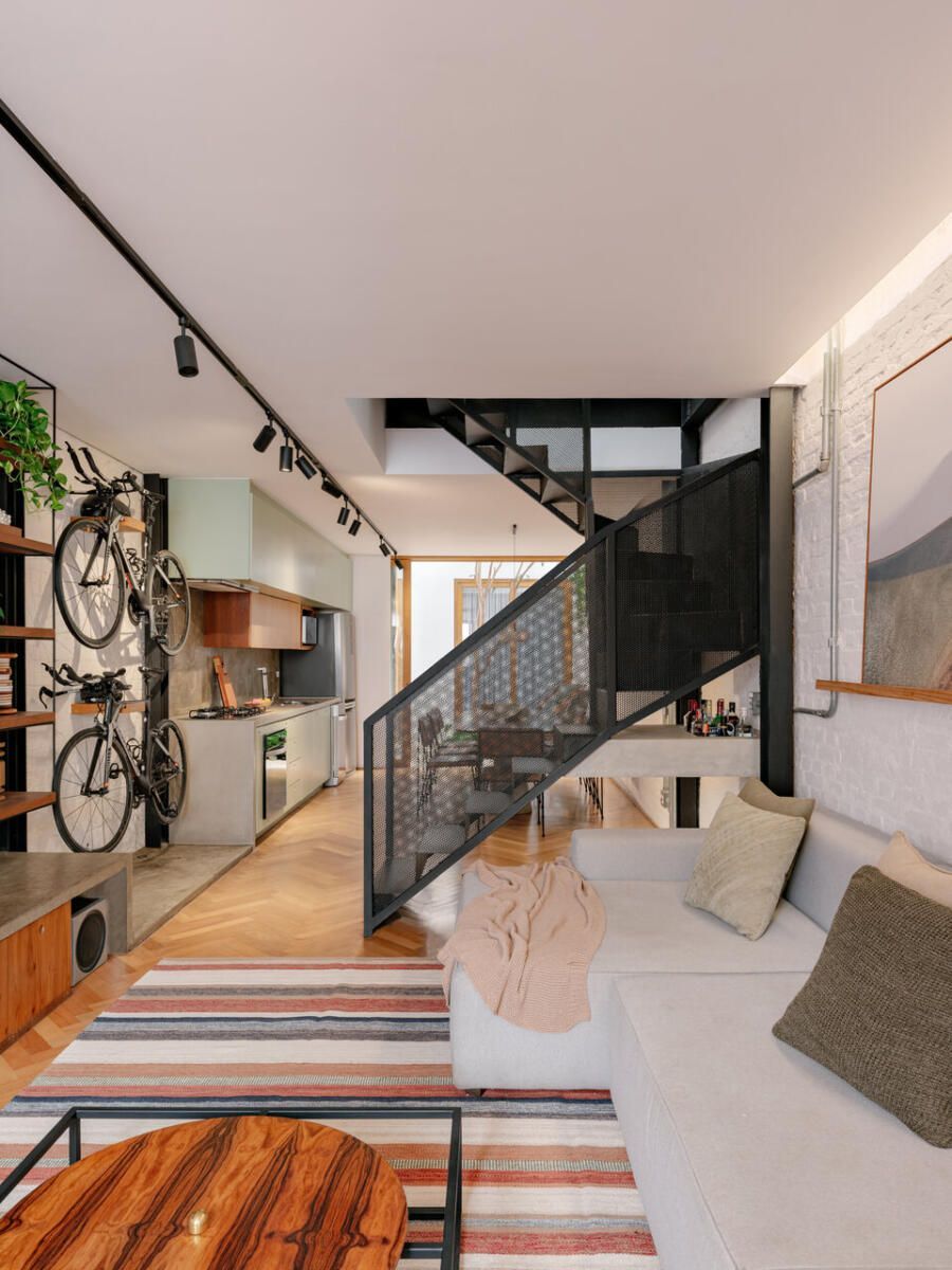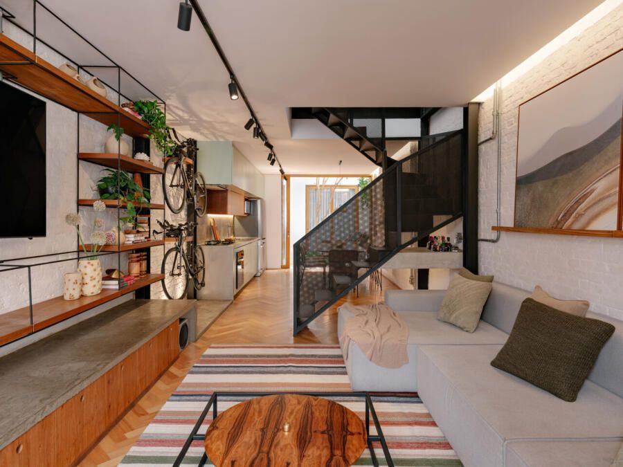 Com a chegada do primeiro bebê, a decisão foi imediata: demolir tudo e erguer uma casa completamente nova. A arquiteta Mona Singal, do escritório RUA 141 Arquitetura e Design, foi chamada para conduzir o projeto, onde a arquitetura industrial se transformou no fio condutor. Em um terreno estreito de 4×18 metros, o desafio era criar uma residência acolhedora, permeada pela natureza e com espaços amplos o suficiente para abrigar o estilo de vida ativo dos moradores e suas cinco bicicletas, que precisavam ocupar lugar de destaque no layout.