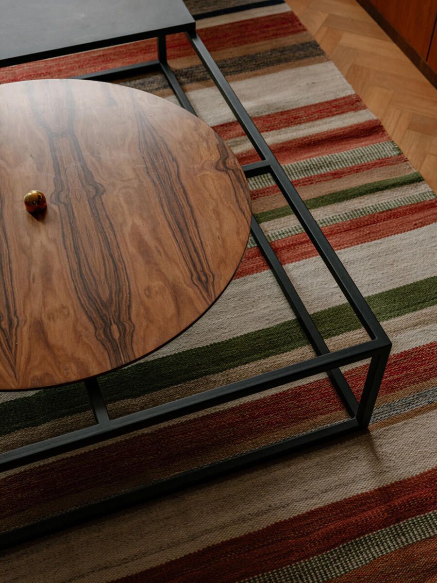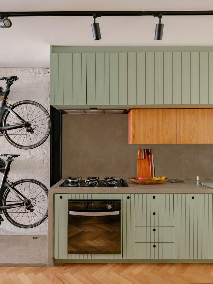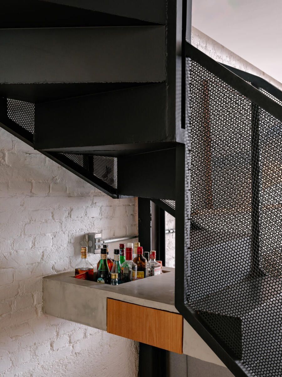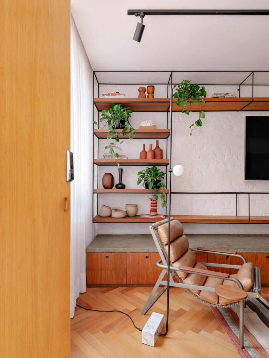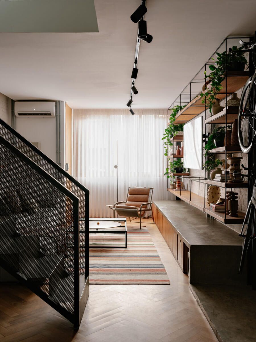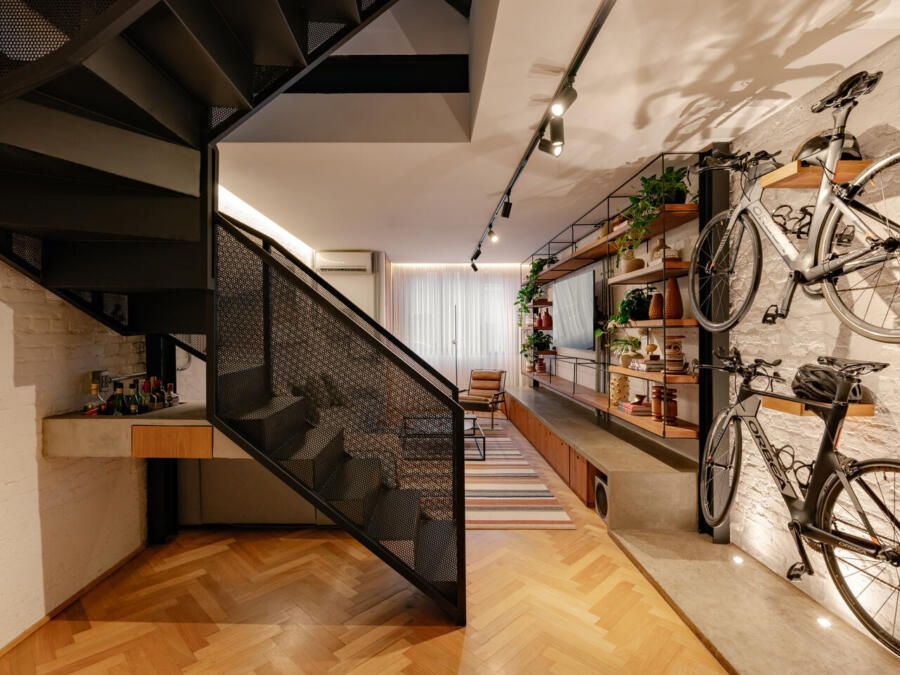 Um dos gestos mais emblemáticos do projeto é a estante de concreto que percorre o térreo. Ela nasce como banco no living, segue como prateleiras em vergalhão, delimita o espaço para duas das bicicletas do casal e termina como bancada de trabalho da cozinha, um desenho contínuo que sintetiza a funcionalidade e a estética industrial desejada pelos moradores. A escada metálica em chapa dobrada, com guarda-corpo perfurado, reforça esse repertório visual, enquanto o piso de madeira tauari em espinha de peixe e os caixilhos de freijó aquecem o conjunto.