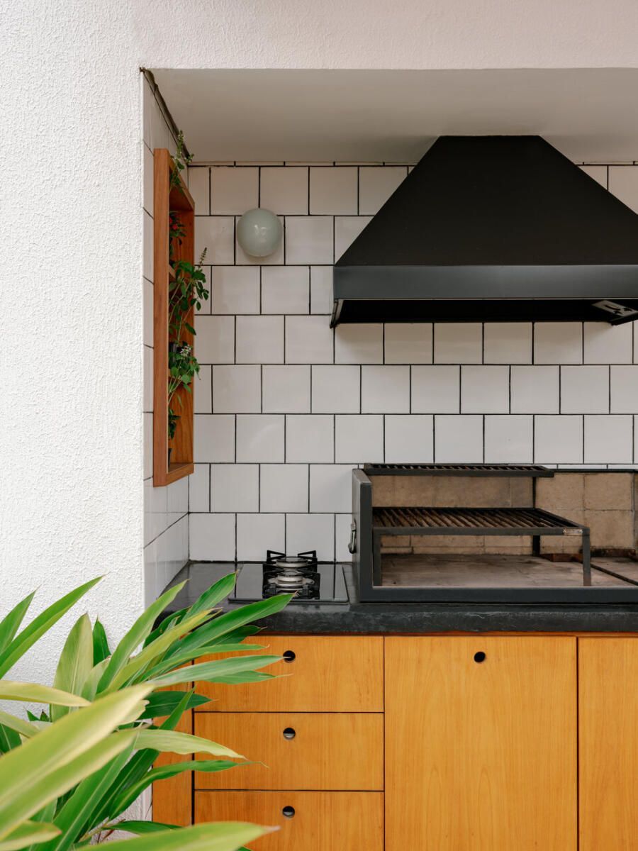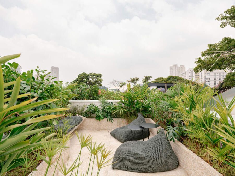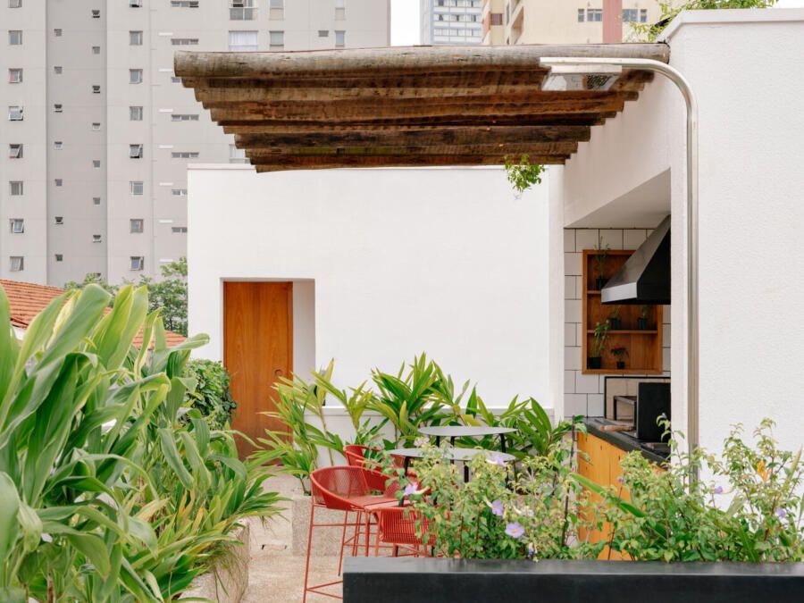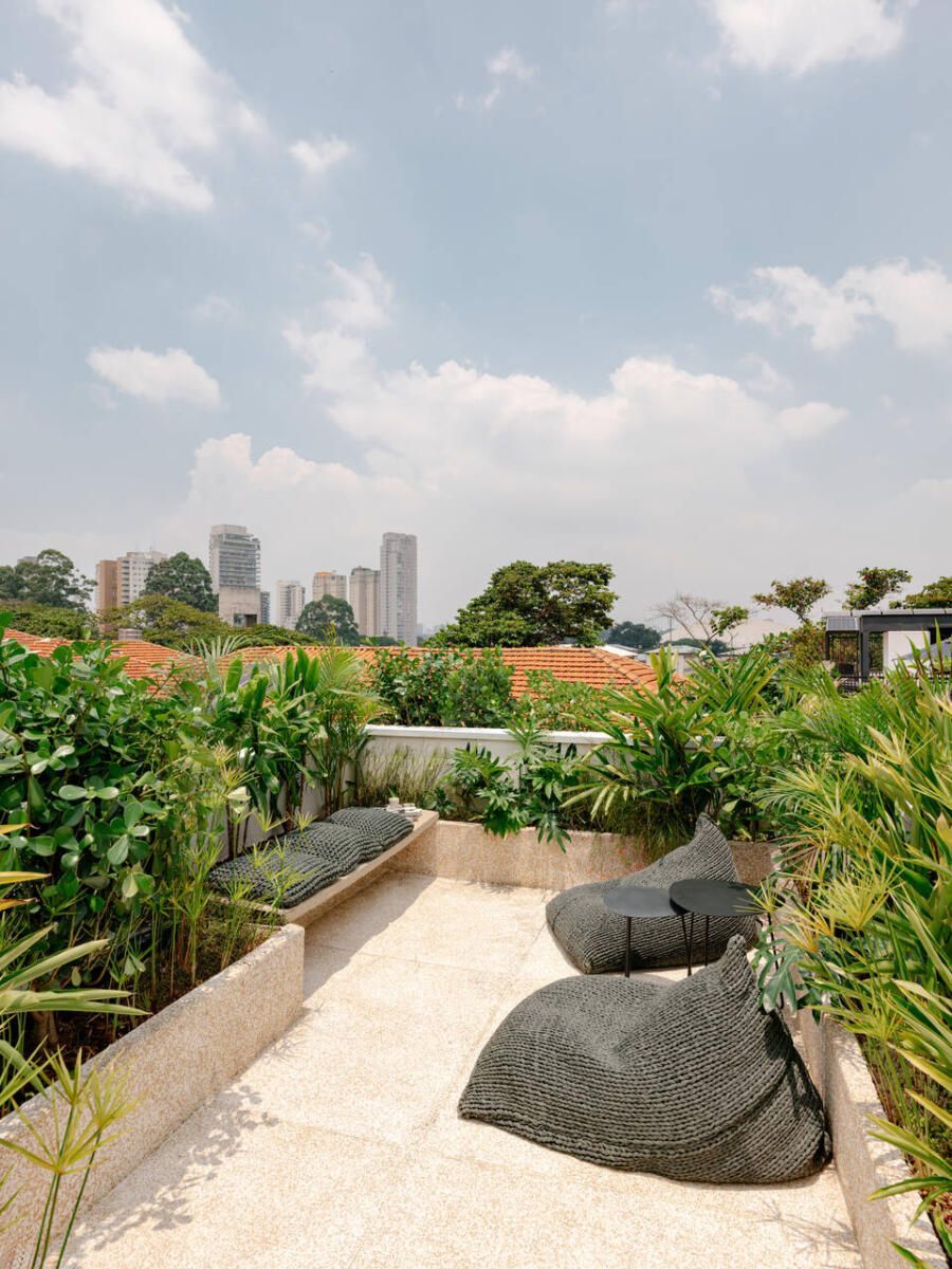 O percurso termina no rooftop, considerado pelos moradores uma extensão essencial do dia a dia. O terraço abriga área gourmet, estar ao ar livre com pufes aconchegantes e um cinturão de floreiras que cria privacidade e aproxima a família da natureza. É um pequeno refúgio urbano, onde se respira com leveza e o espírito da arquitetura industrial encontra sua versão mais solar.