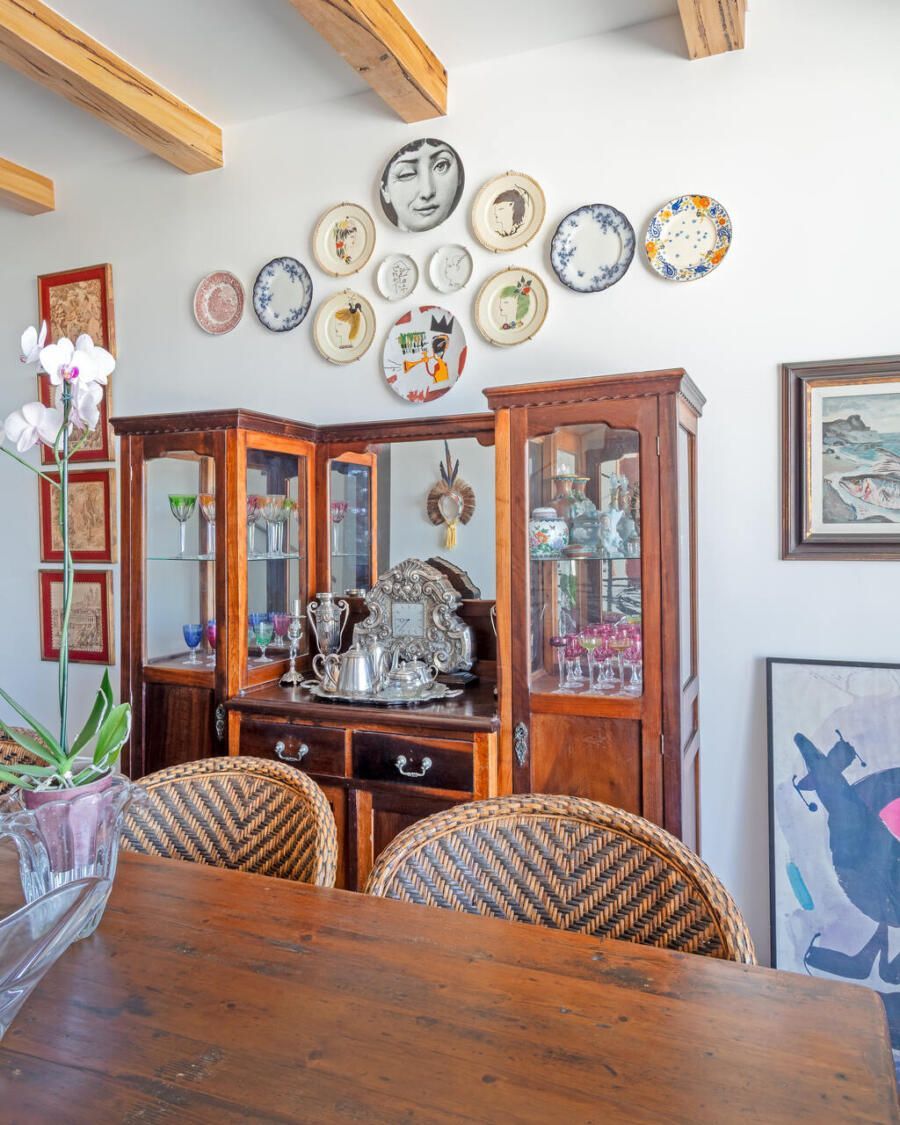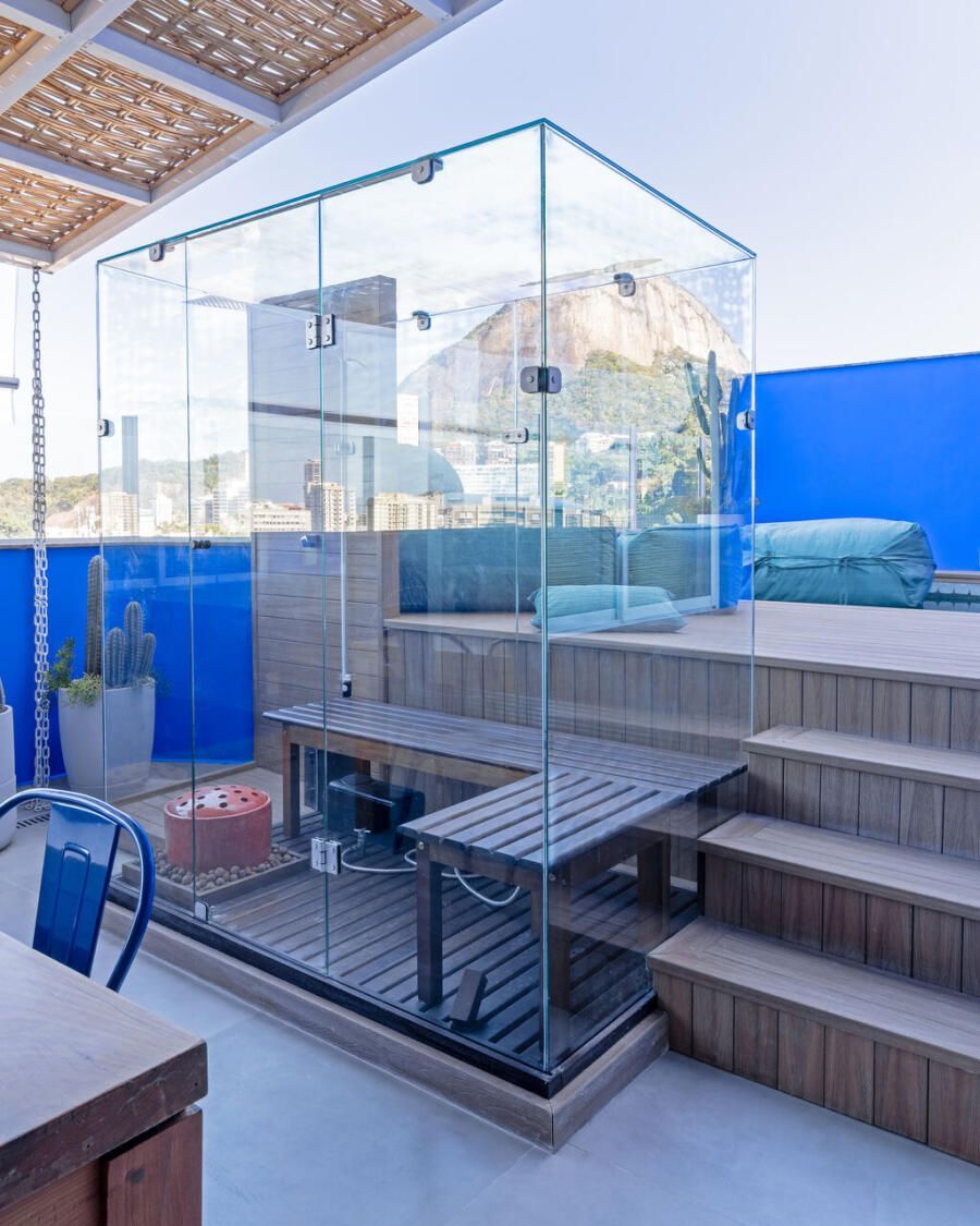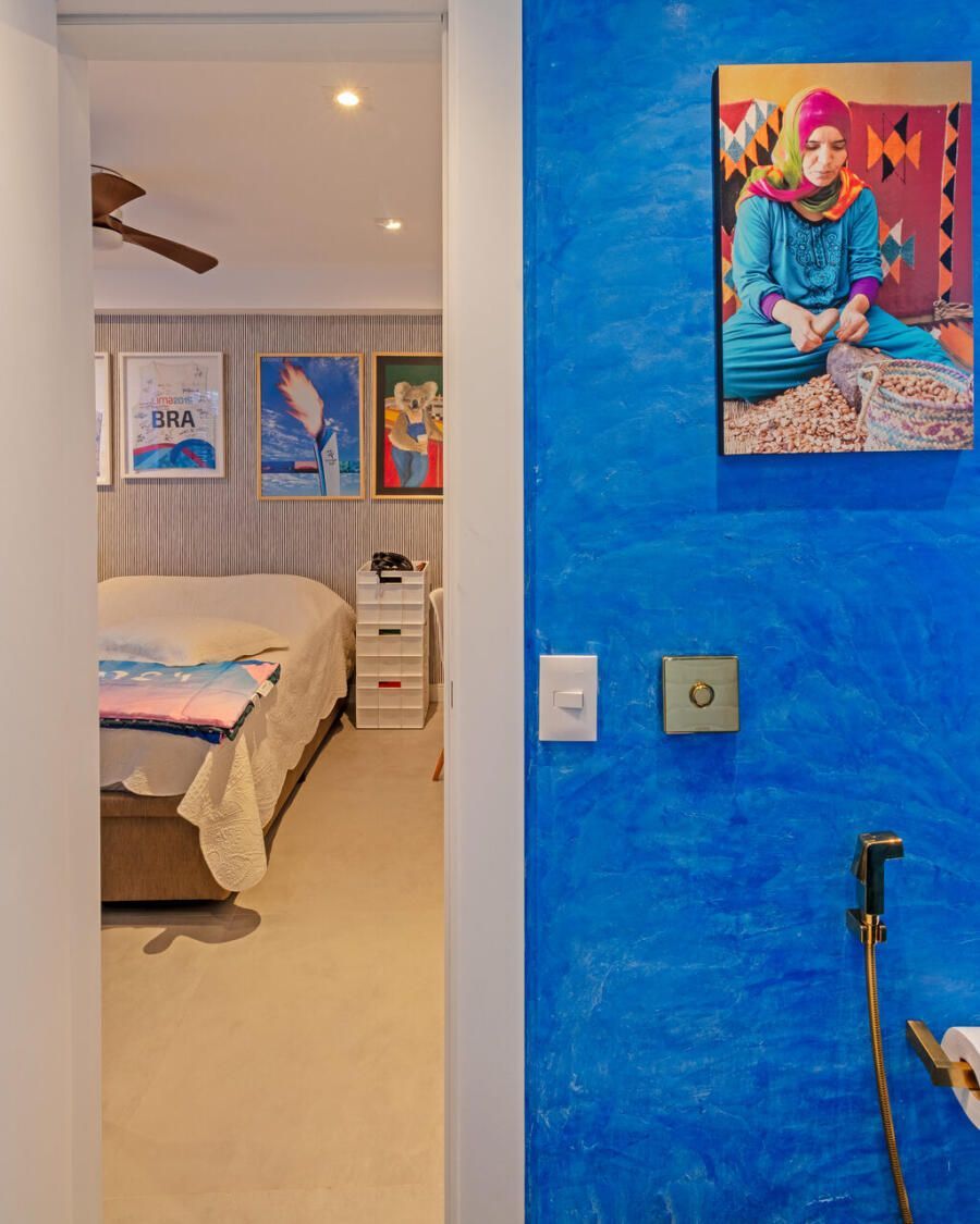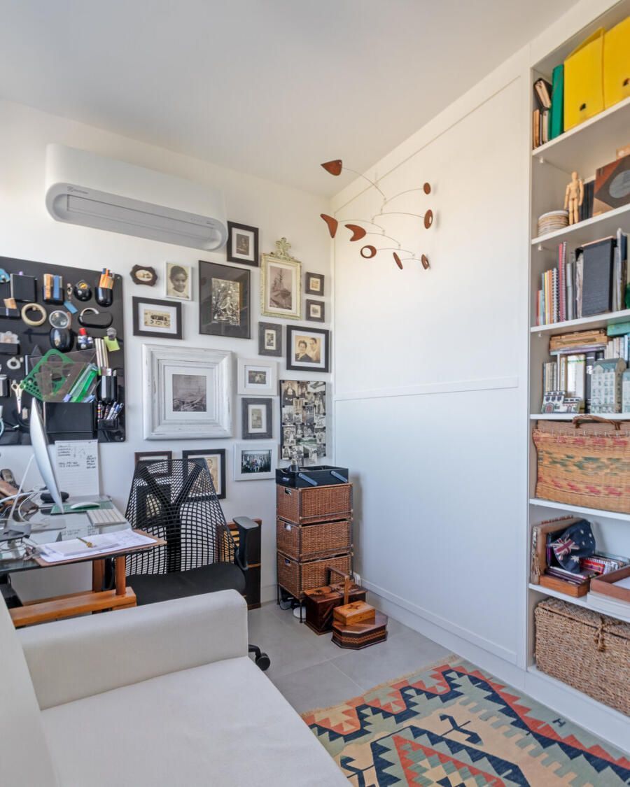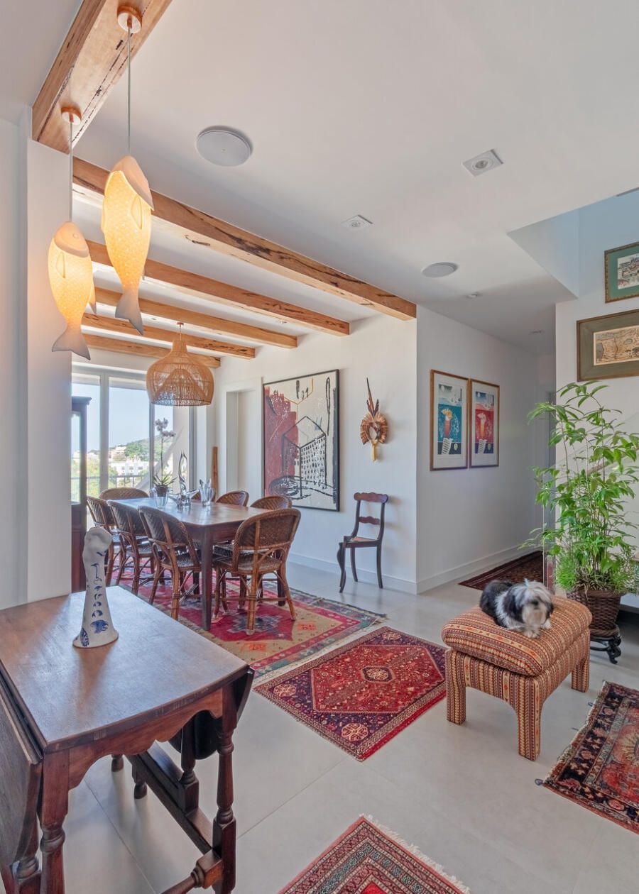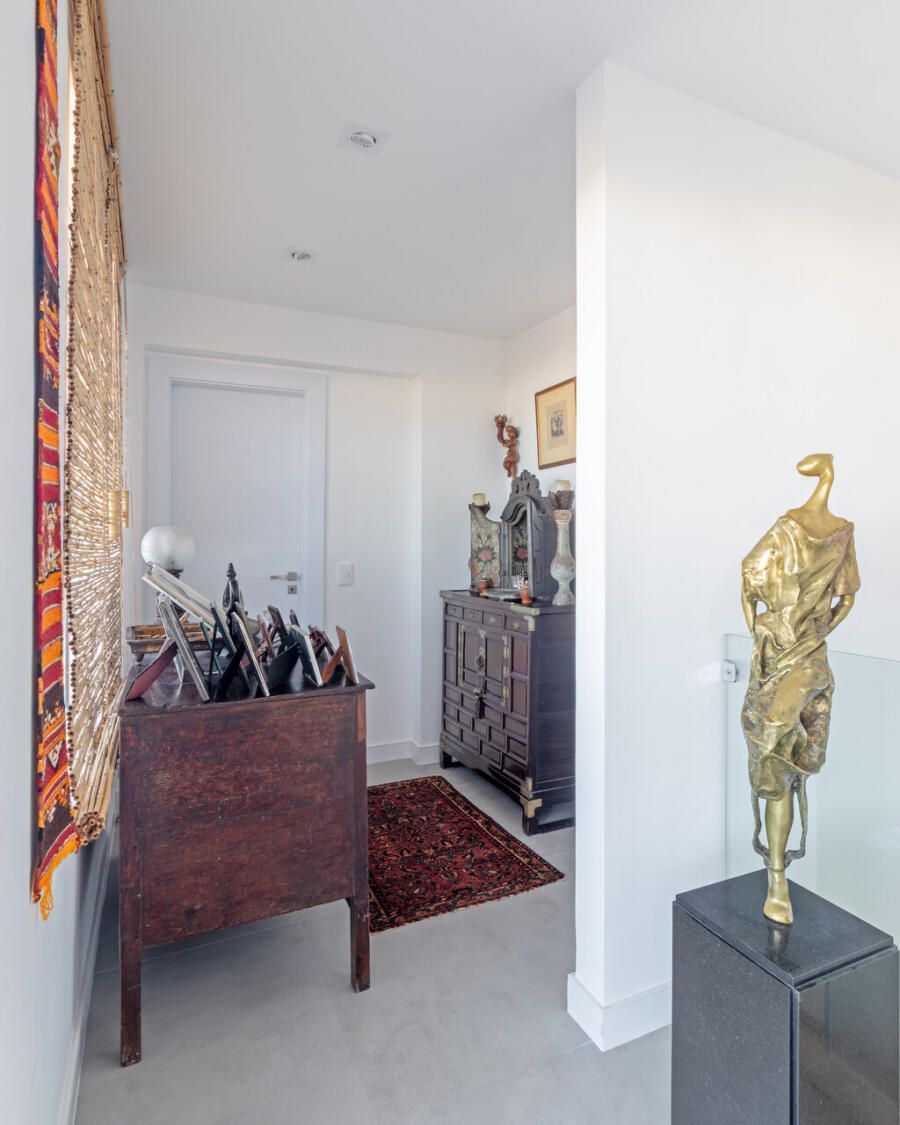 A arquiteta desenhou pessoalmente cada centímetro da nova cobertura duplex, carinhosamente apelidada de “coberturinha”. A intenção era ambiciosa: integrar na metragem enxuta de 155 m² tudo o que fazia parte de sua vida anterior — móveis, quadros, estantes, tapetes e peças de história — e ainda incorporar desejos antigos, como a sauna, a área gourmet e os ambientes criados sob medida para receber amigos e familiares. Entre as lembranças afetivas, objetos garimpados em viagens e relíquias de família garantem uma identidade singular ao projeto.