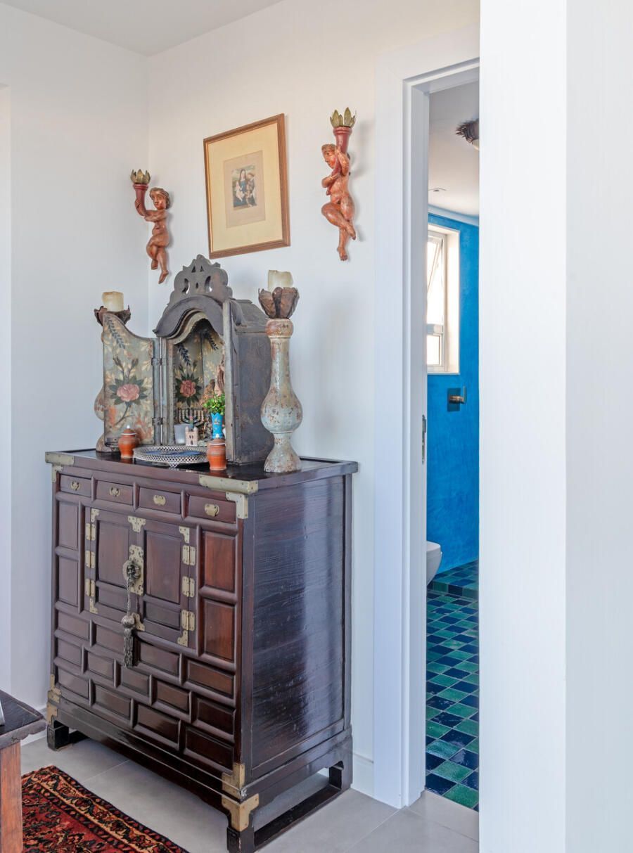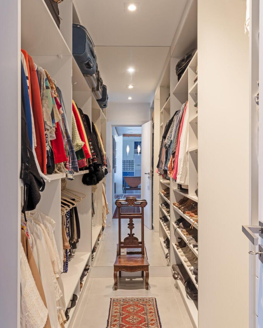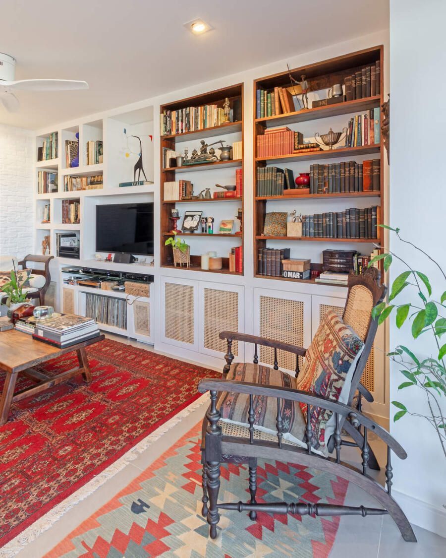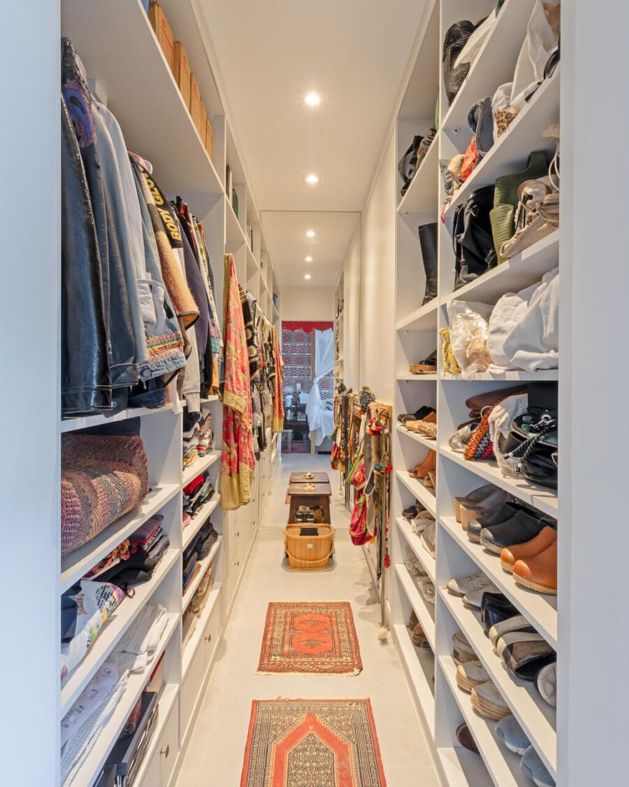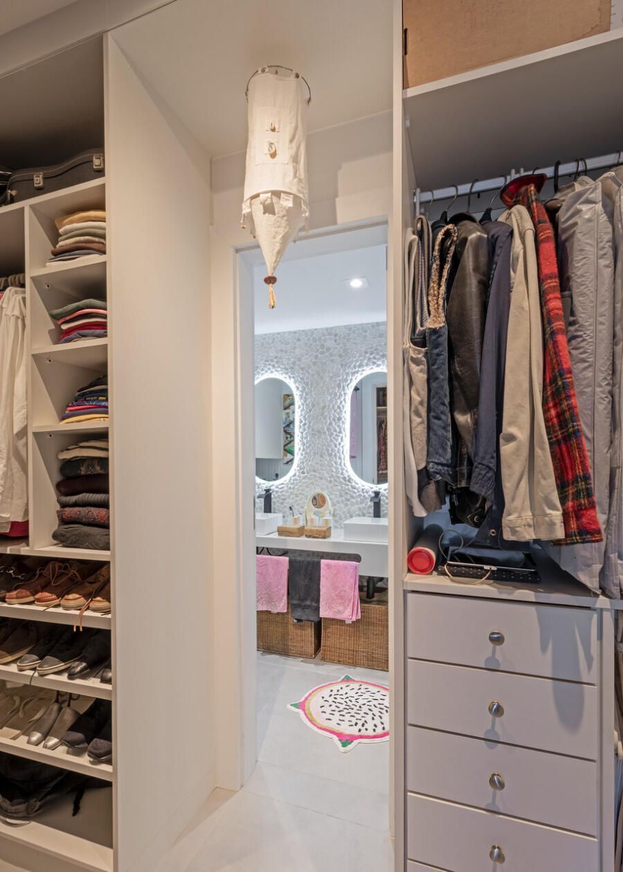 A arquiteta desenhou pessoalmente cada centímetro da nova cobertura duplex, carinhosamente apelidada de “coberturinha”. A intenção era ambiciosa: integrar na metragem enxuta de 155 m² tudo o que fazia parte de sua vida anterior — móveis, quadros, estantes, tapetes e peças de história — e ainda incorporar desejos antigos, como a sauna, a área gourmet e os ambientes criados sob medida para receber amigos e familiares. Entre as lembranças afetivas, objetos garimpados em viagens e relíquias de família garantem uma identidade singular ao projeto.
