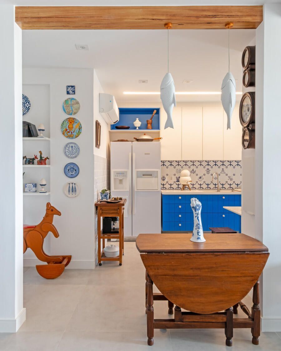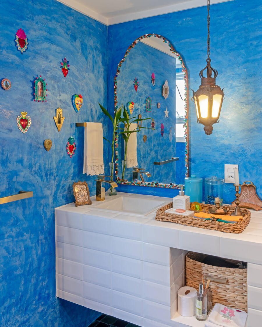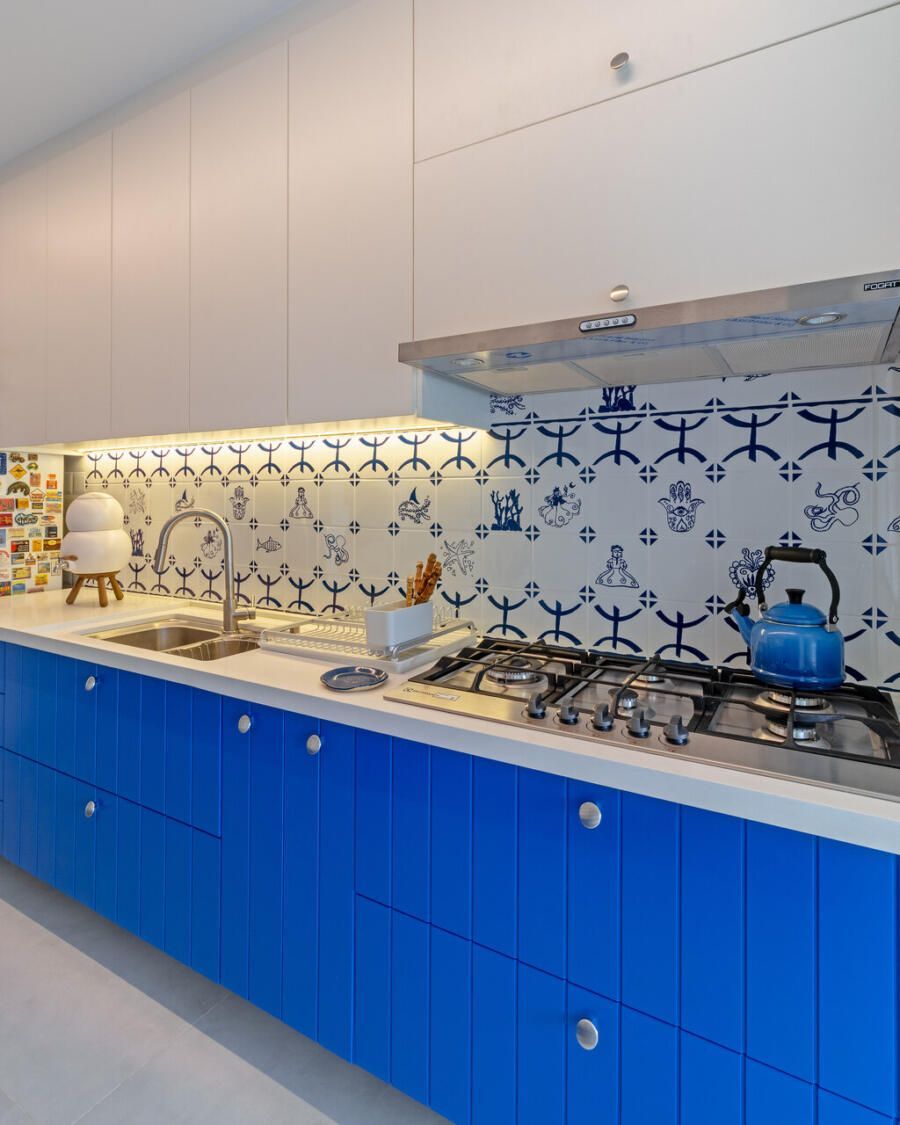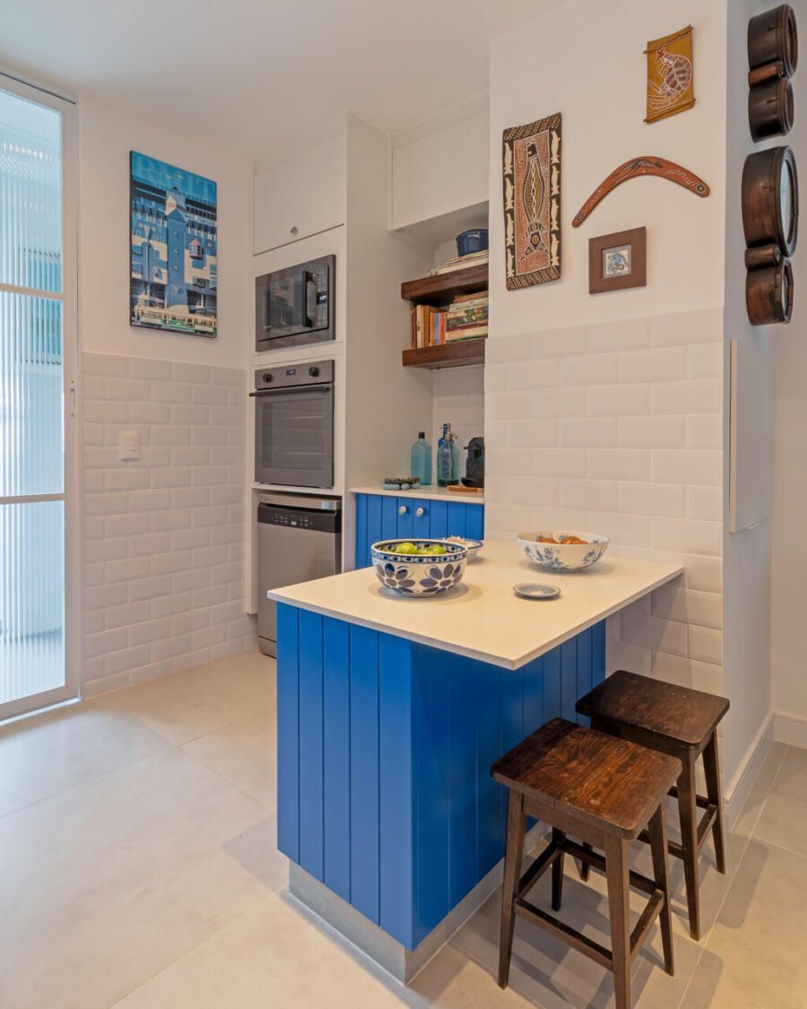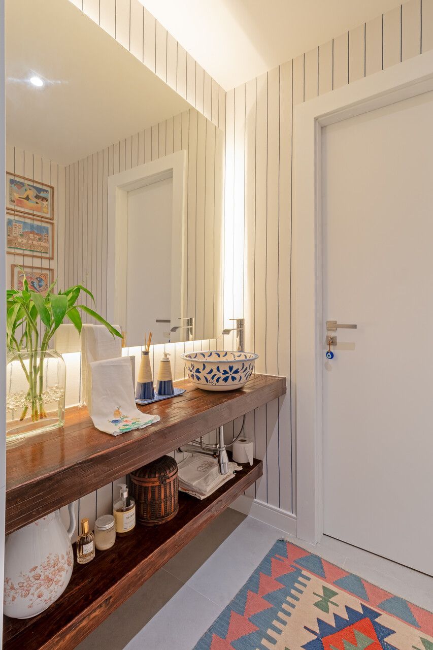 Os pedidos da família eram precisos e ditaram o desenho final do lar: home office funcional, uma mini sauna entre a área gourmet e a piscina, muitos armários, ampliação da área de serviço para acomodar também o “banheiro” da mascote Frida Kahlo, além do reaproveitamento total do mobiliário existente. Nada poderia ser desperdiçado, e esse norte colaborou para um resultado autoral, cheio de camadas afetivas e soluções inteligentes.