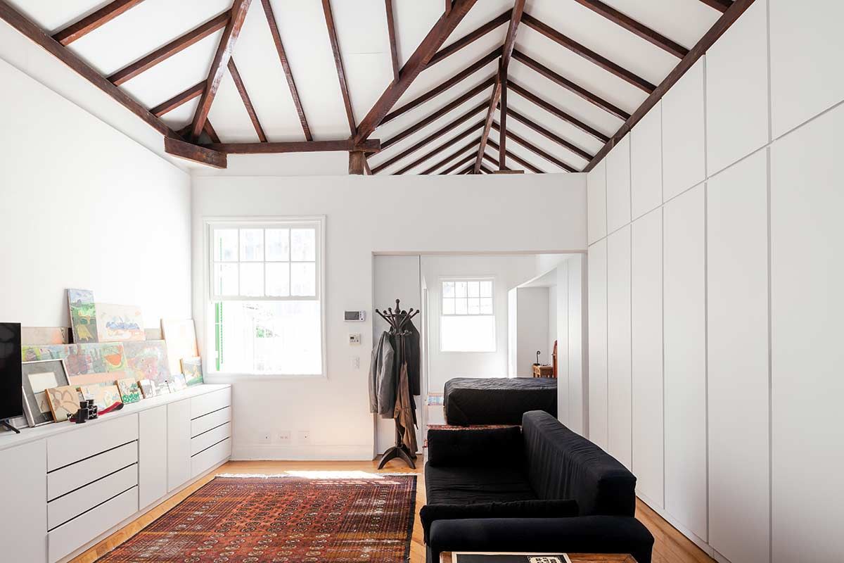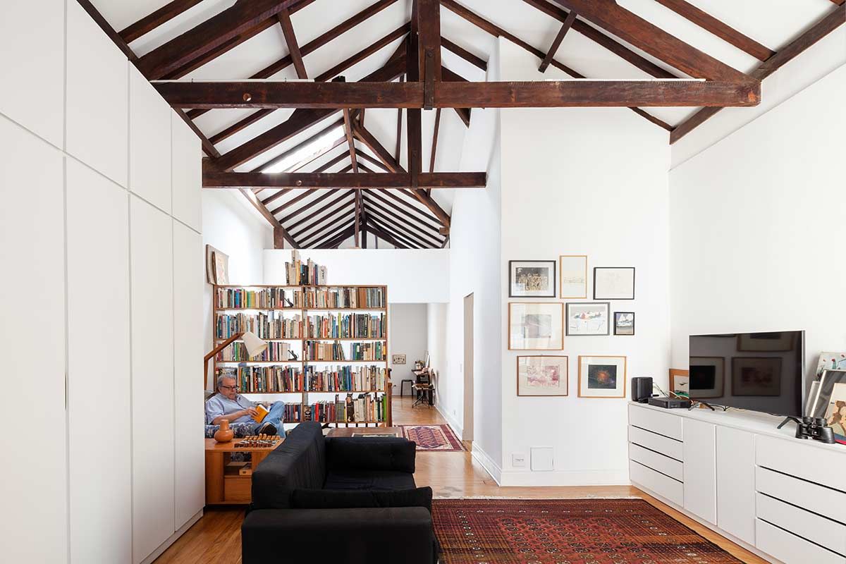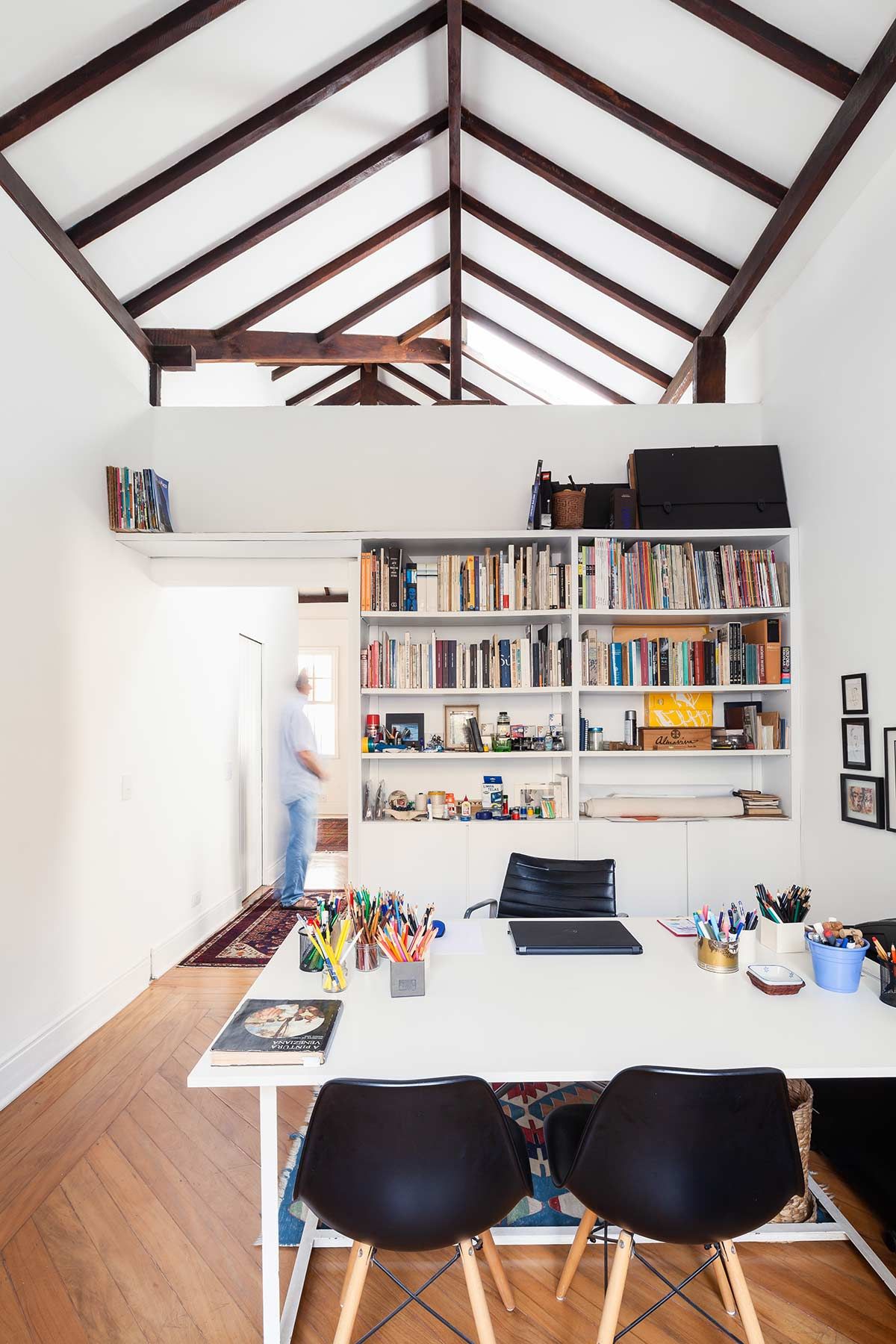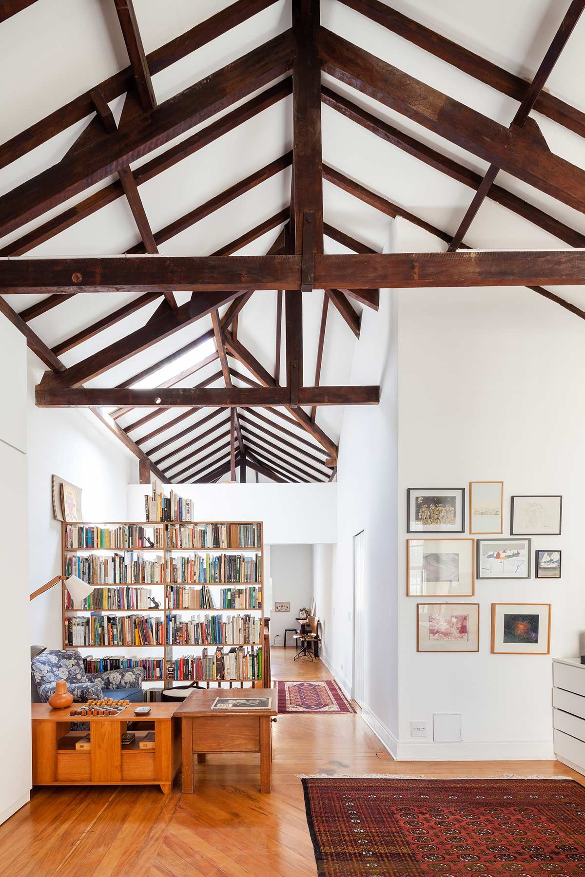 Mesmo tombada, as restrições desta condição foram libertadoras e o norte do projeto foi eliminar tudo o que não era essencial. No nível superior, por exemplo, havia um forro de estuque e outro de drywall e, ao retirá-los, uma linda estrutura centenária de madeira se revelou.