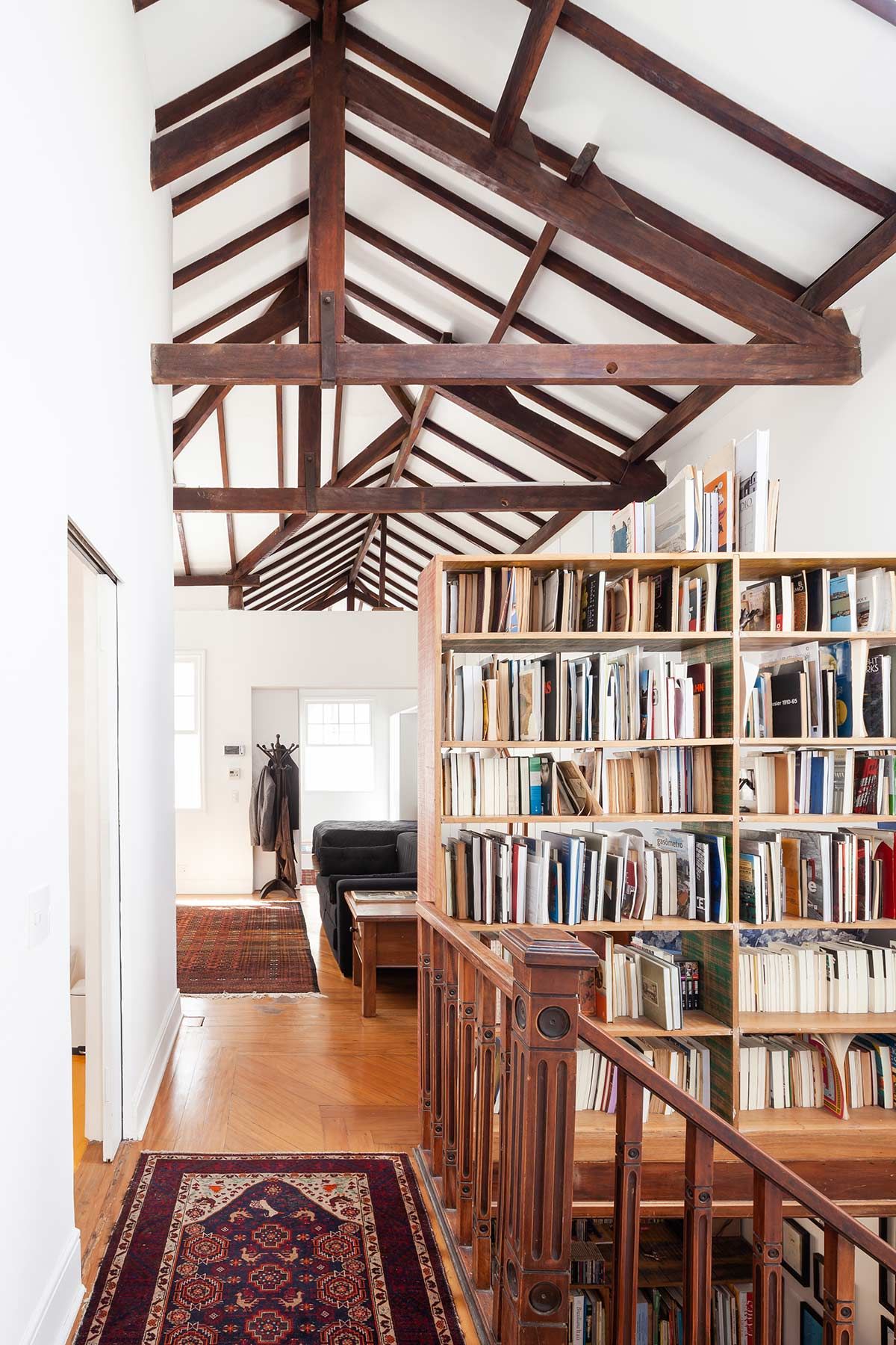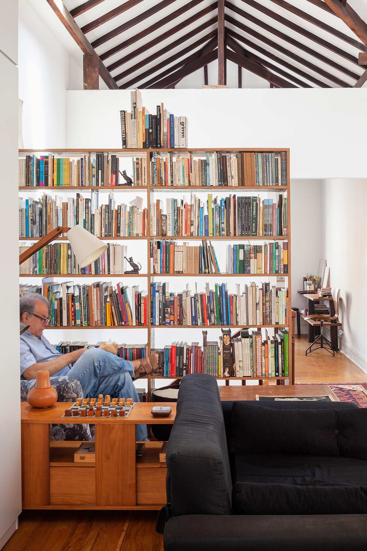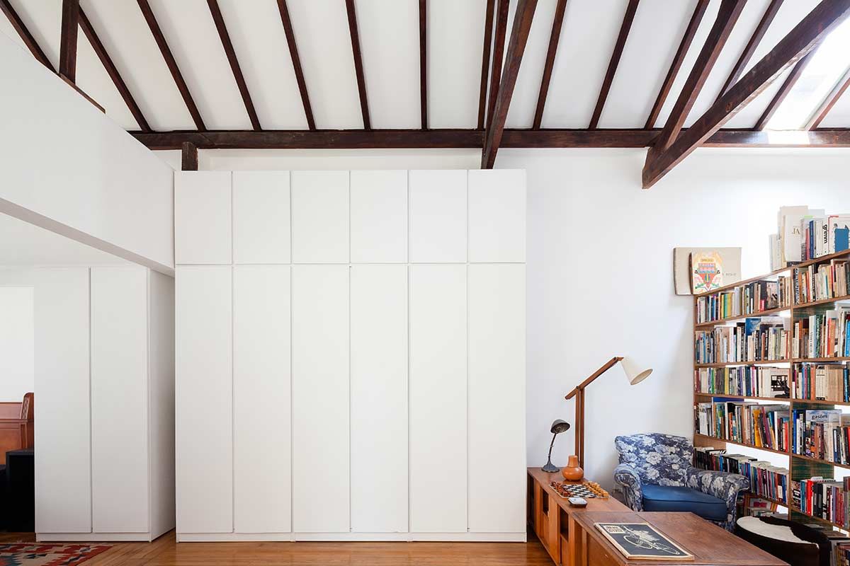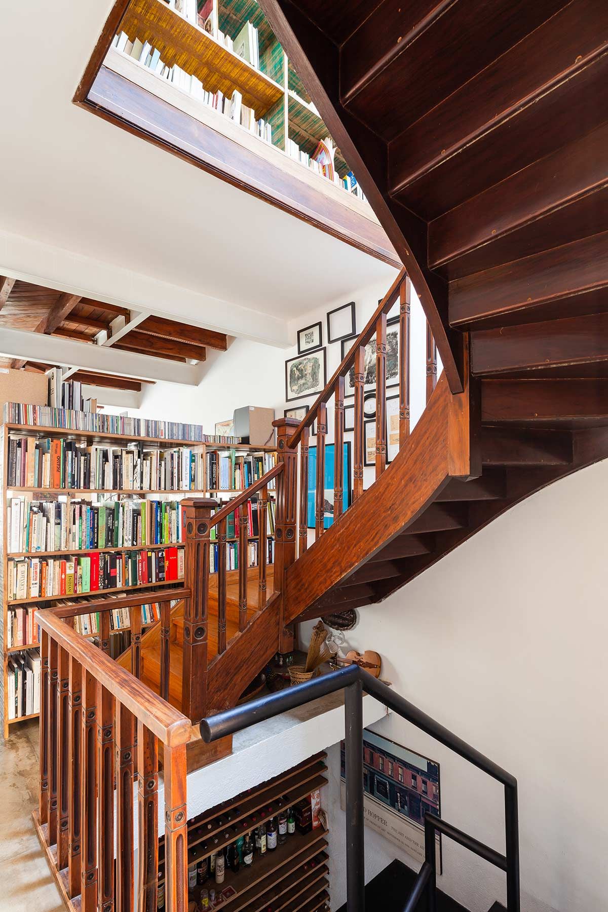 Mesmo tombada, as restrições desta condição foram libertadoras e o norte do projeto foi eliminar tudo o que não era essencial. No nível superior, por exemplo, havia um forro de estuque e outro de drywall e, ao retirá-los, uma linda estrutura centenária de madeira se revelou.